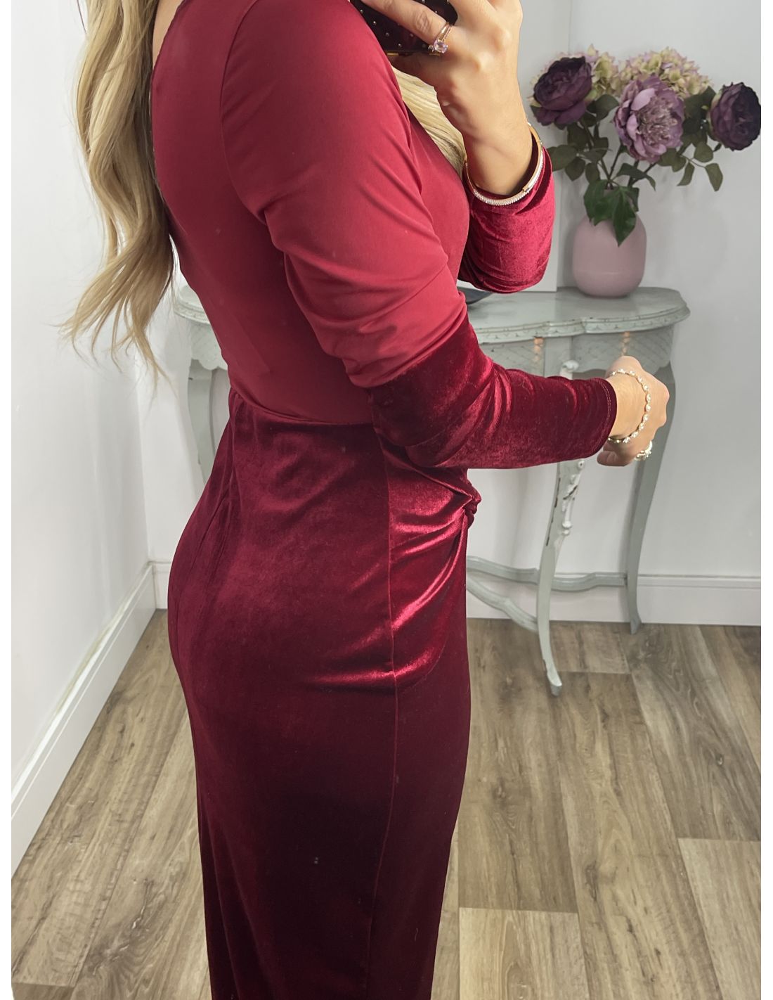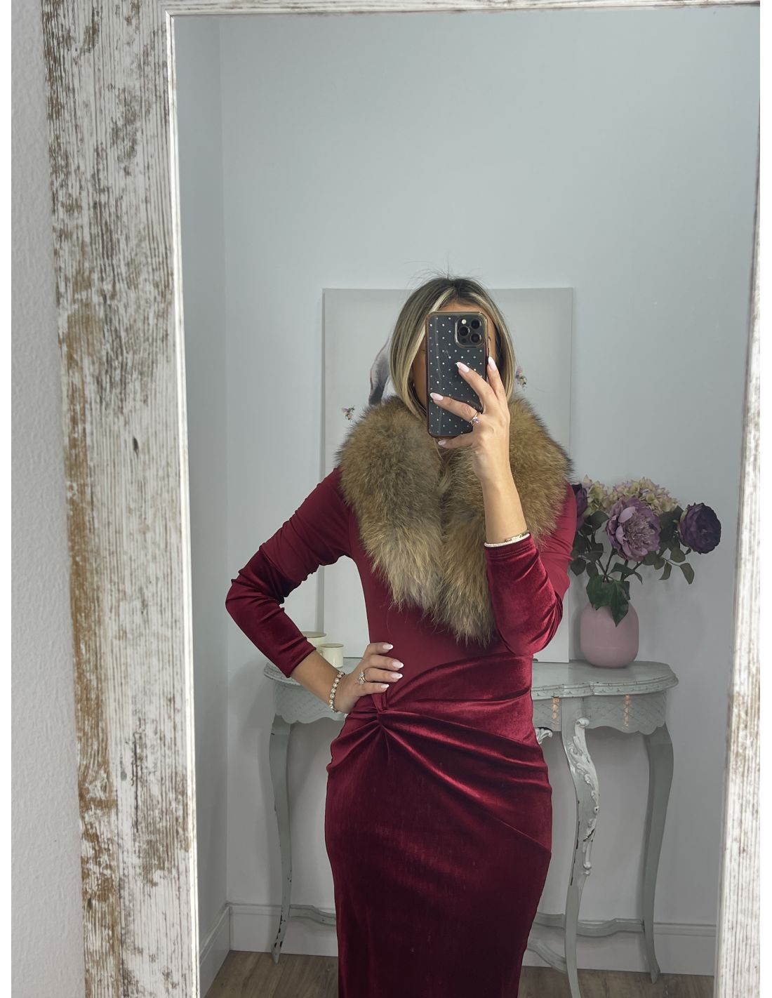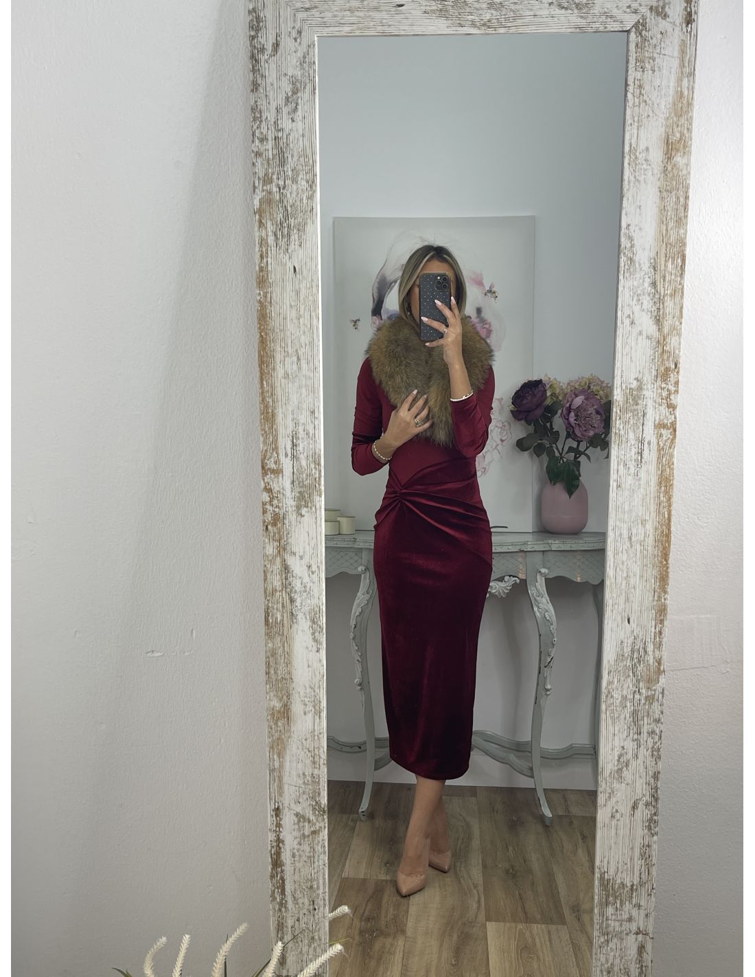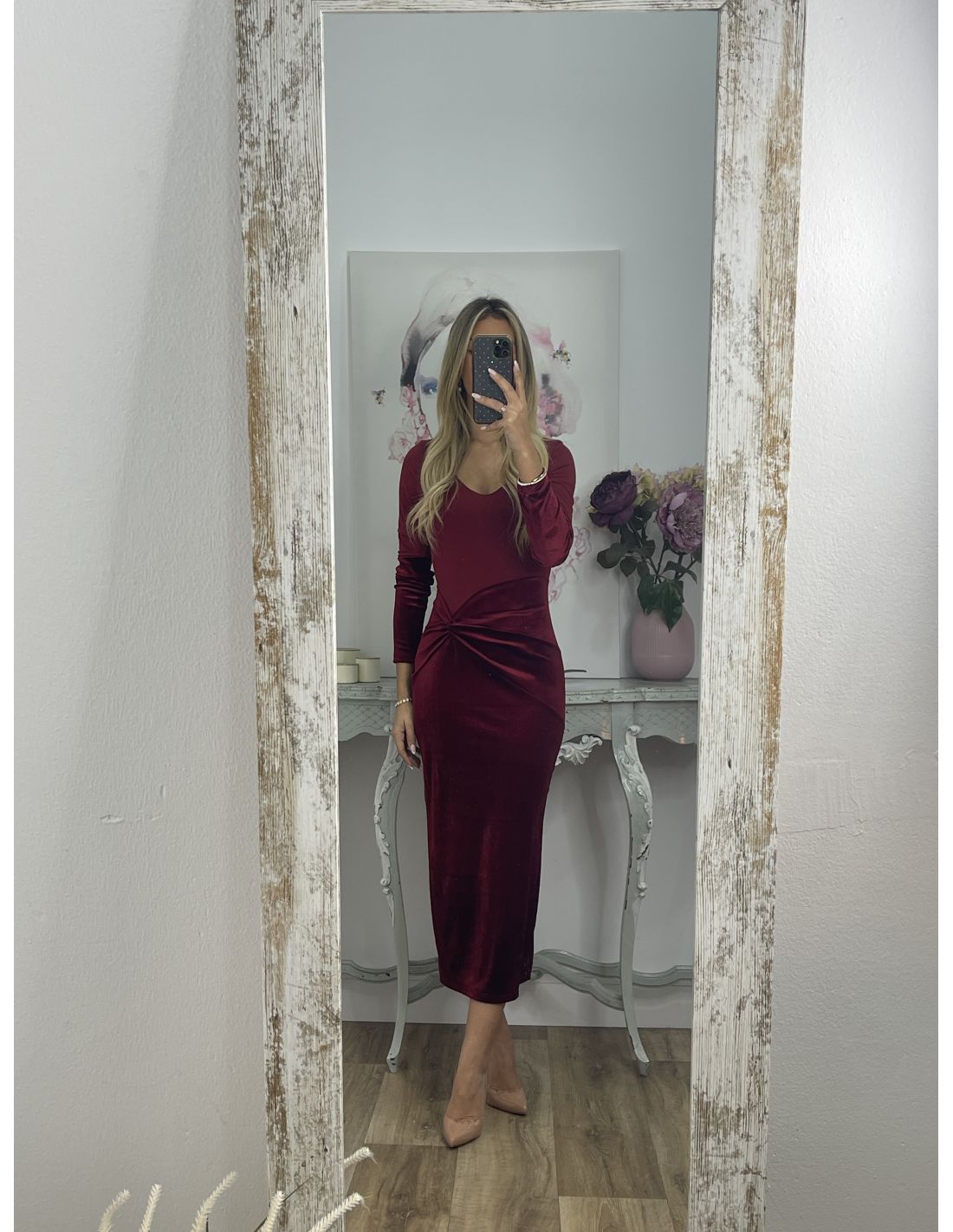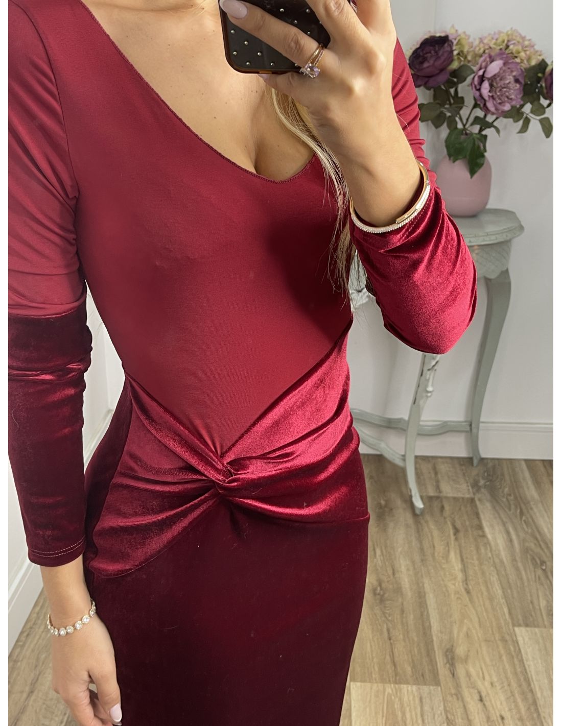 Vestido que combina dos tejidos en la parte de arriba es de punto y la zona de abajo es de terciopelo. El corte del vestido es ajustado.