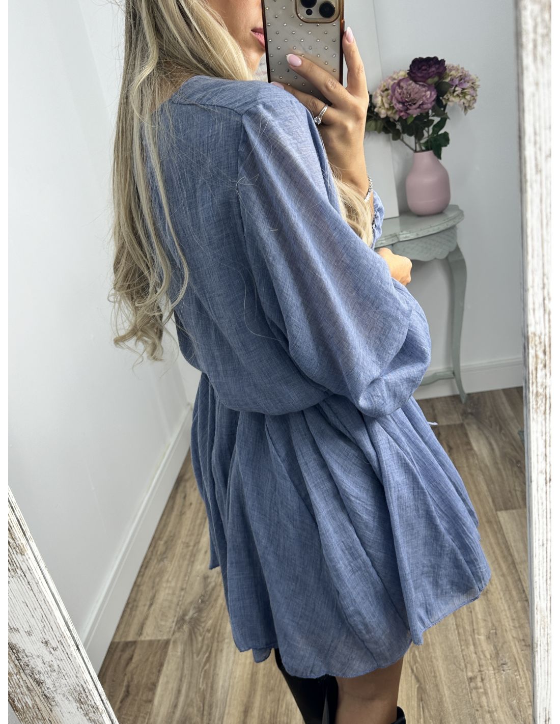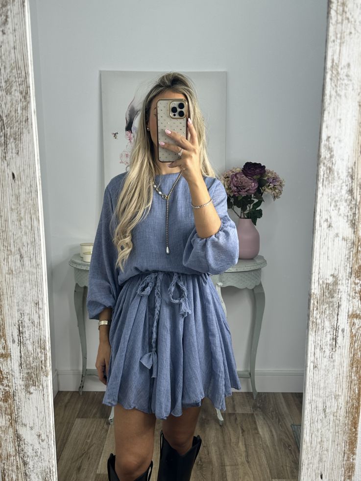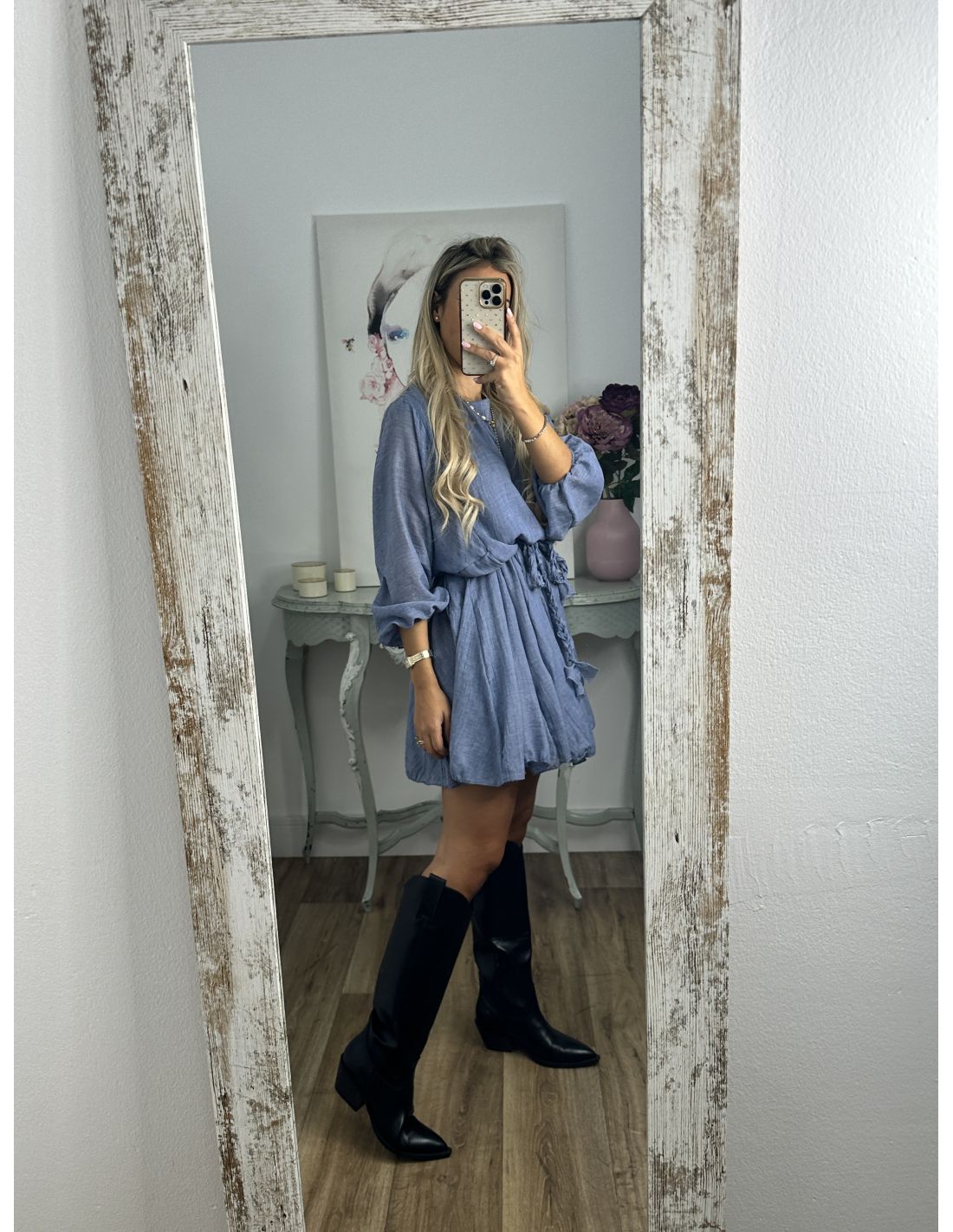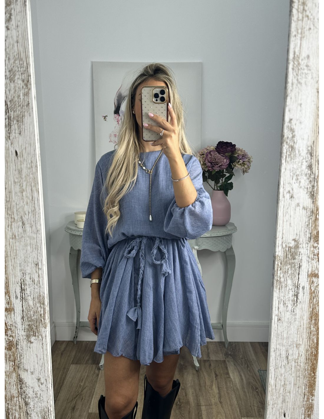 Vestido con cuello a la cajade Cortes suelto. La zona de la manga llevado volante.La zona de la falda del vestido es de neja y trae un cinturón del mismo tejido. El vestido va forrado de las mangas.