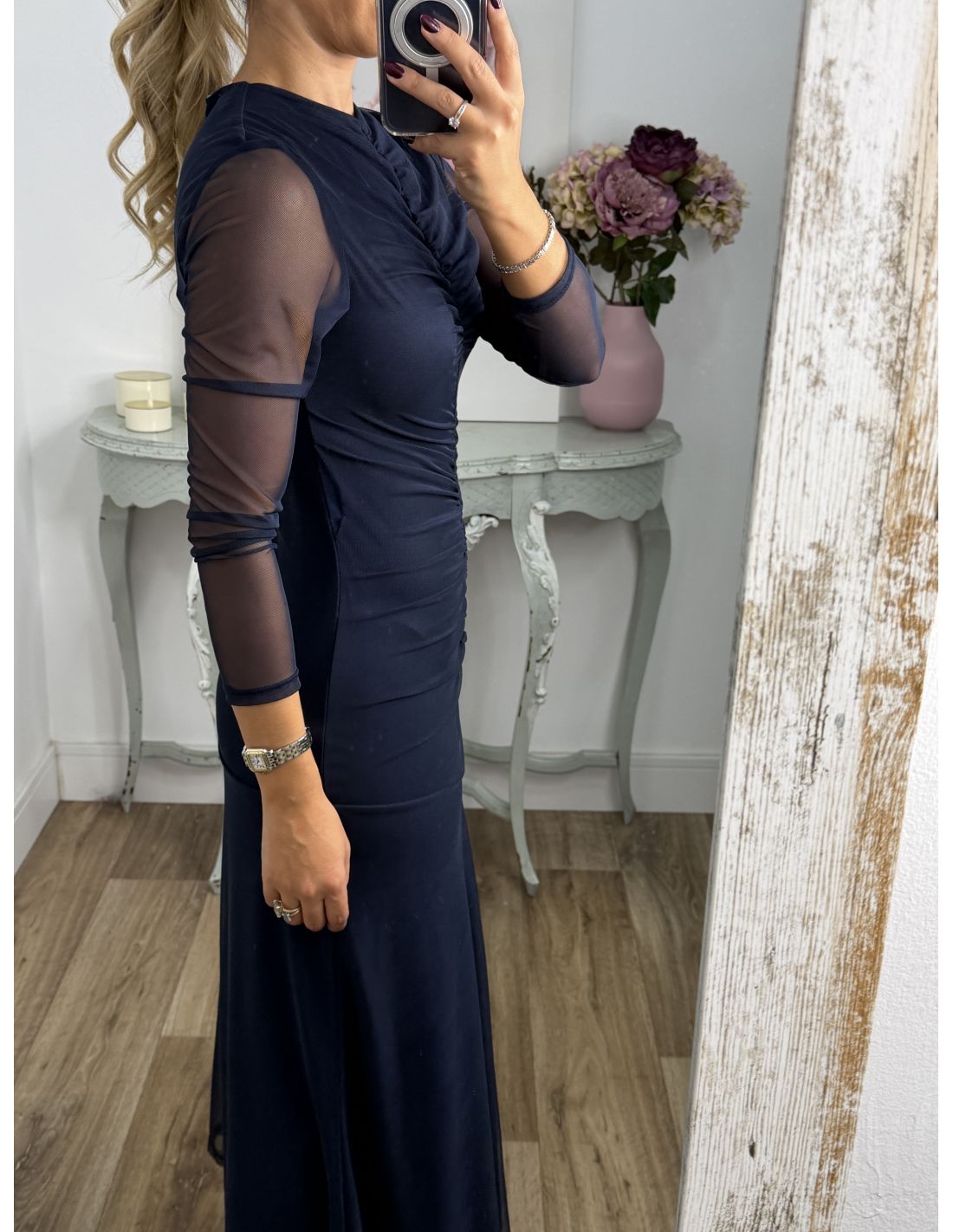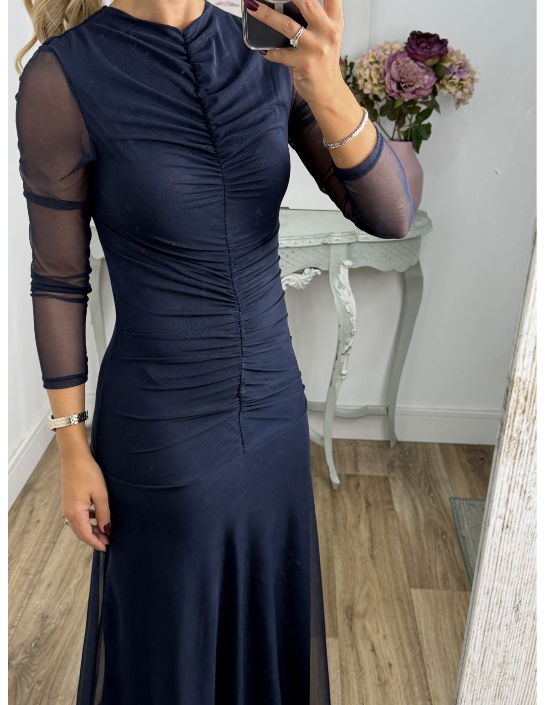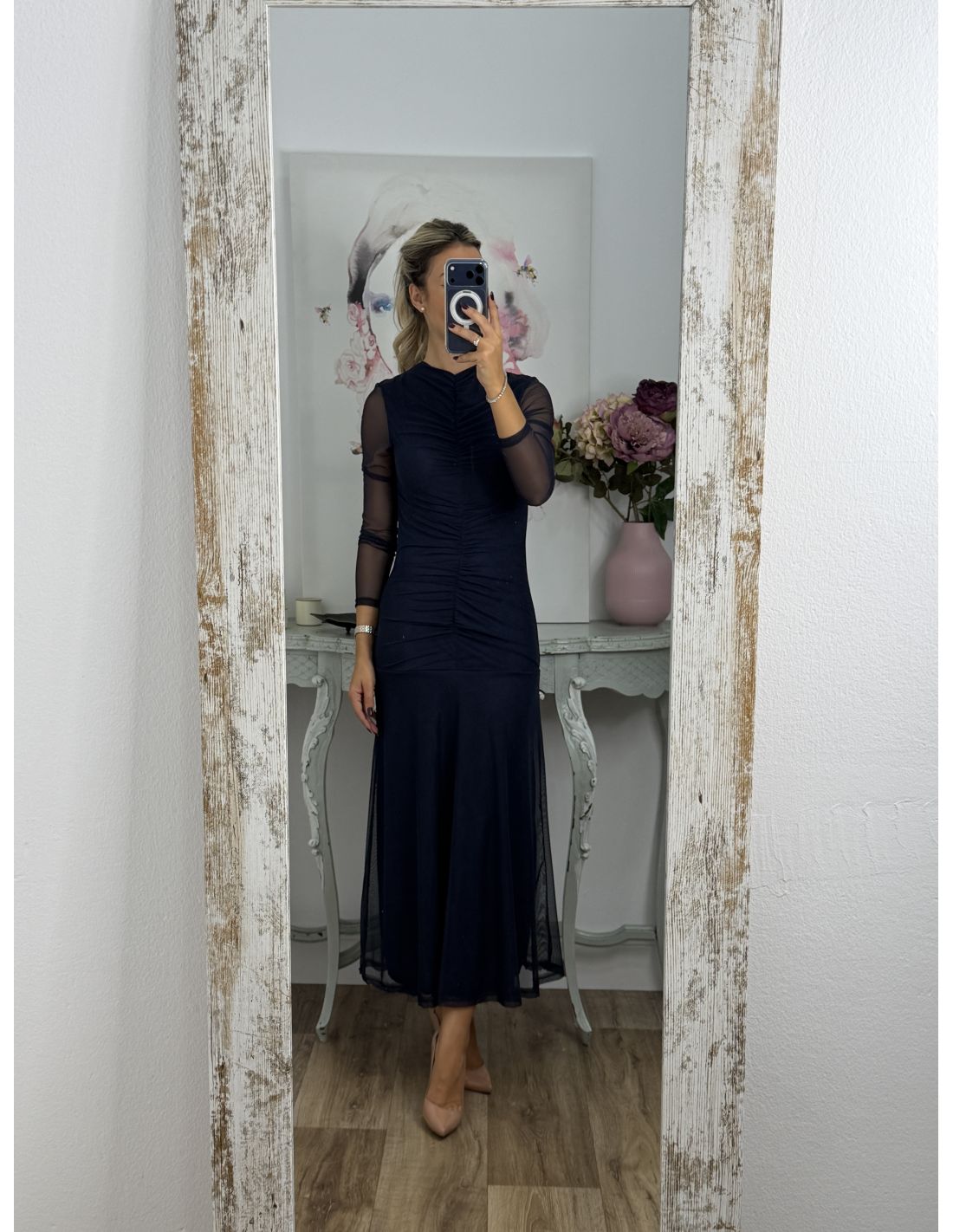 Vestido del tul de cuello a la caja y de corta ajustada hasta la zona de la cadera. Va forrado de un tejido de punto, a excepción de las mangas.