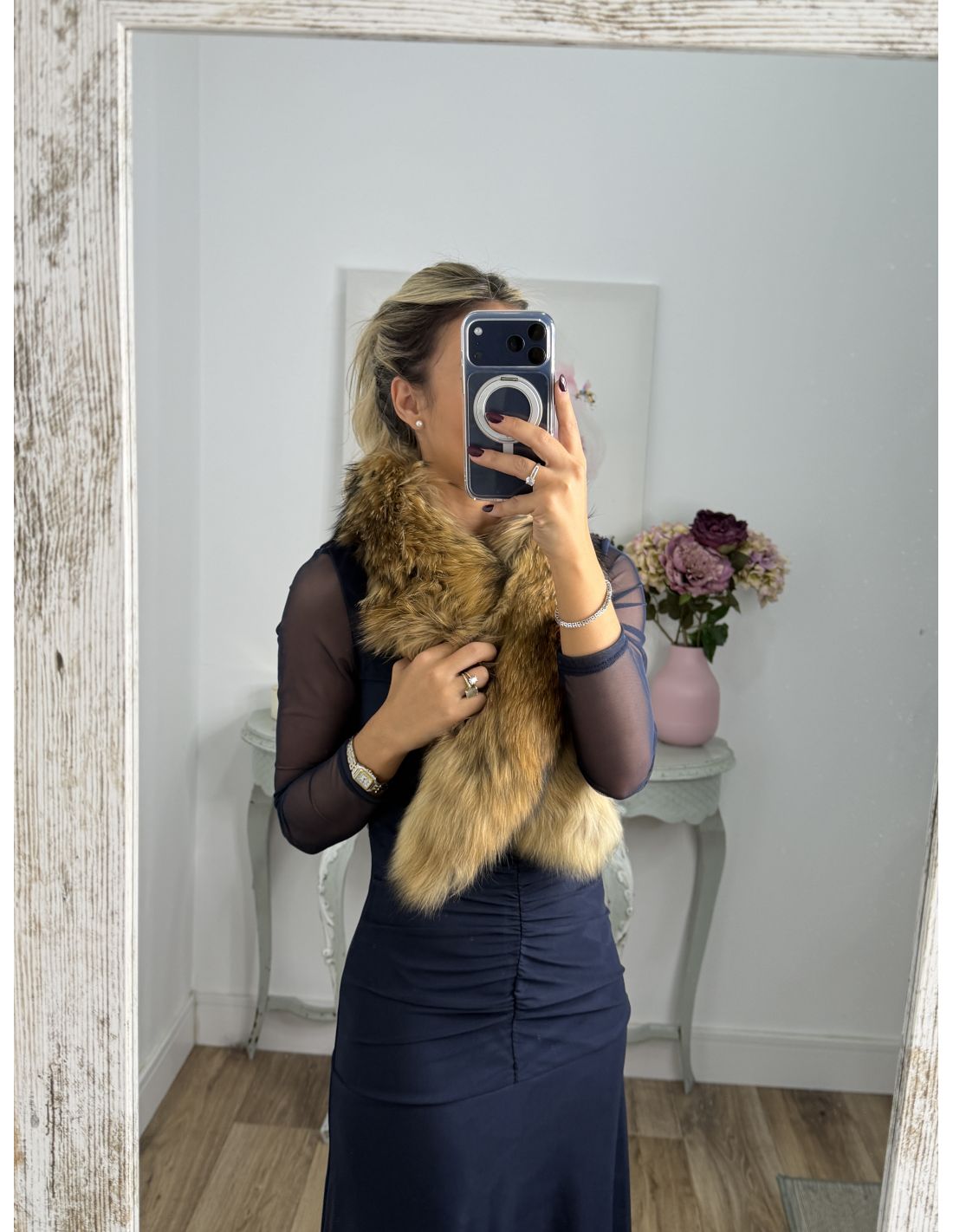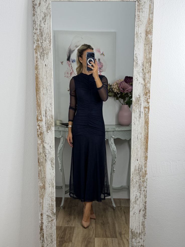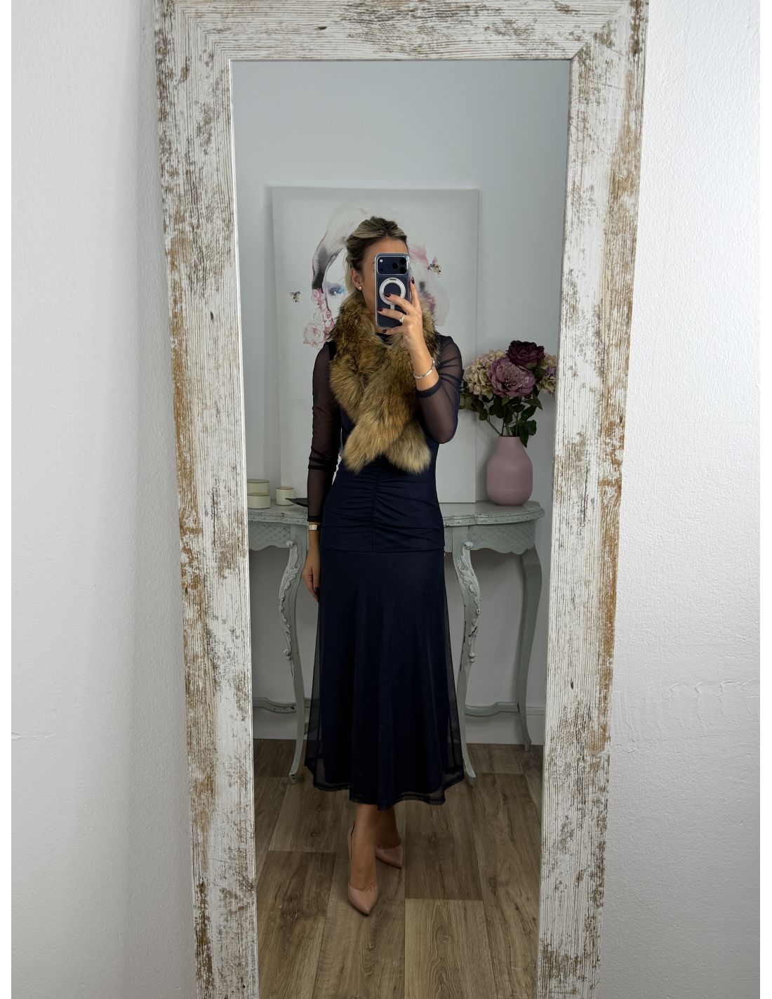 Vestido del tul de cuello a la caja y de corta ajustada hasta la zona de la cadera. Va forrado de un tejido de punto, a excepción de las mangas.