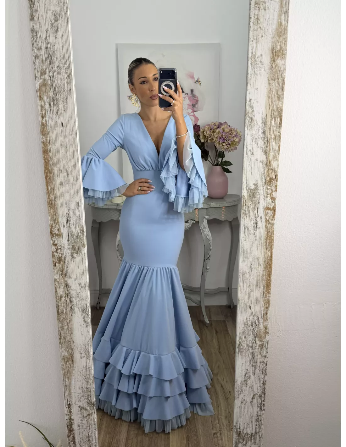 -Talla 2: Hombro 41 cm, pecho 44 cm, cadera 39 cm, manga 57 cm, largo 153 cm