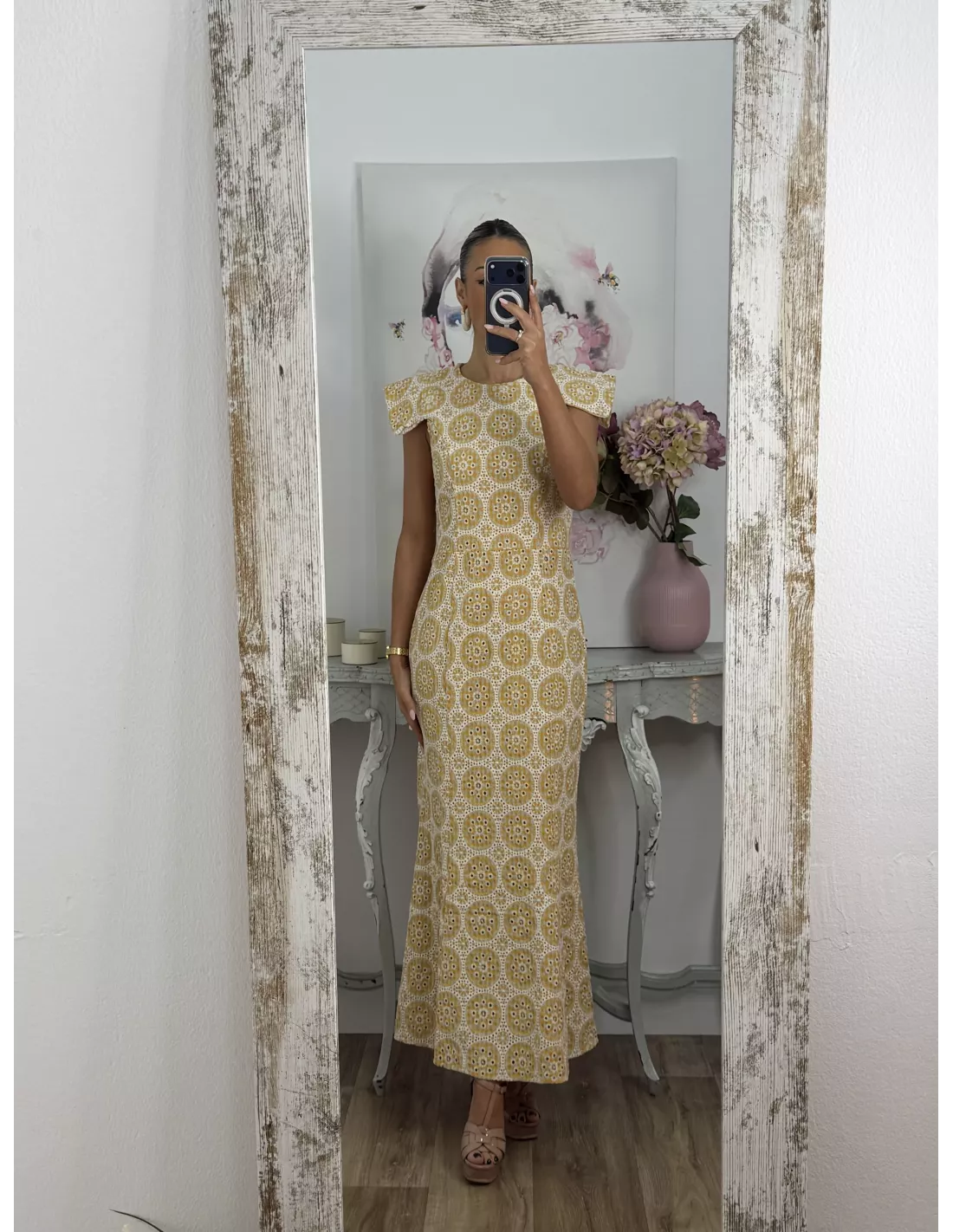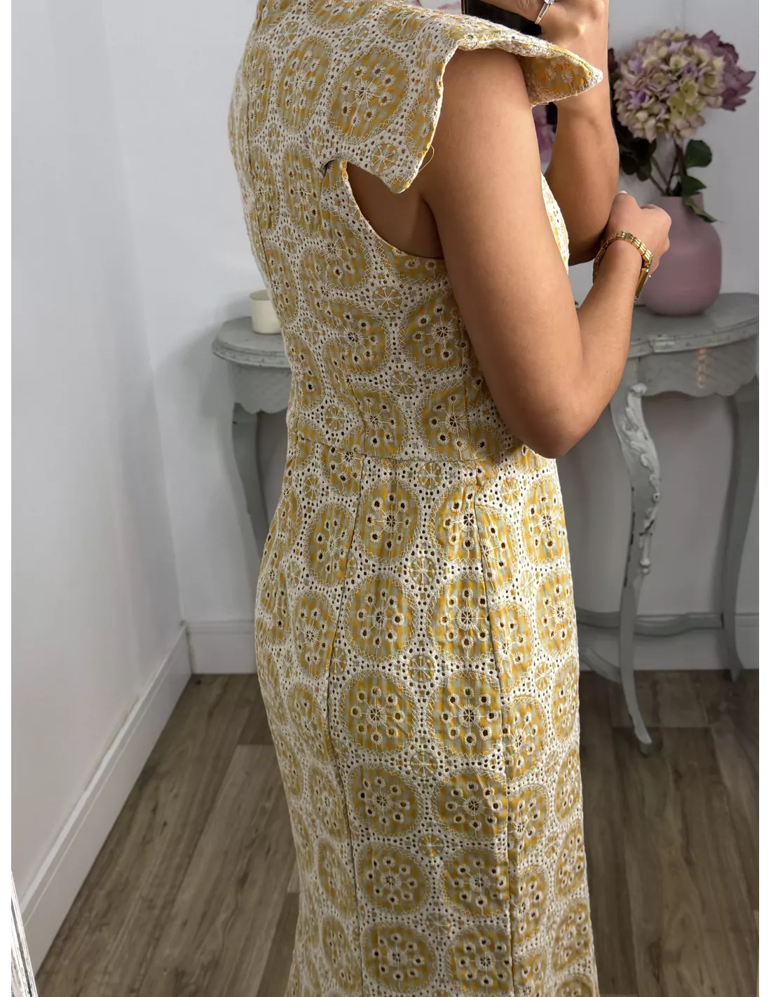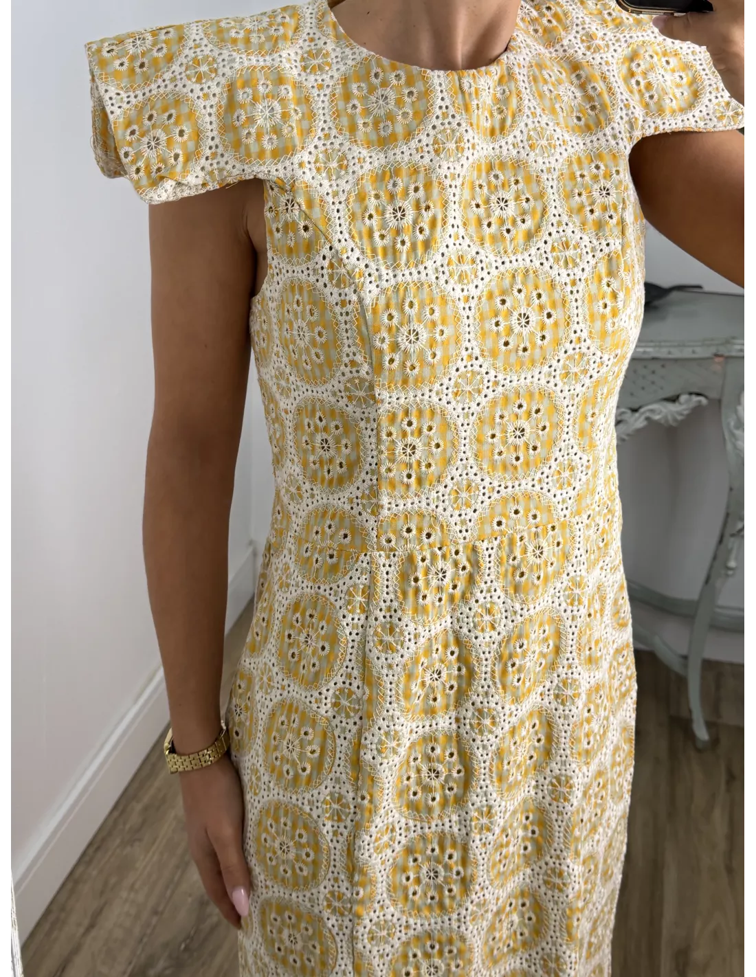 Vestido brocado amarillo y beige