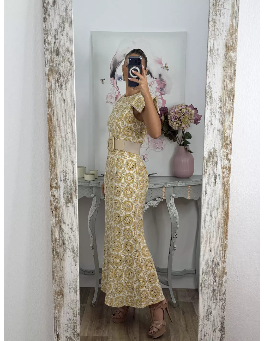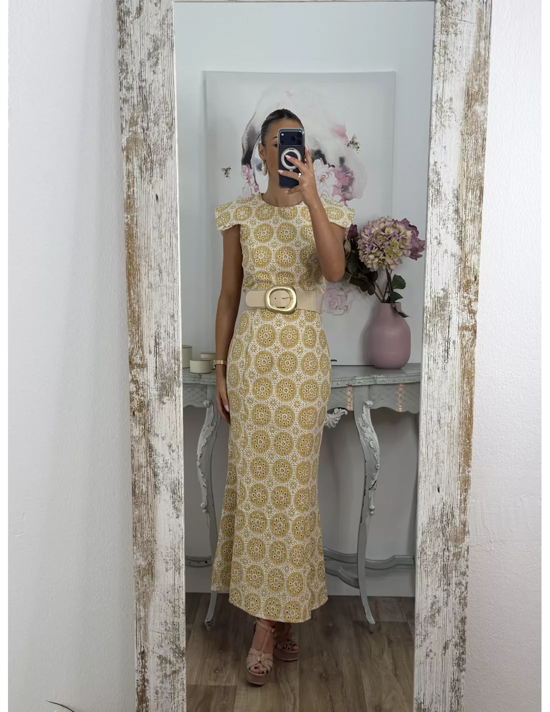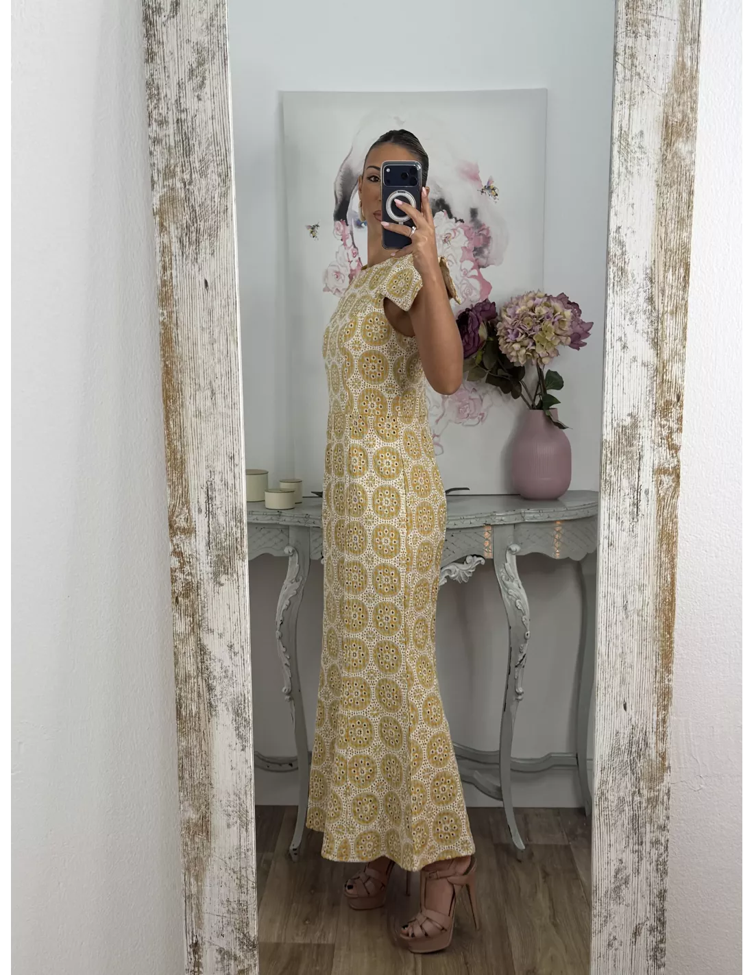 Vestido brocado amarillo y beige