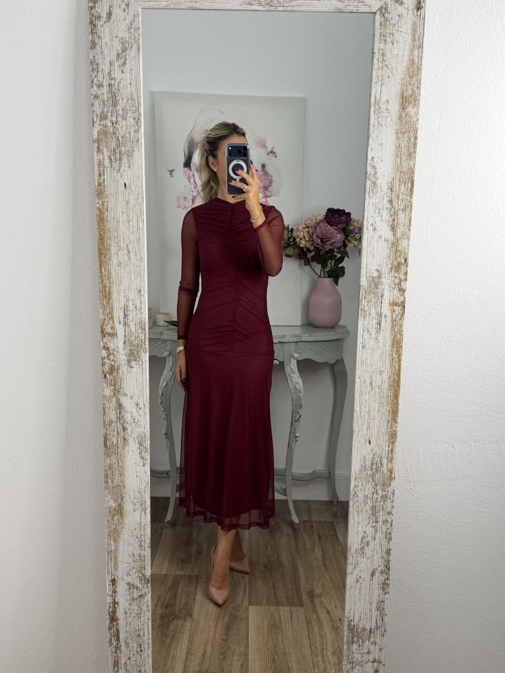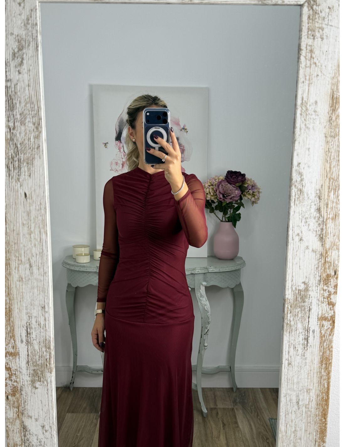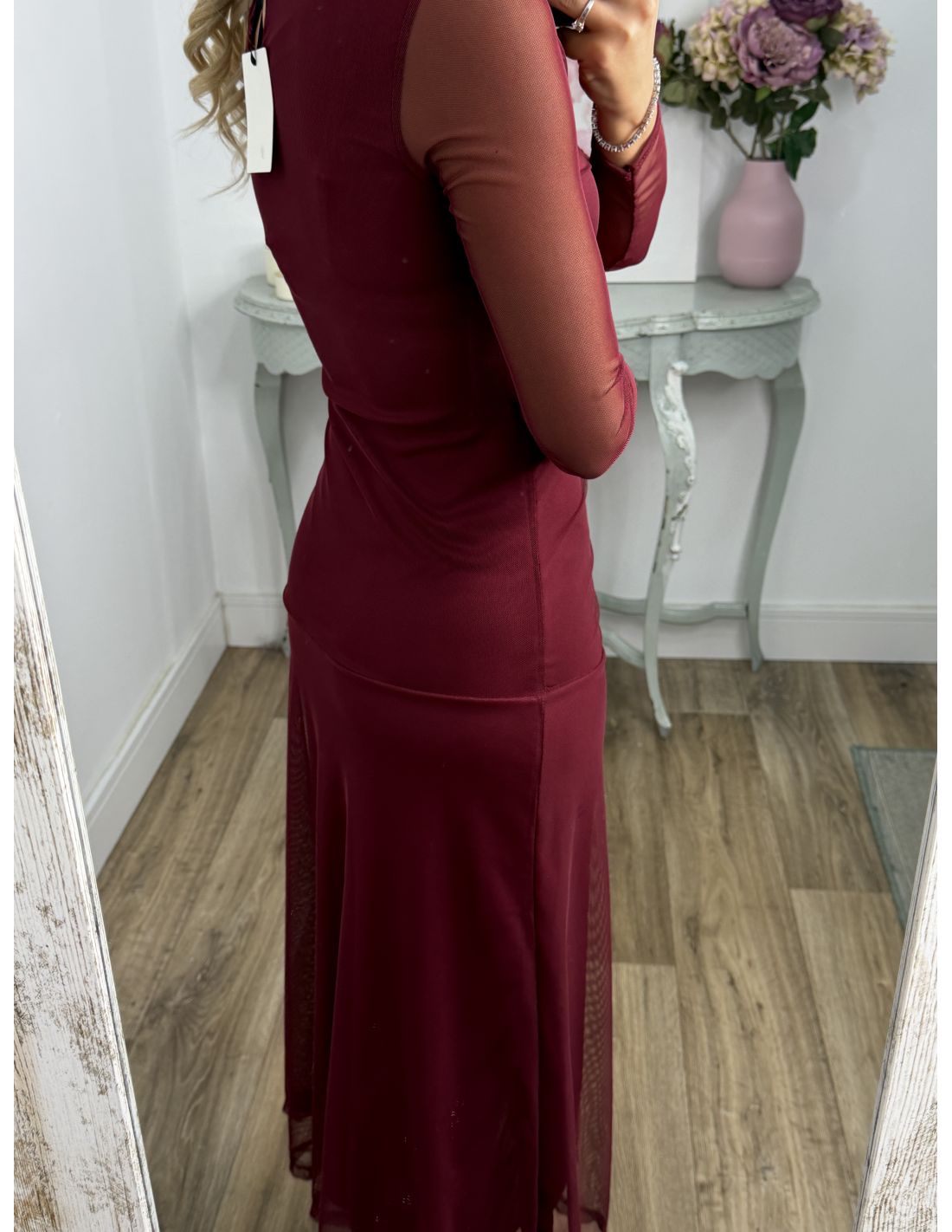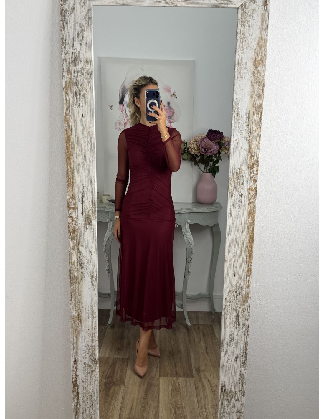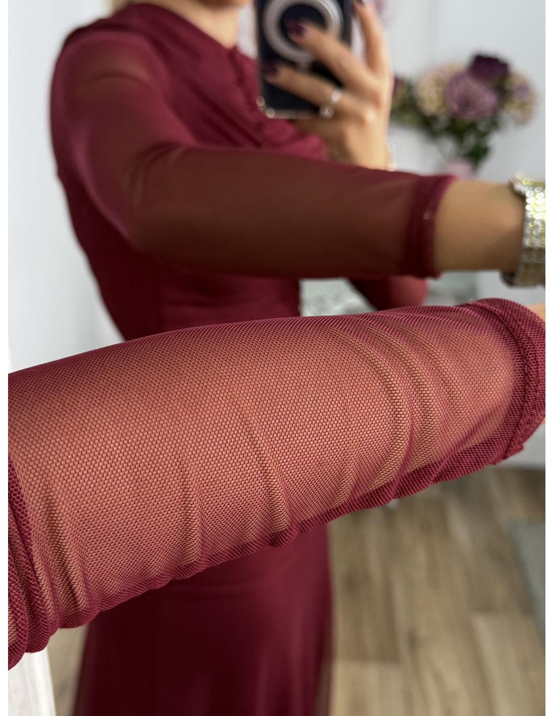 Vestido del tul de cuello a la caja y de corta ajustada hasta la zona de la cadera. Va forrado de un tejido de punto, a excepción de las mangas.