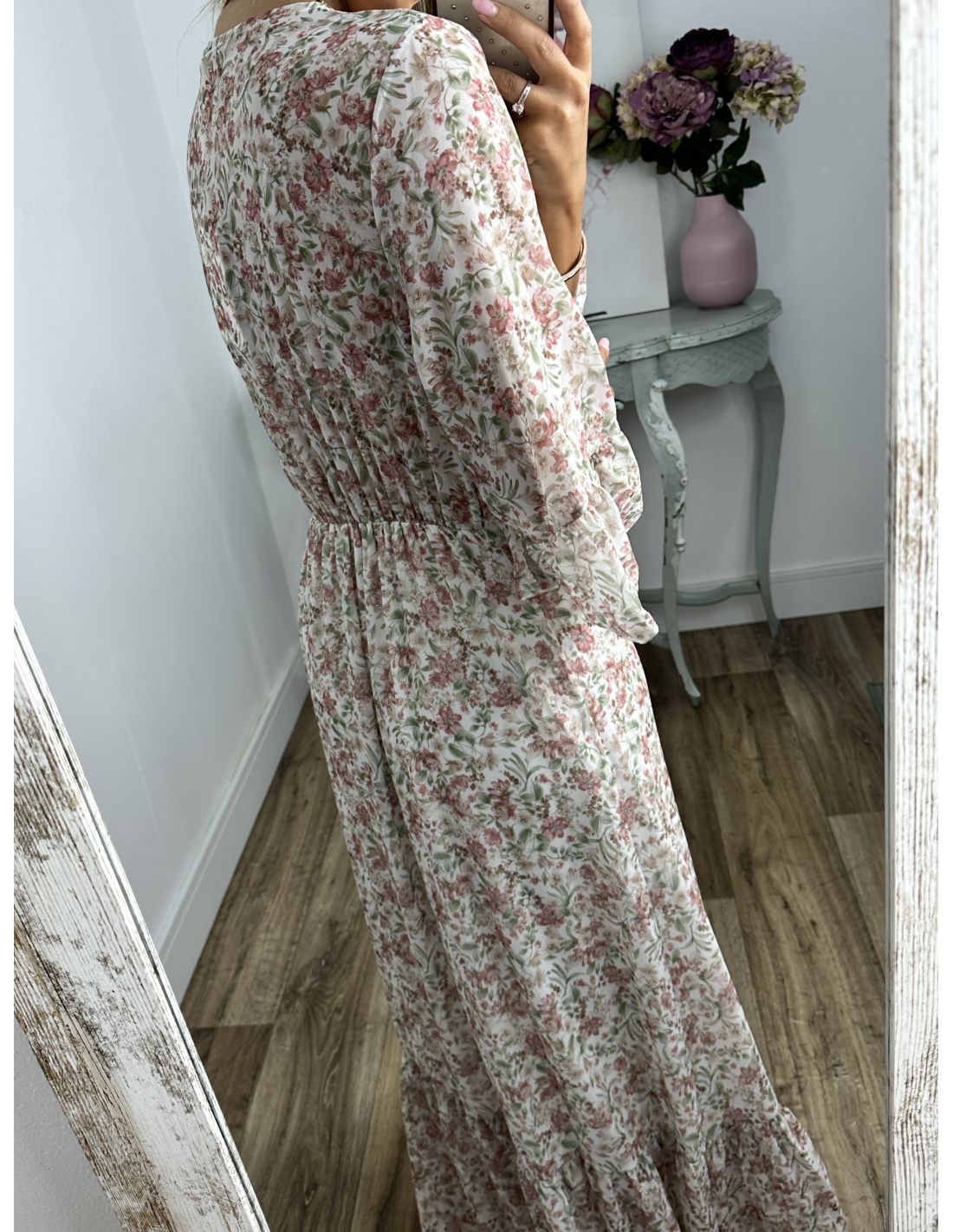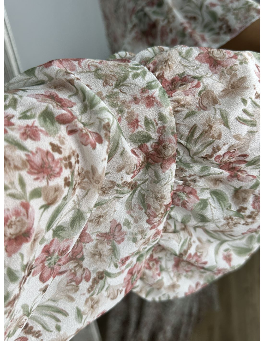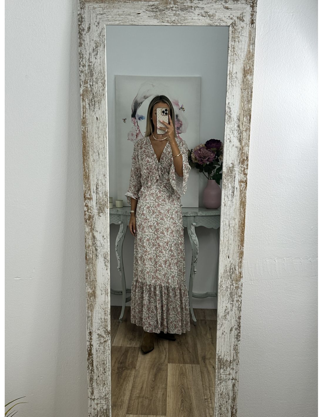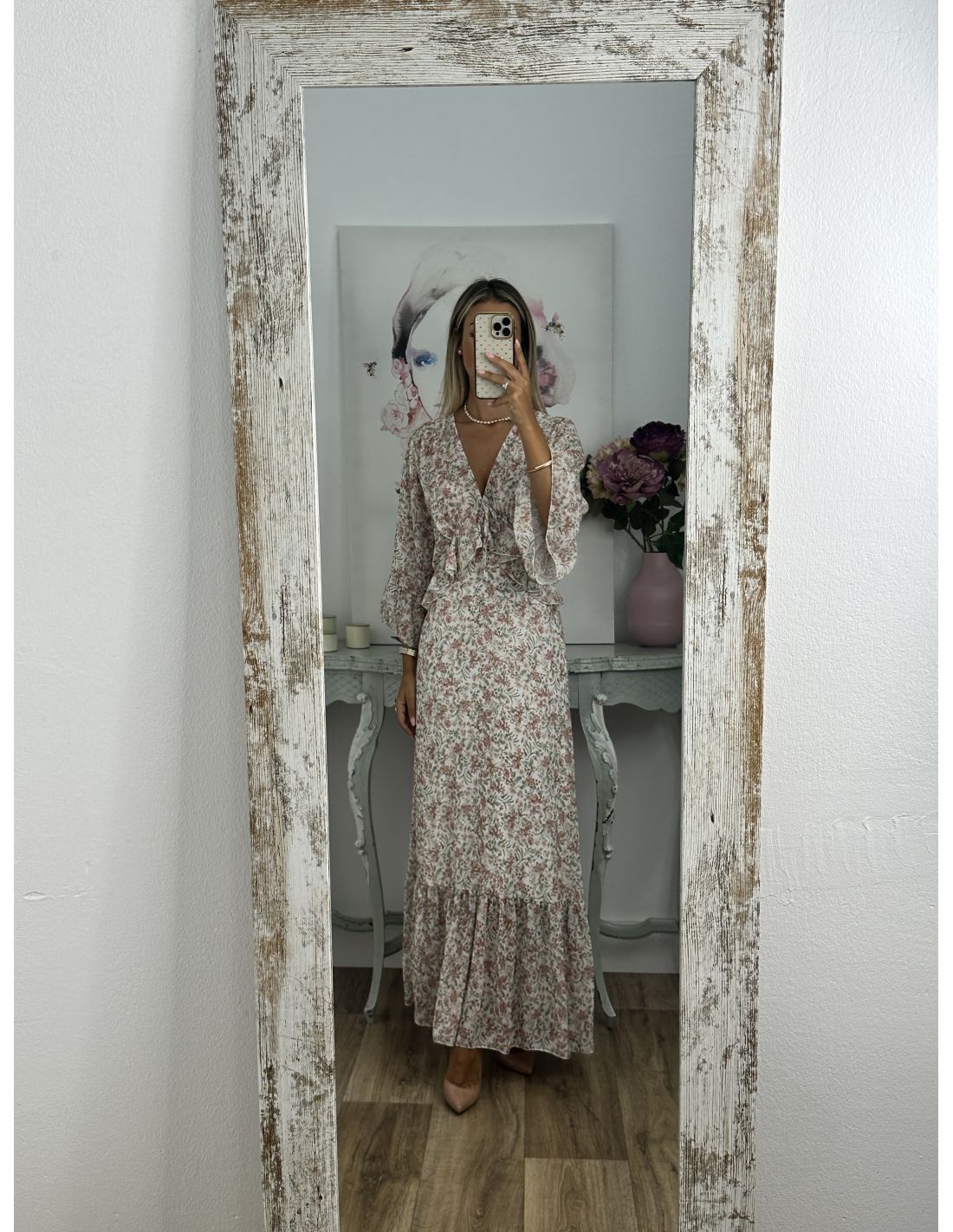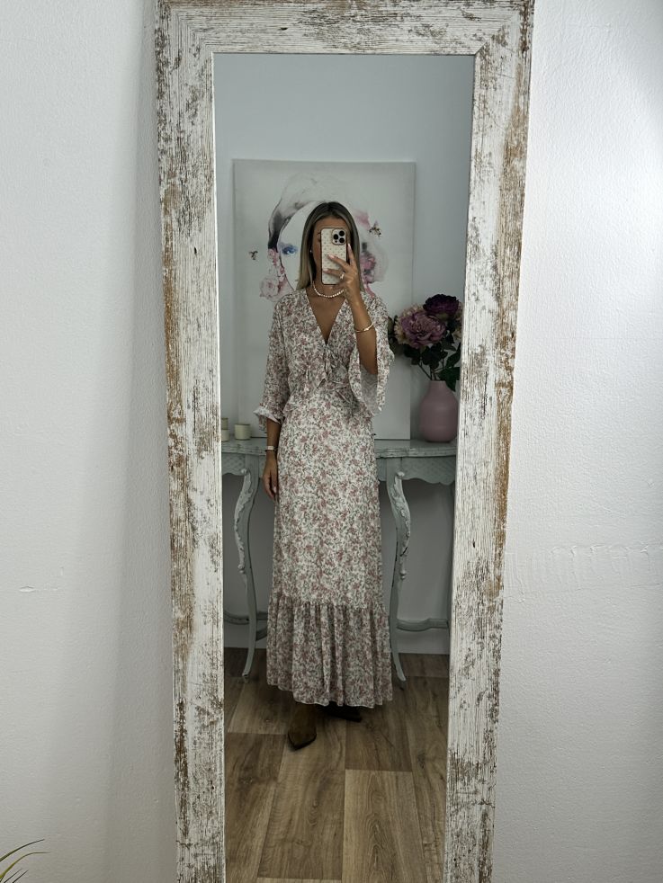 Vestido de manga francesa. Tiene escote de pico y corte debajo del pecho que tiene un volante. La zona de la falda es suelta y va forrada. La zona del pecho y de las mangas lo va forrado.