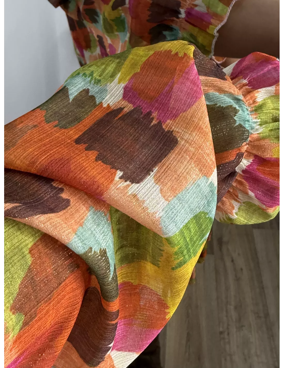 Vestido de tejido tipo gasa. Que la zona de la cintura va engomada tenido de abeja. Lleva forro de punto tiene por todo el tejido un brillo.