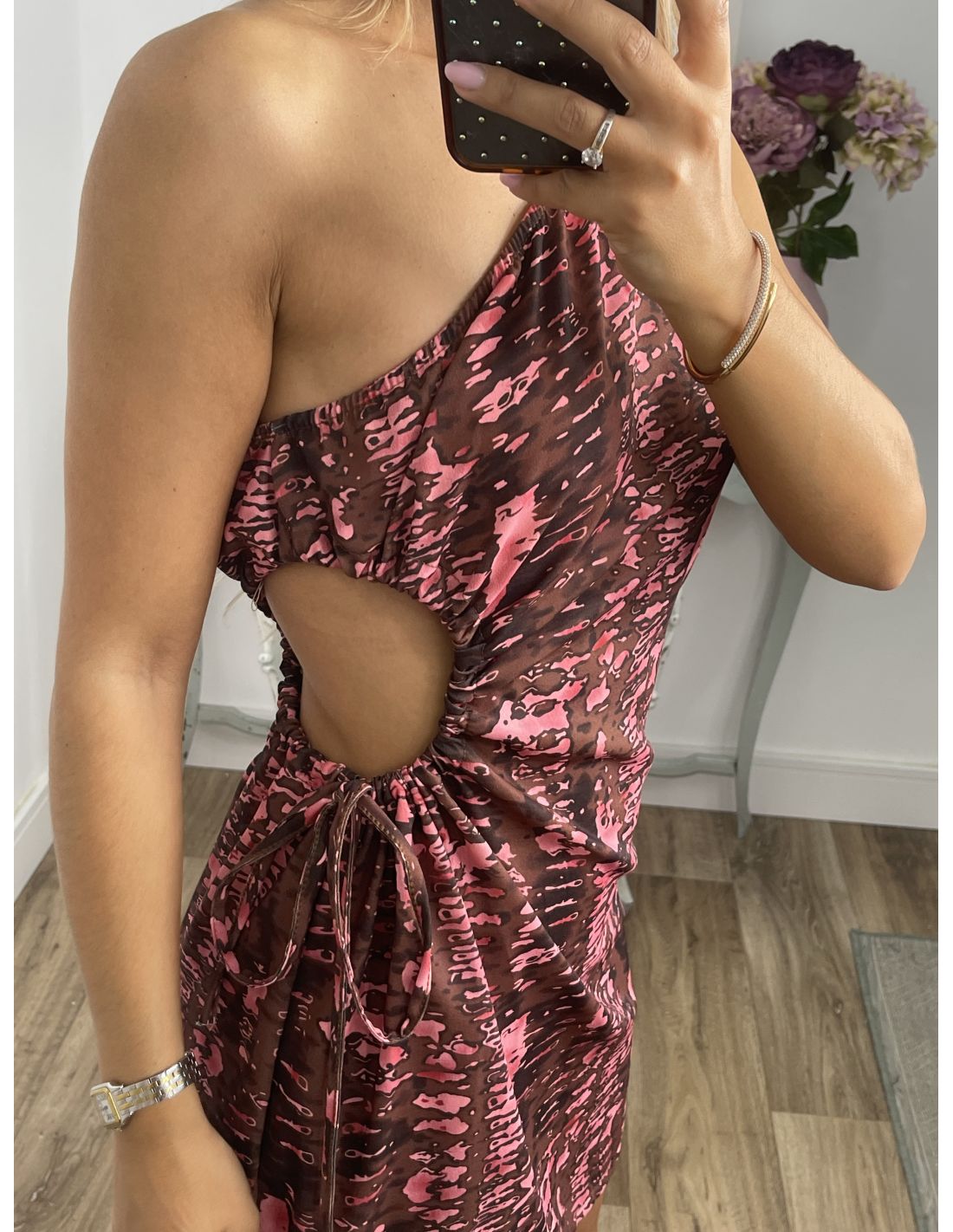 Vestido de escote asimétrico que lleva abertura en la zona de la cintura que se ajusta con un cordón.