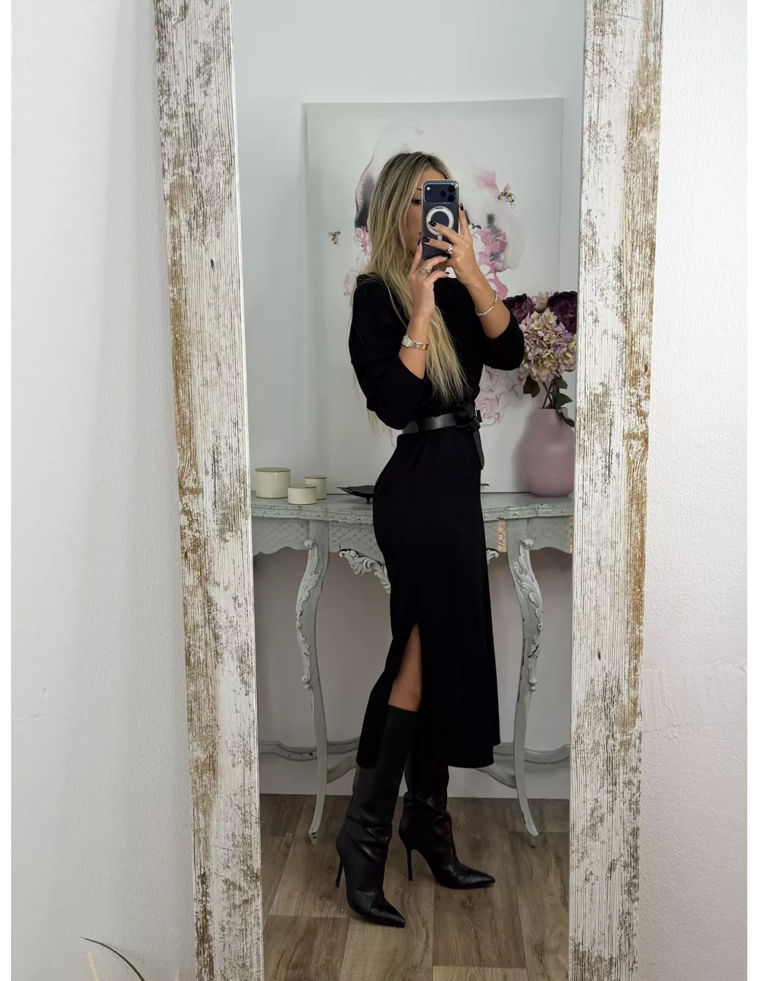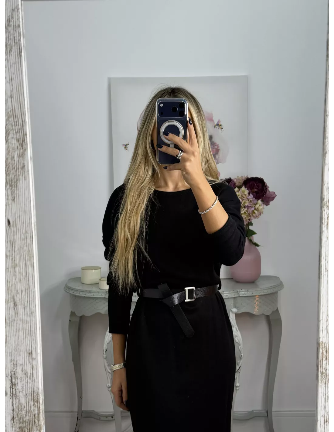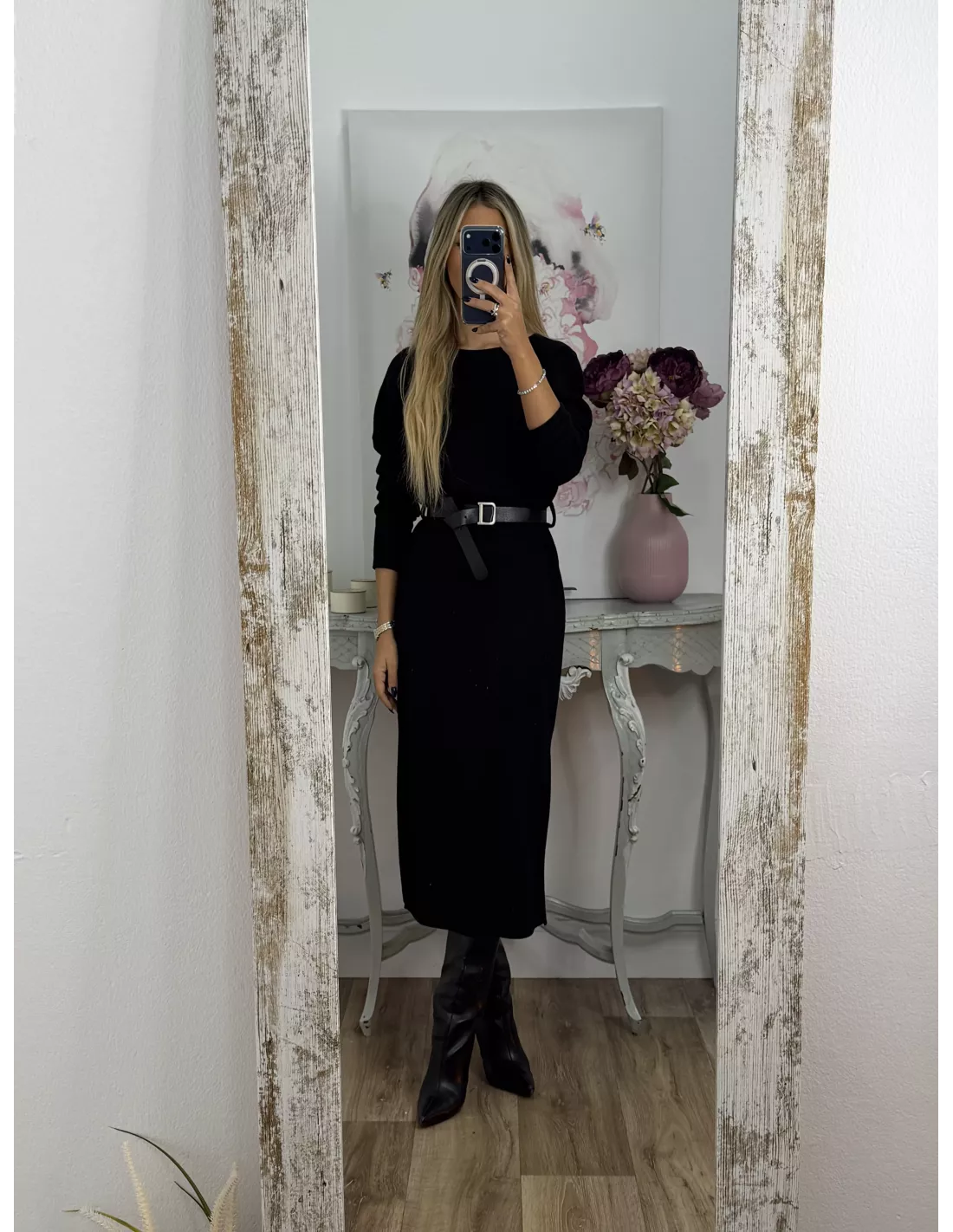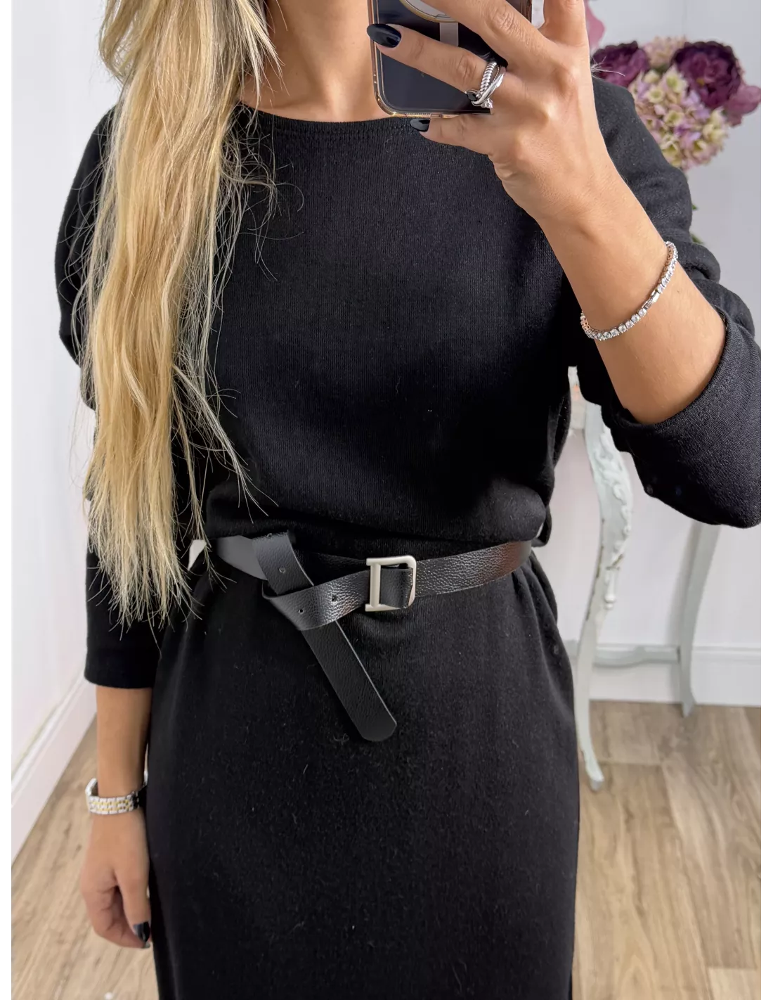 Vestido de cuello a la caja de corte recto que incluye el cinturón. El tejido es de punto.