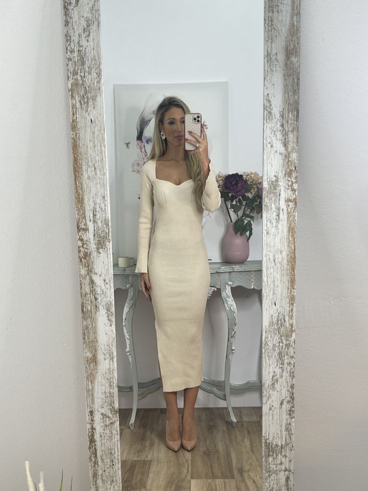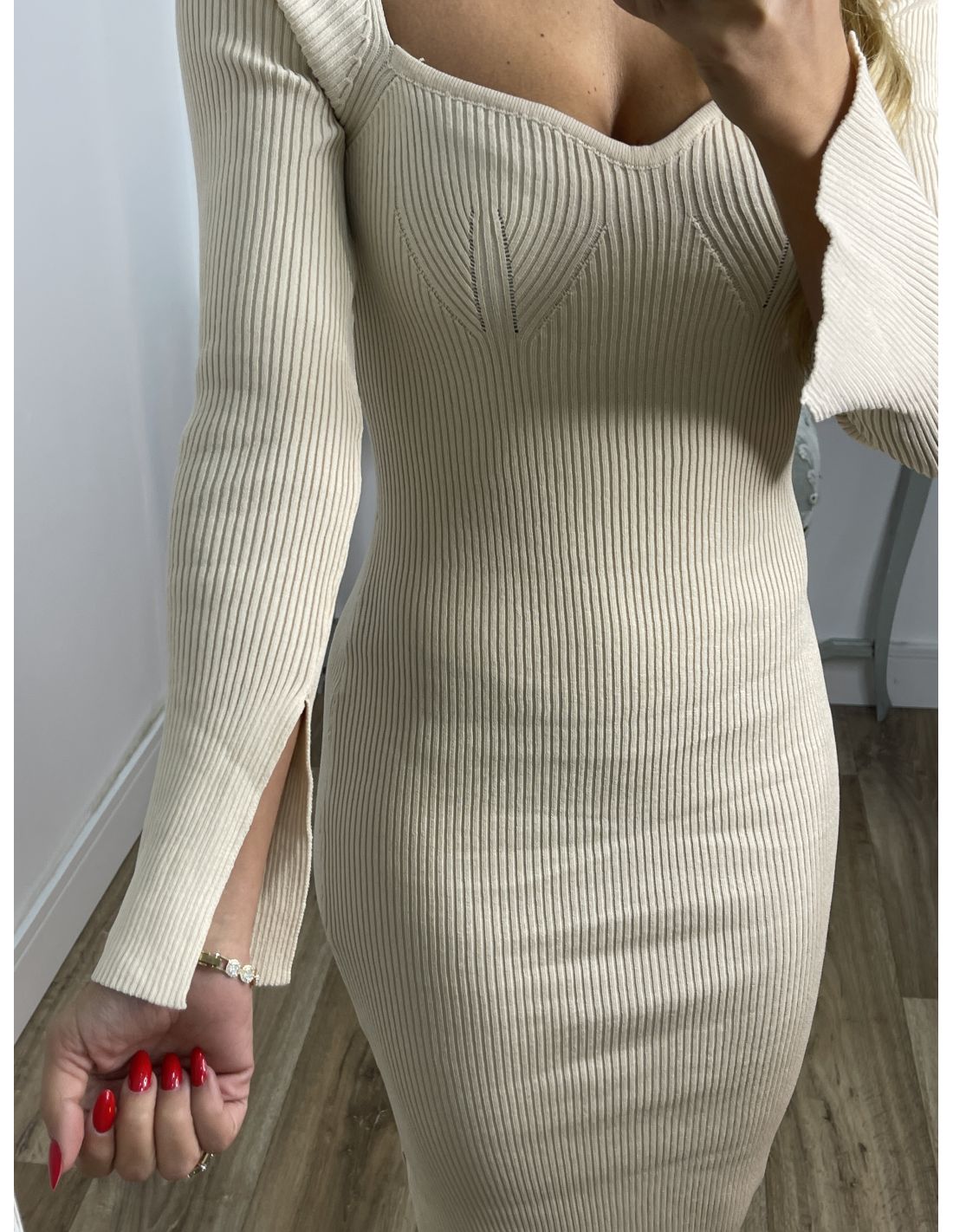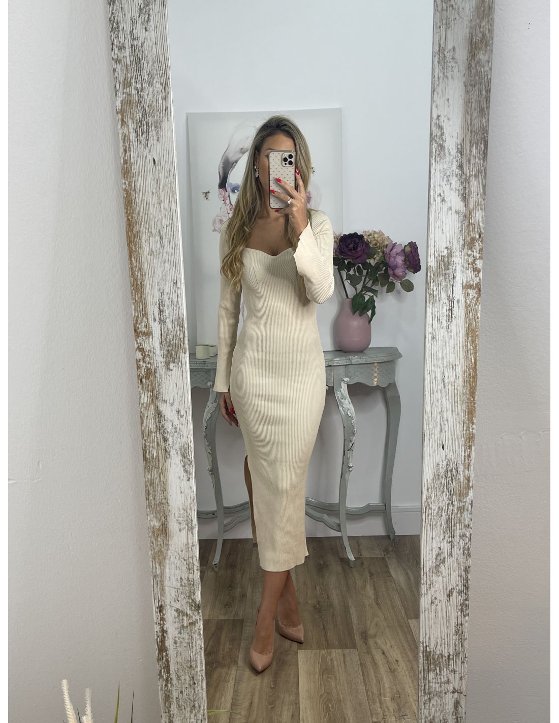 Vestido punto de canalé, el corte es ceñido. No va forrado, de manga larga y al final de la manga lleva una abertura. La zona del escote hace forma corazón. Tiene abertura en el lateral por la costura.
