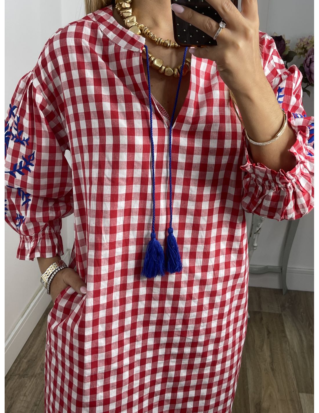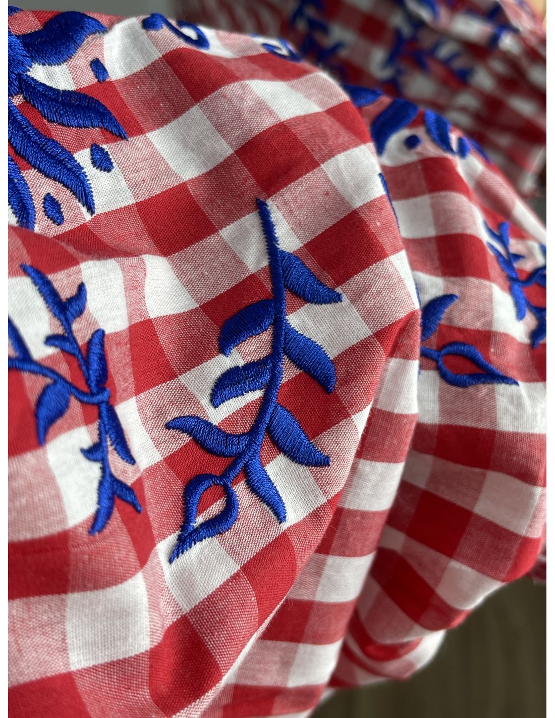 Vestido de cuadros vichy con mordados en la manga. Es de corte recto, no va forrado y trae bolsillos.