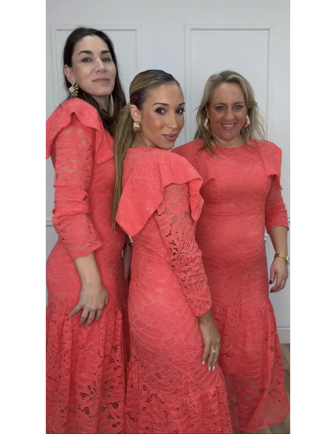 La modelo lleva la talla S, ella utiliza de forma habitual talla XS Y mide 1,60 cm. Laura lleva talla M y mide 1,70 cm. Pilar lleva talla L y mide 1,64 cm