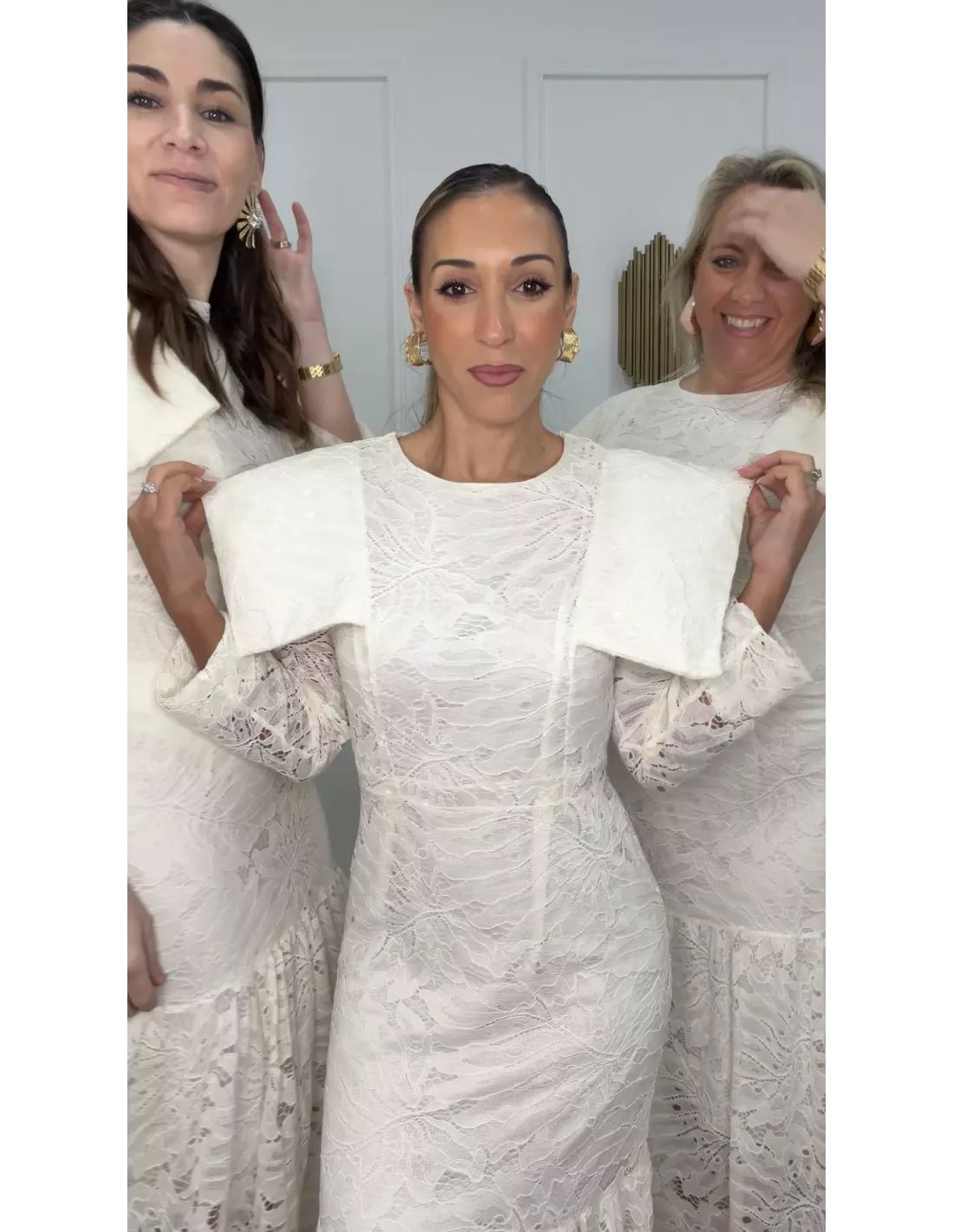 La modelo lleva la talla S, ella utiliza de forma habitual talla XS Y mide 1,60 cm. Laura lleva talla M y mide 1,70 cm. Pilar lleva talla L y mide 1,64 cm