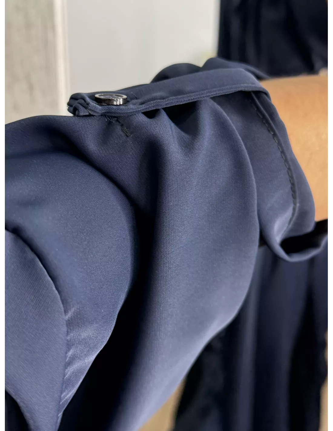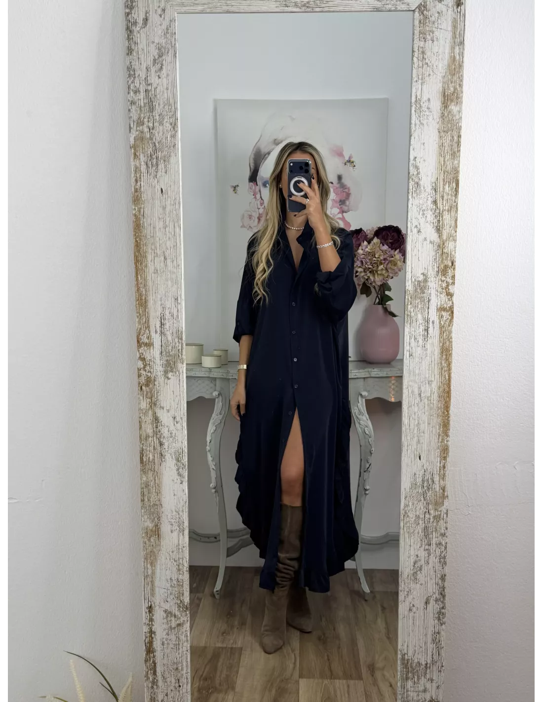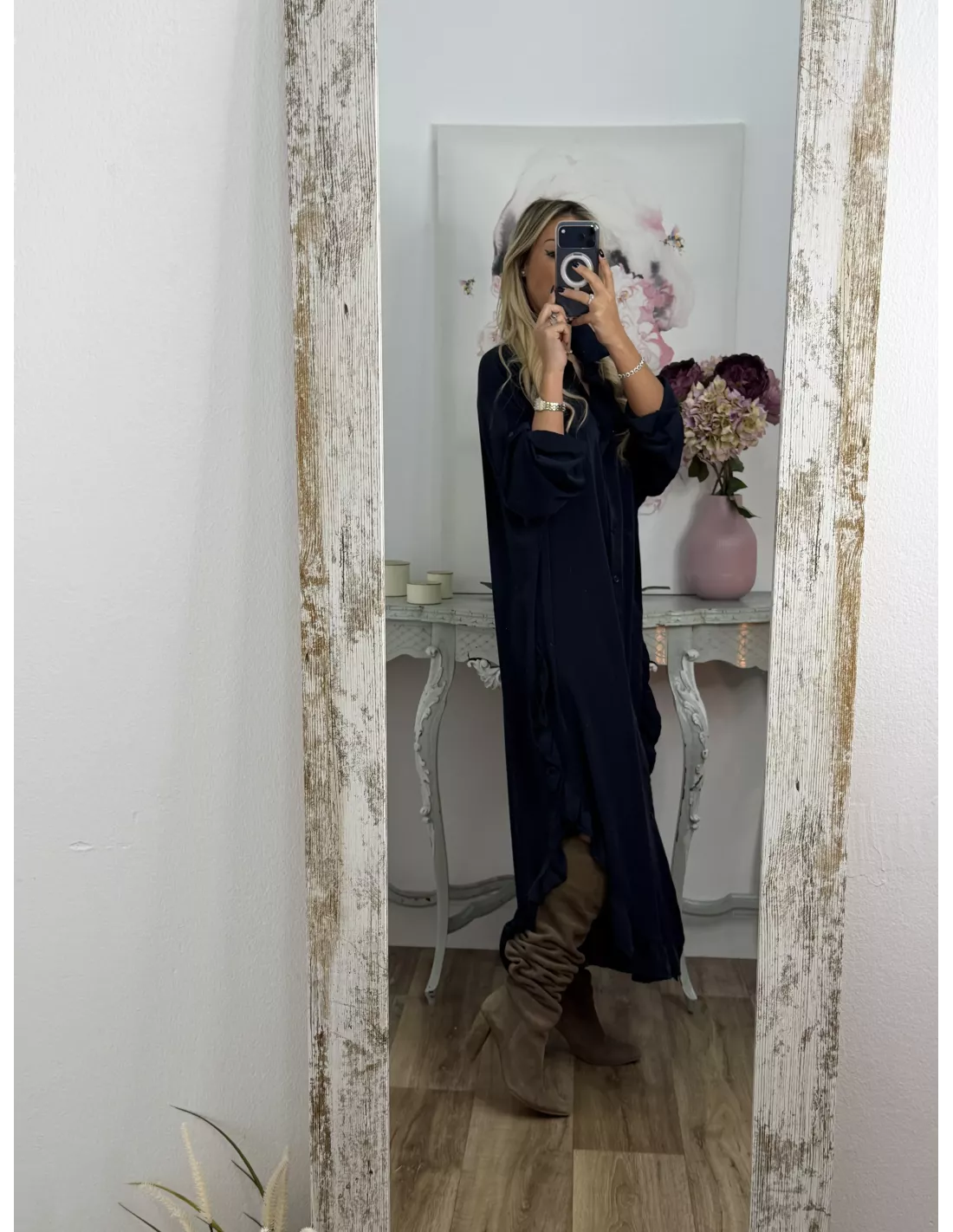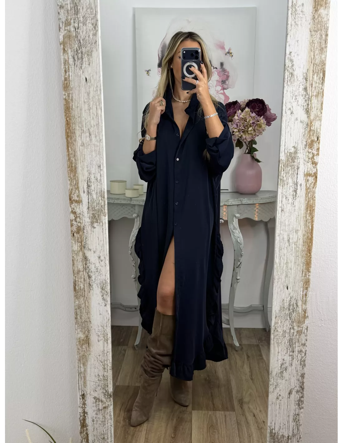 Vestido de corte tipo túnica, que lleva un volante en la parte de abajo. Es abotonado.