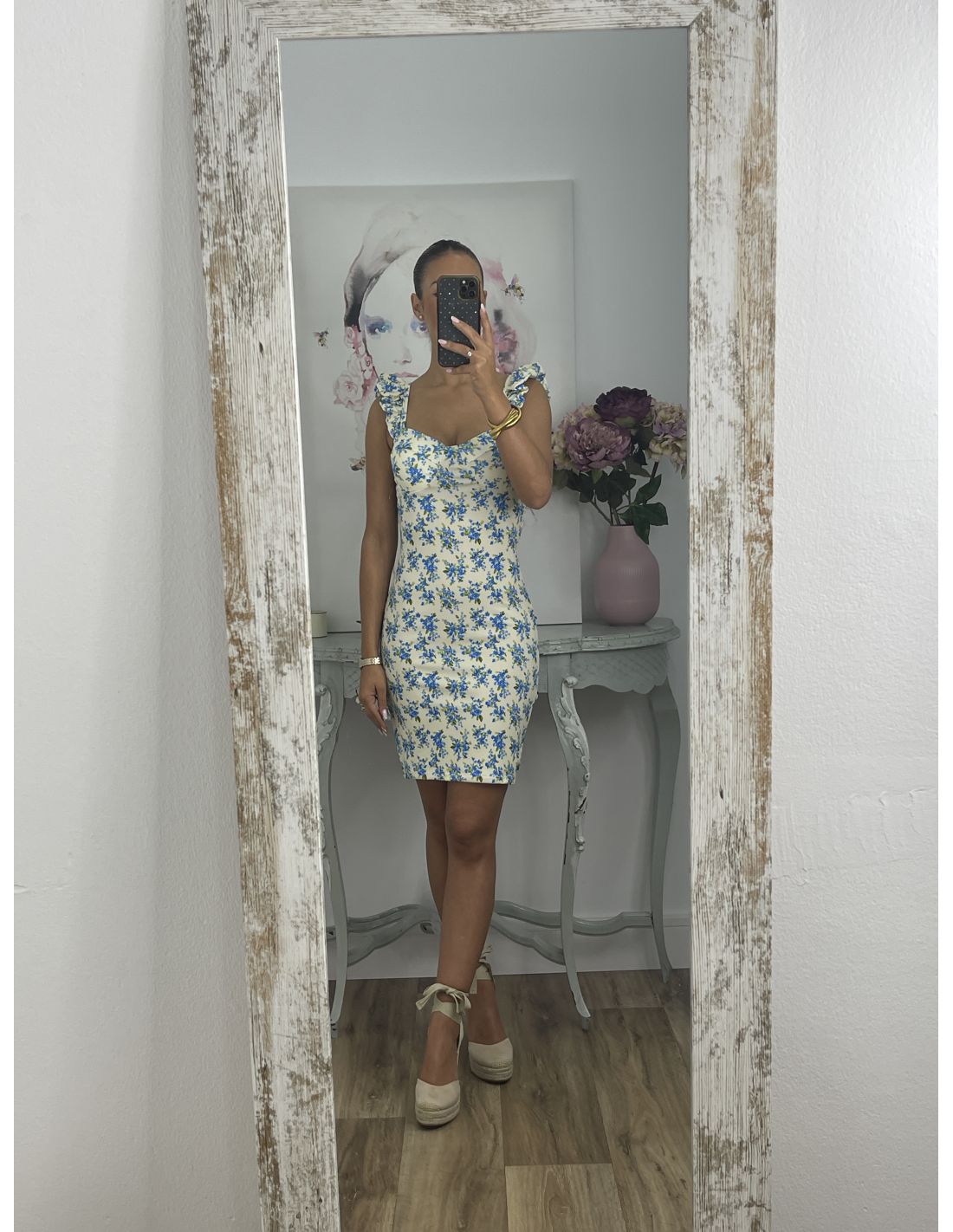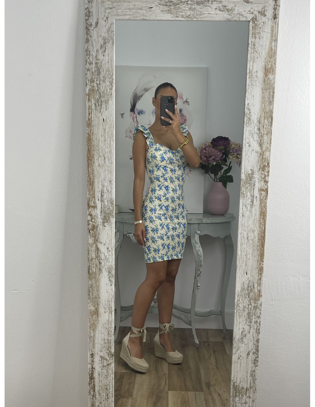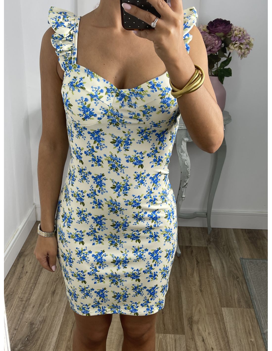 Vestido Gala corto flores azules