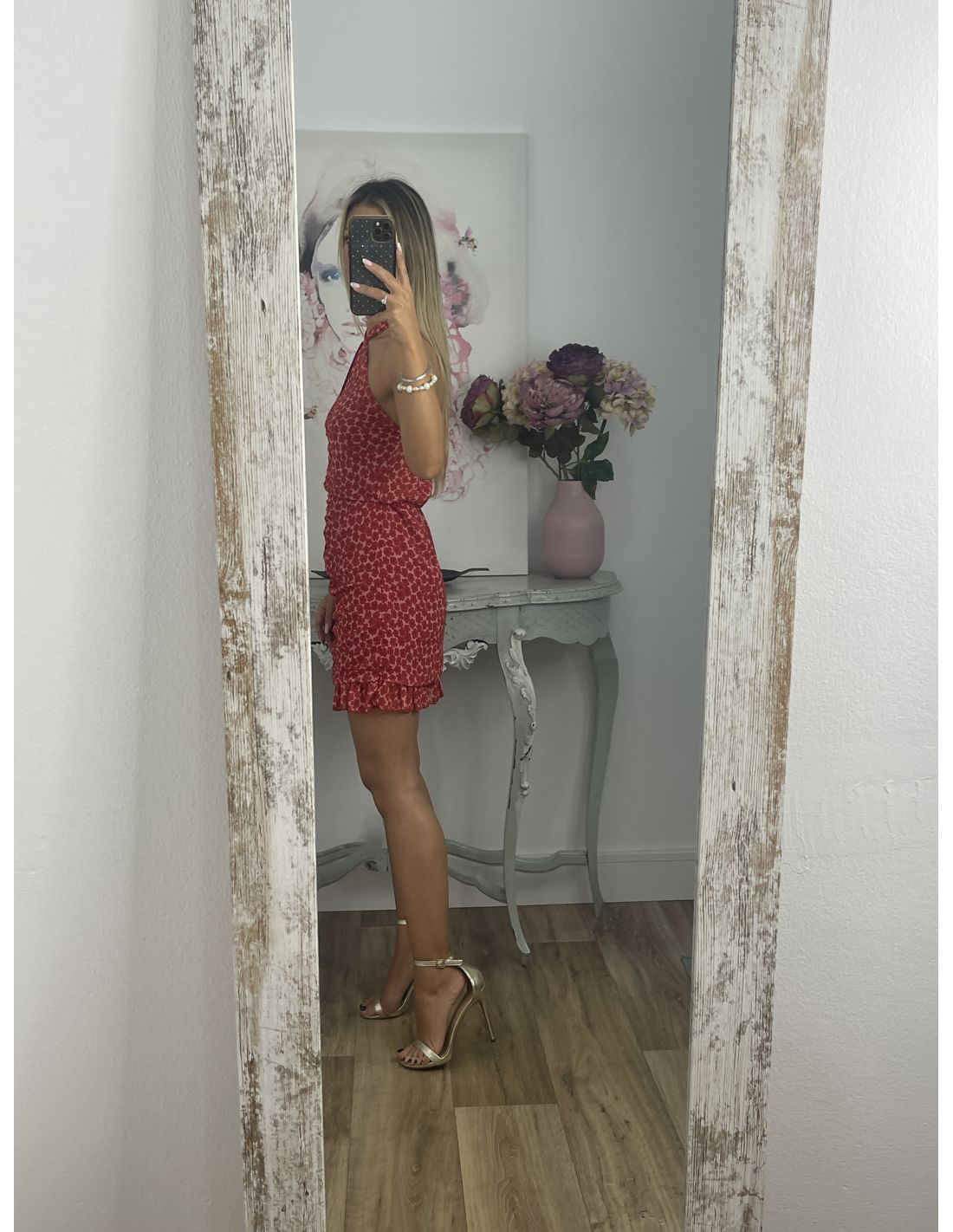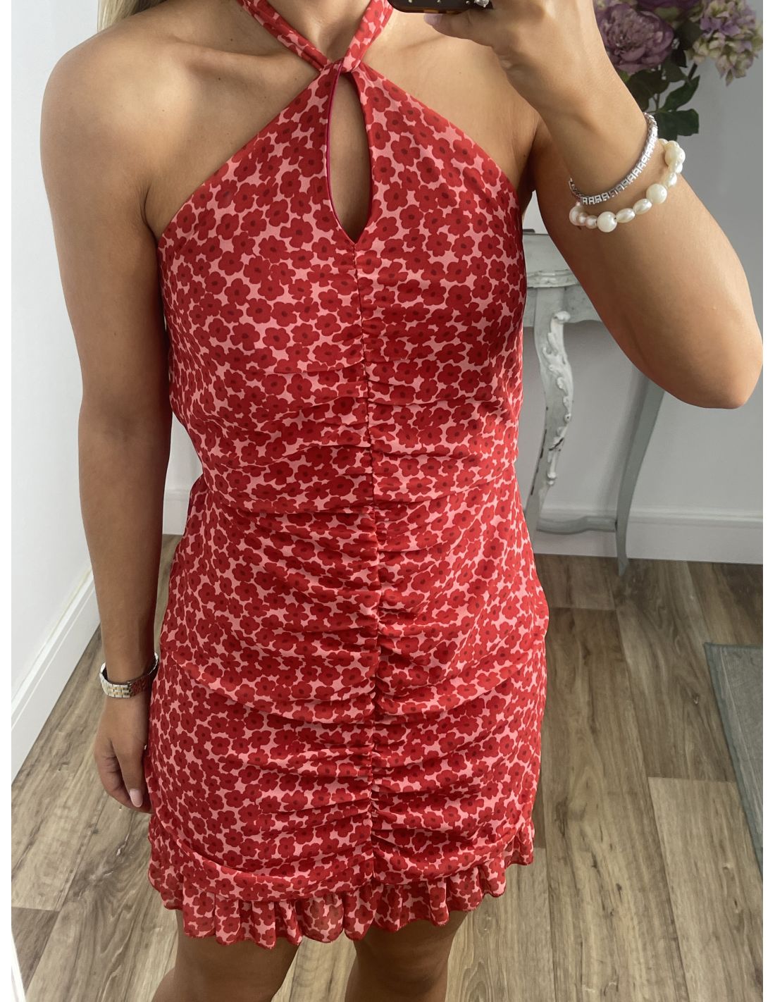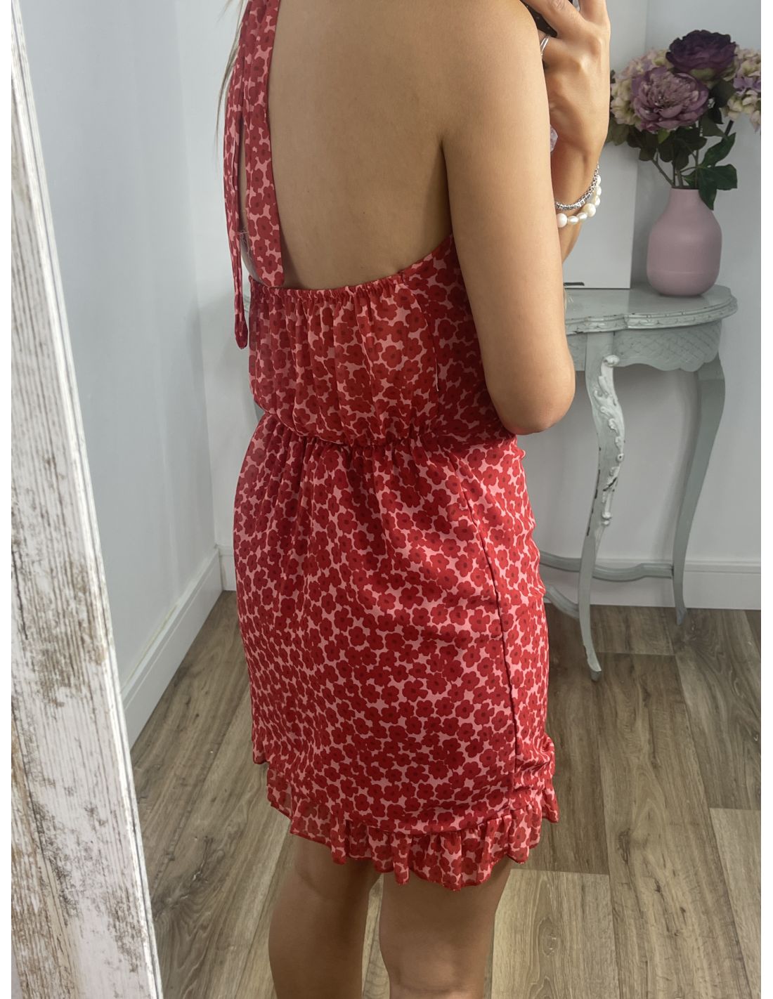 Vestido de tejido tipo gasa que va forrado, no marcan, ni se transparenta. El forro es un tejido de algodón. Es atado al cuello y la zona de la falda va fruncida la parte delantera.