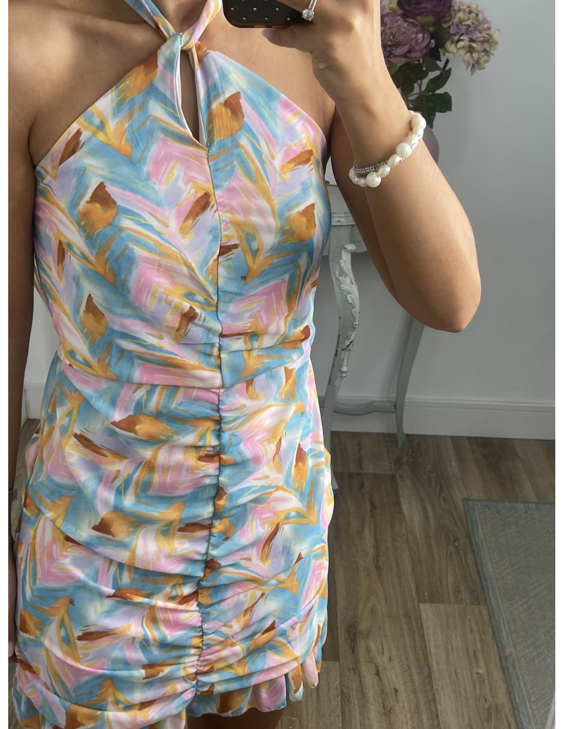 Vestido de tejido tipo gasa que va forrado, no marcan, ni se transparenta. El forro es un tejido de algodón. Es atado al cuello y la zona de la falda va fruncida la parte delantera.