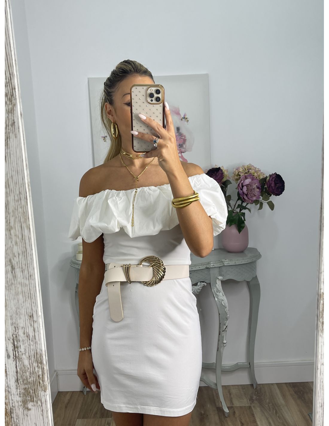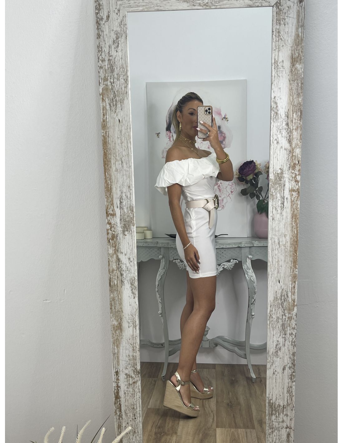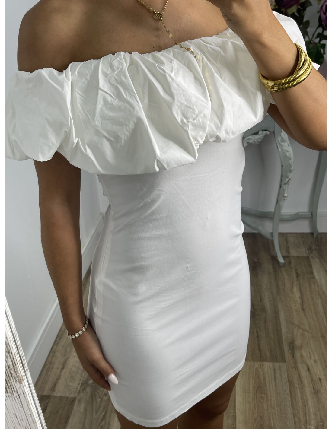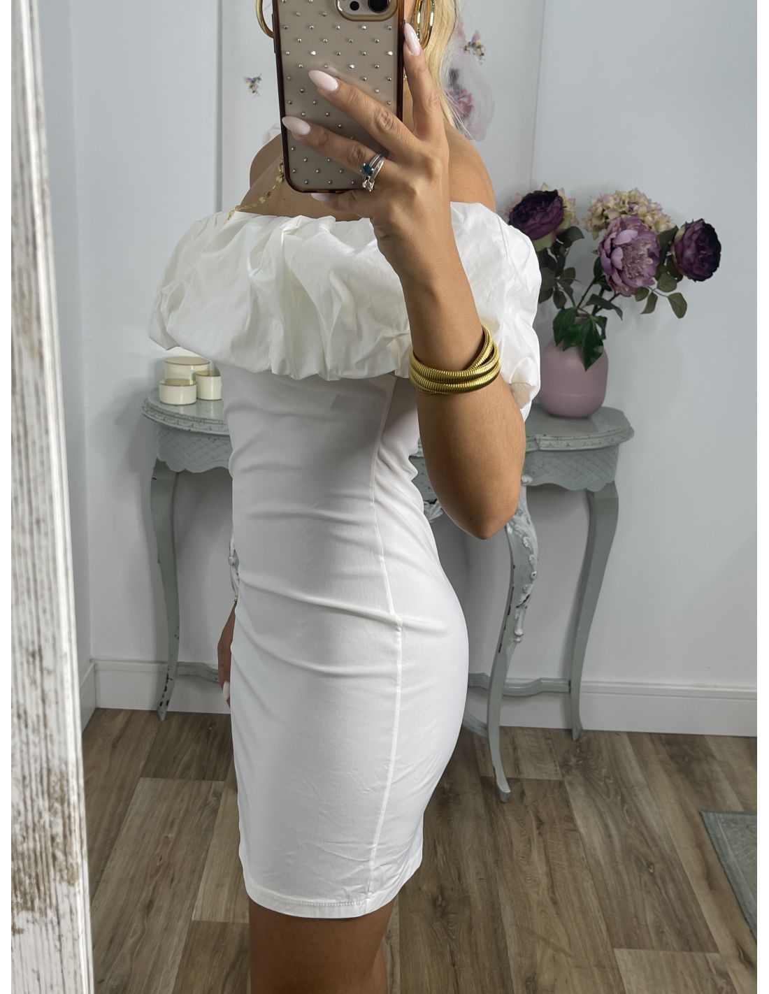 vestido de escote tipo barco con volante abullonado. Es de corte ajustado y lleva cremallera invisible en el lateral. Es elástico.