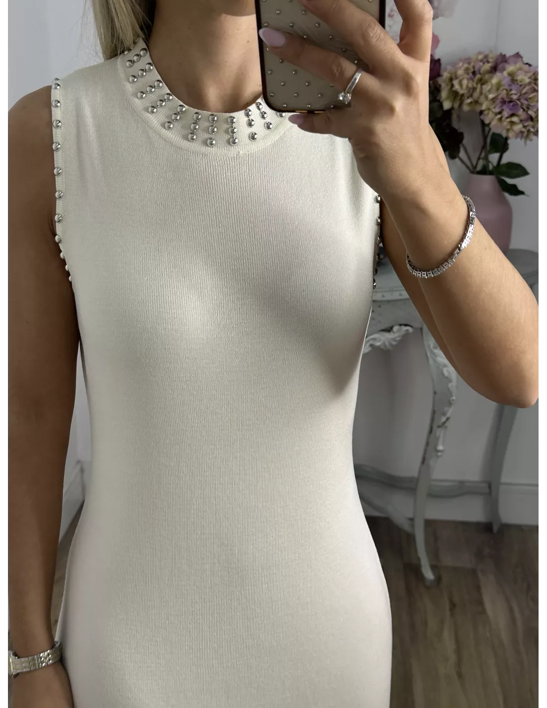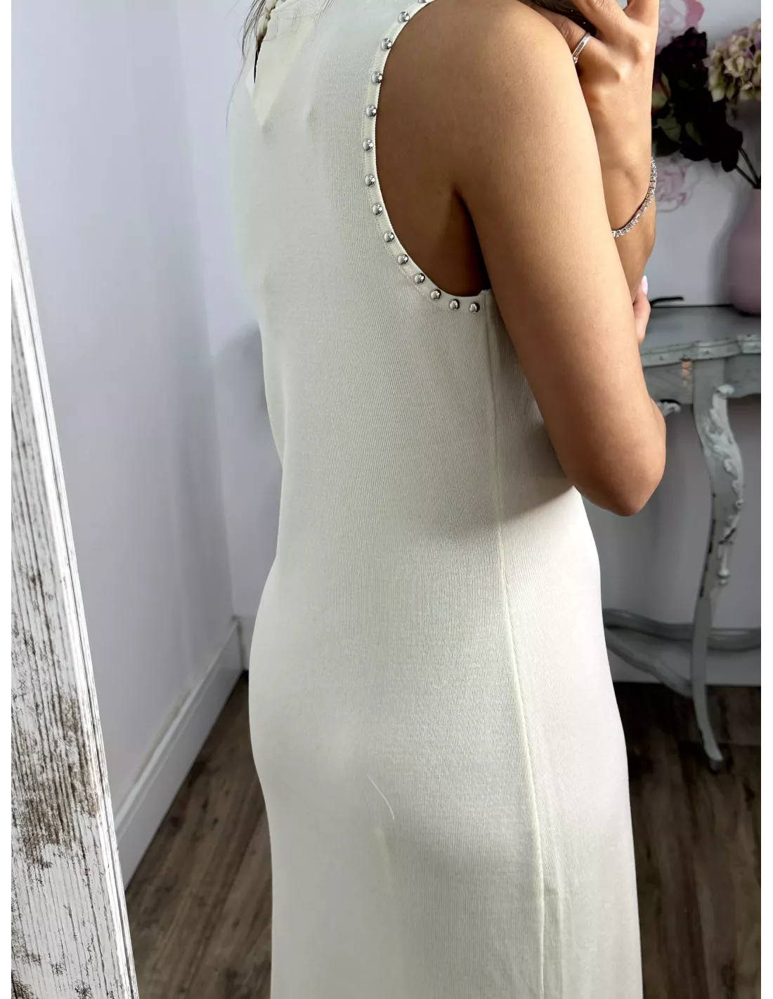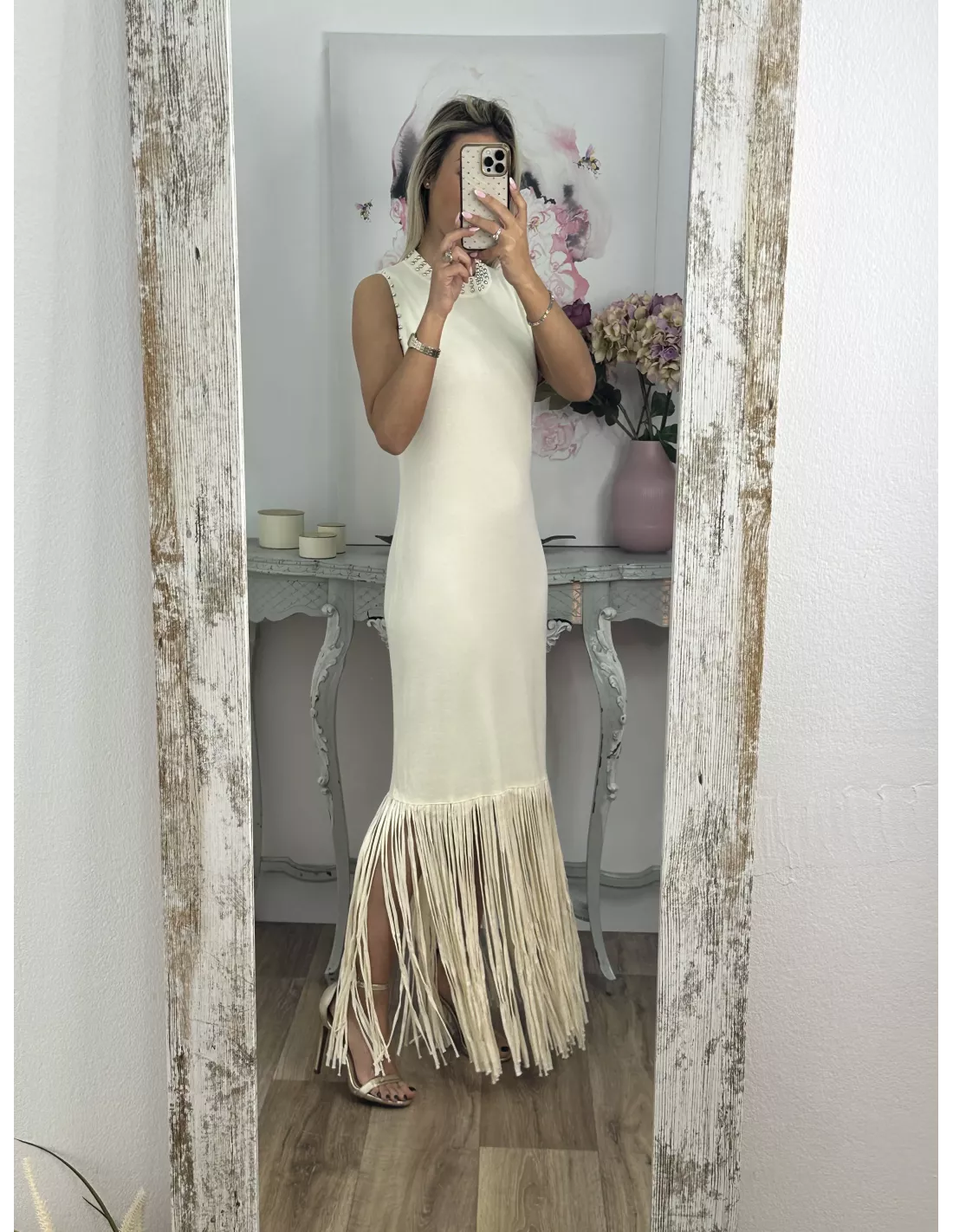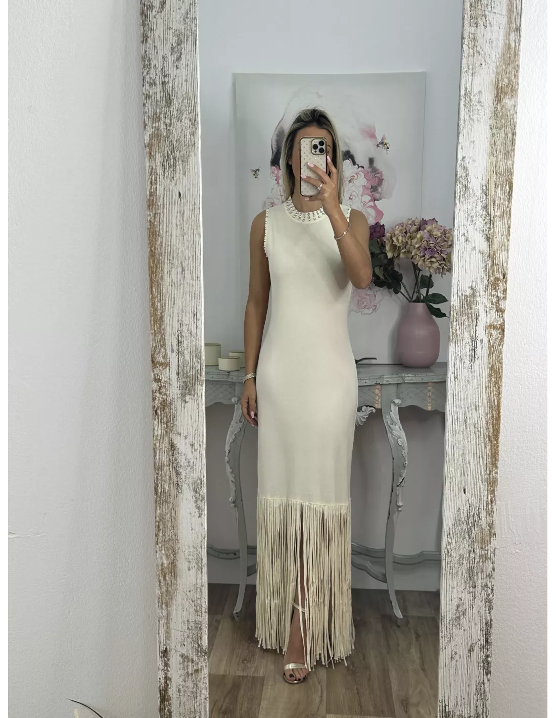 Vestido de punto de cuello a la caja de corte recto con flecos en la parte de abajo. No va forrado. En la zona del cuello y de la sisa, lleva tachuelas plateadas.