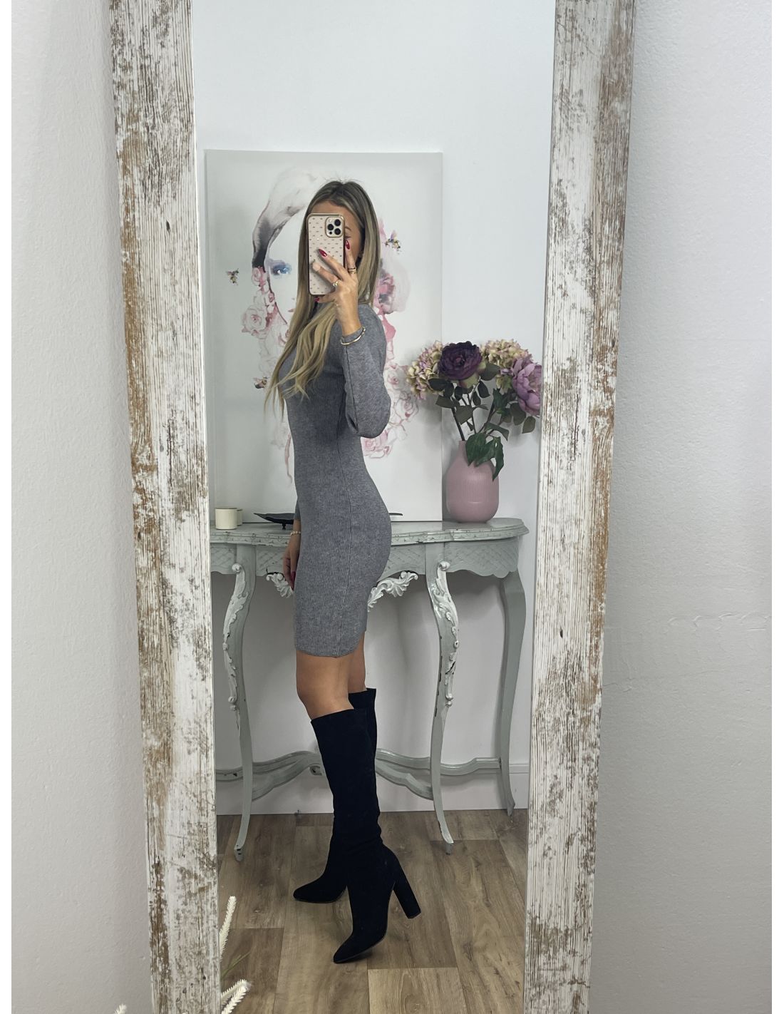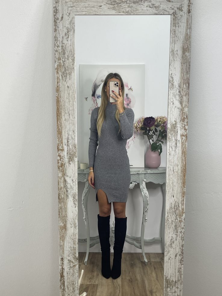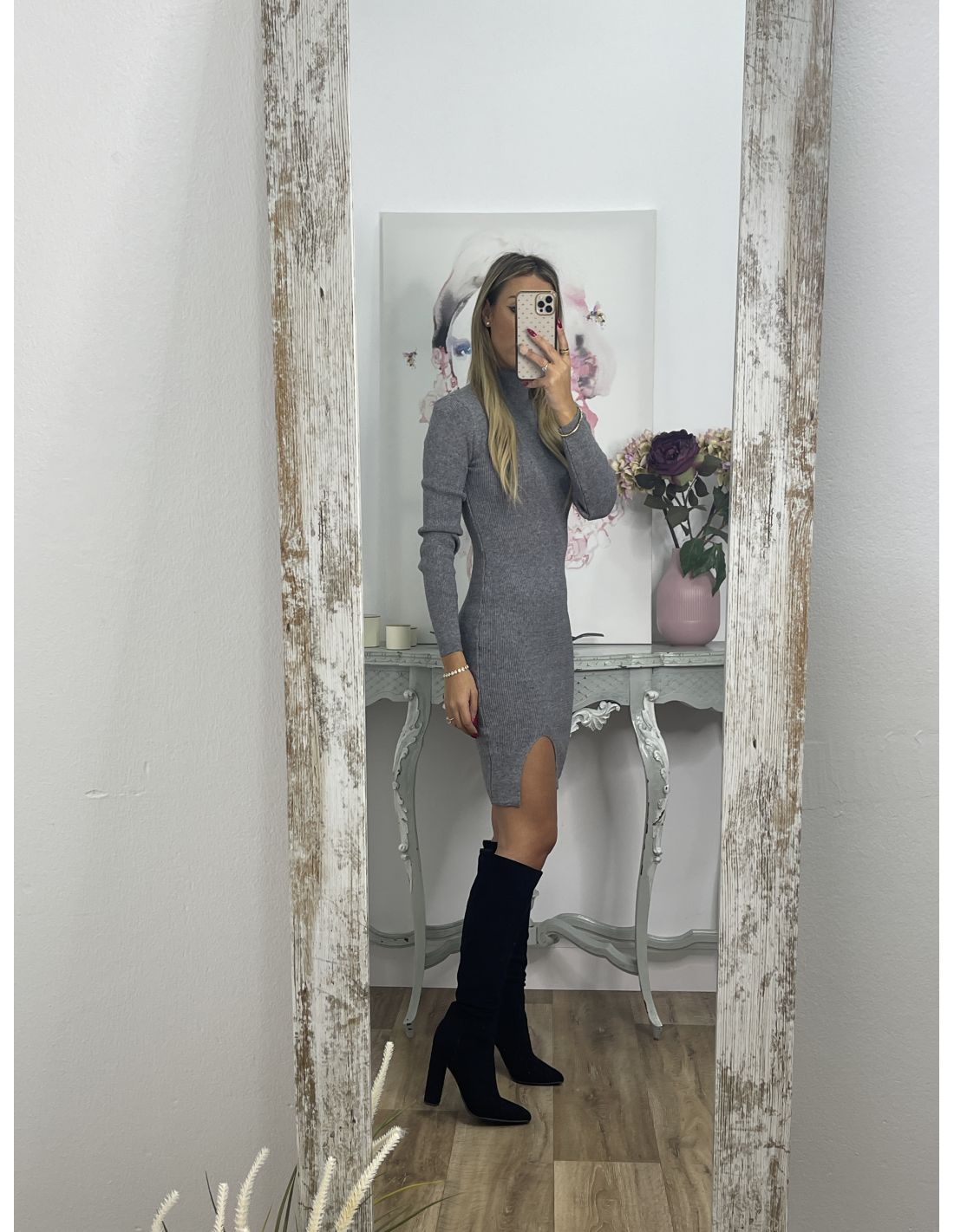 Vestido de punto ajustado, con cuello chimenea, con raja en la zona de la falda.