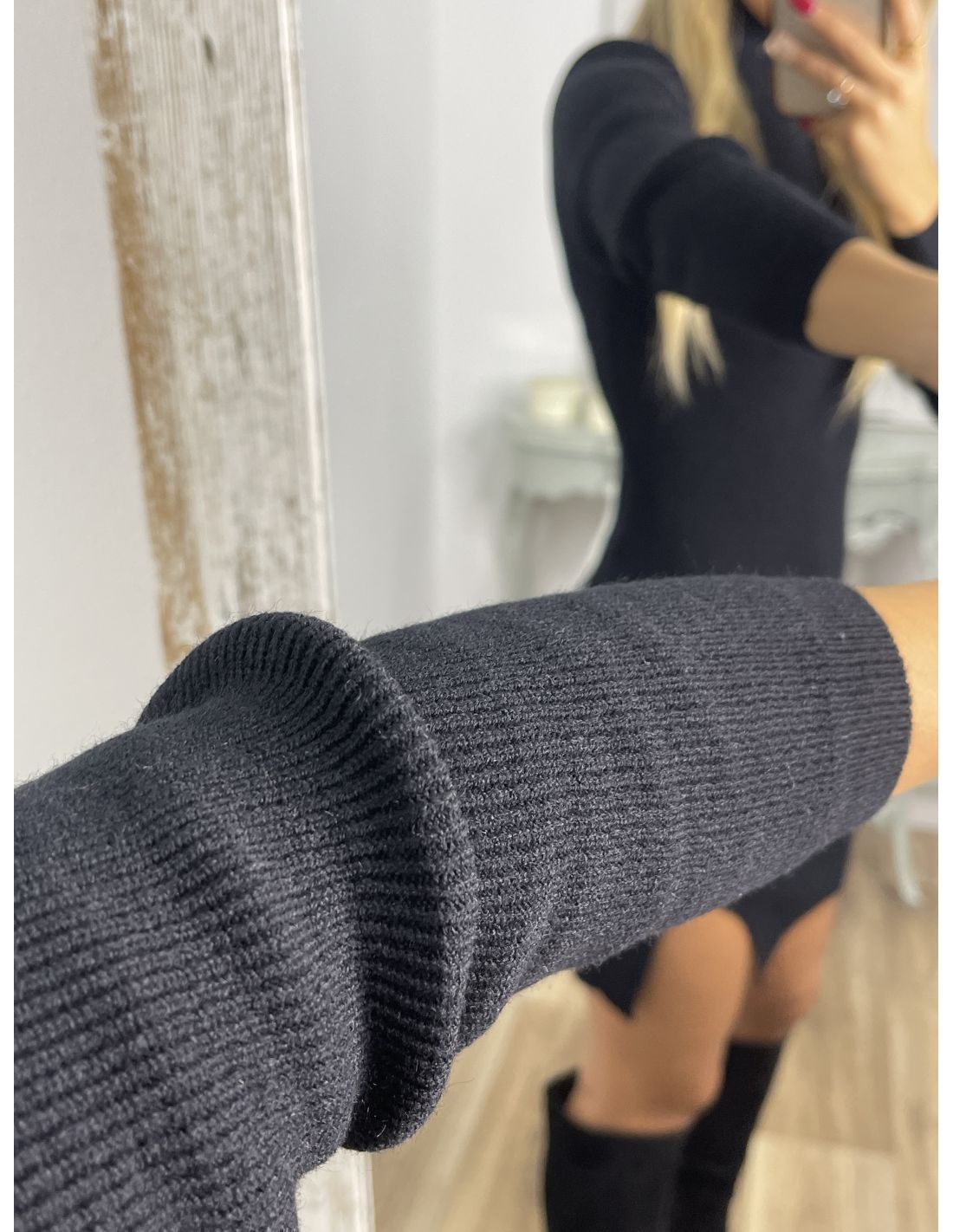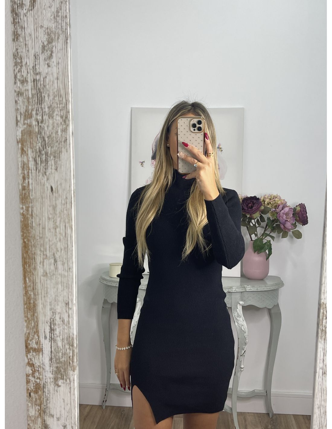 Vestido de punto ajustado, con cuello chimenea, con raja en la zona de la falda.