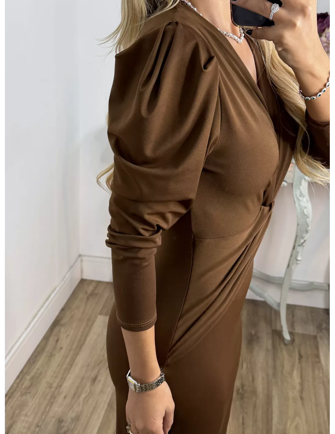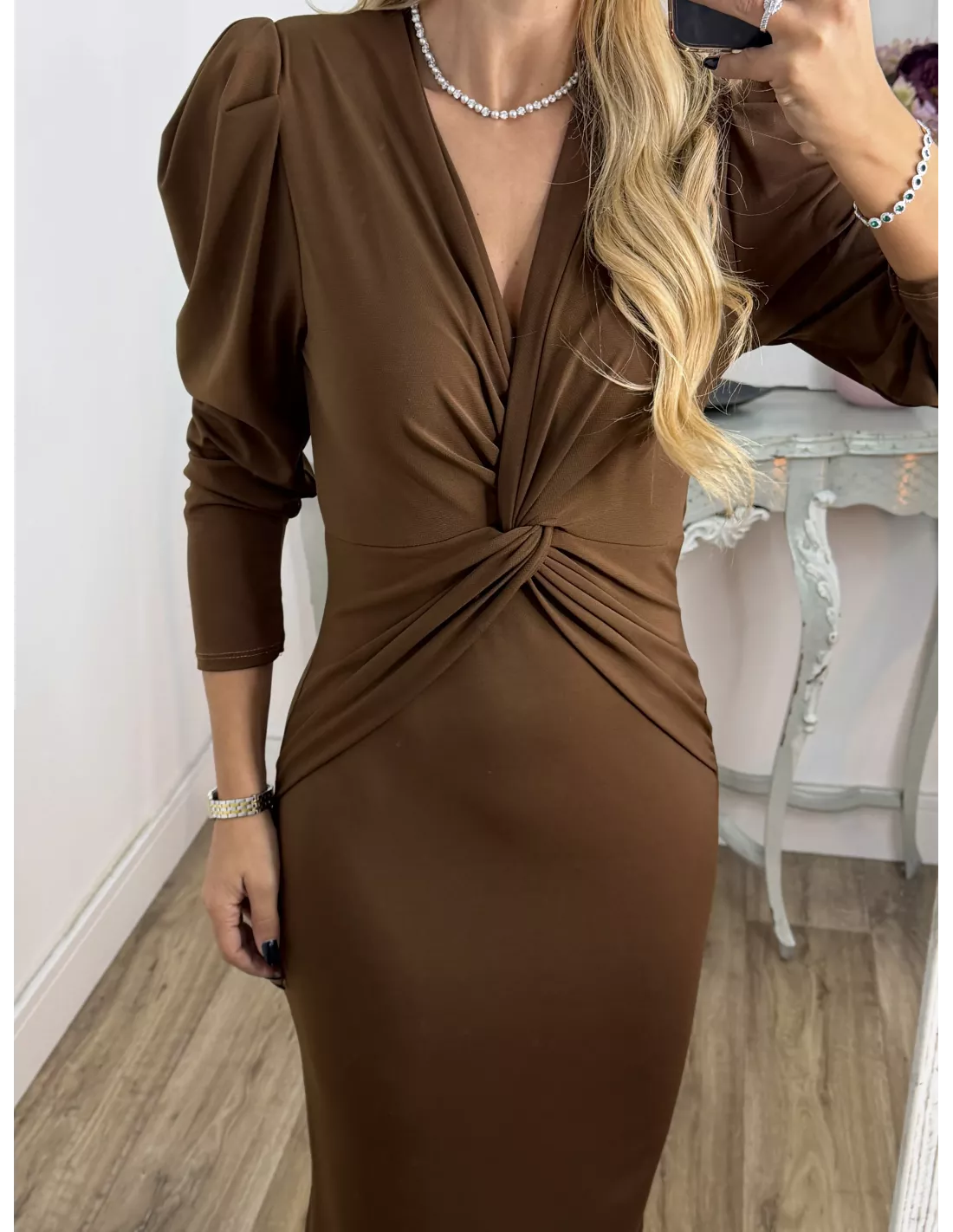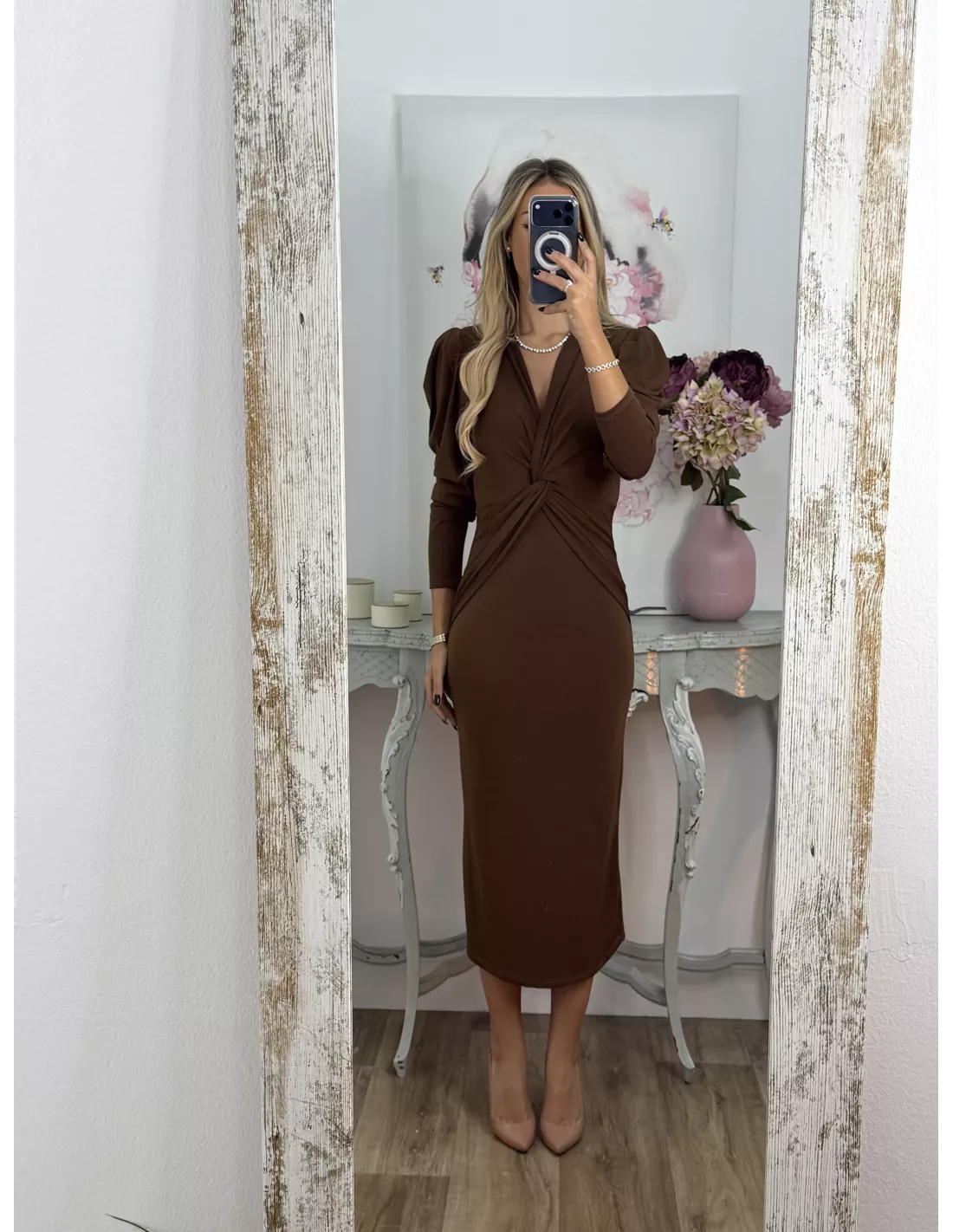 Vestido de punto de corte de corte ajustado. Lleva hombreras y en la zona del pecho lleva un tipo nudo. La parte de atrás lleva un raja y permite caminar bien. No va forrado.