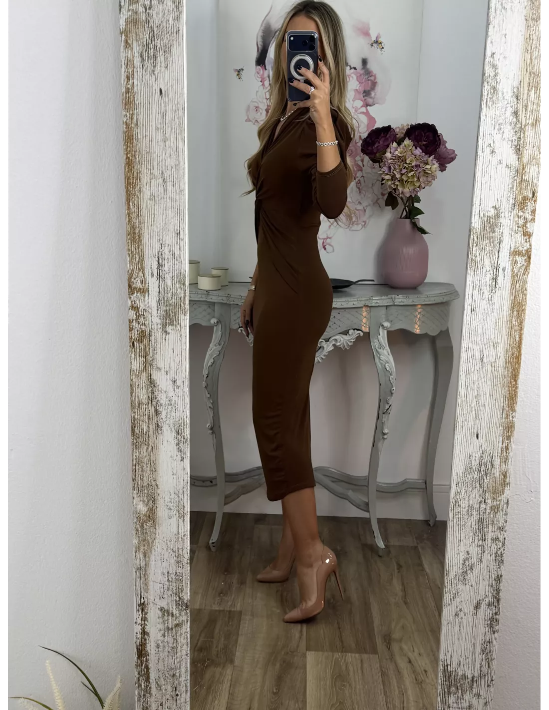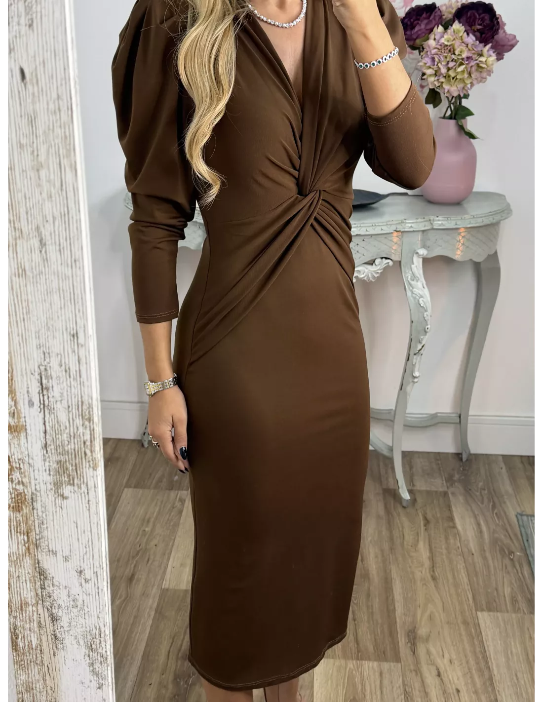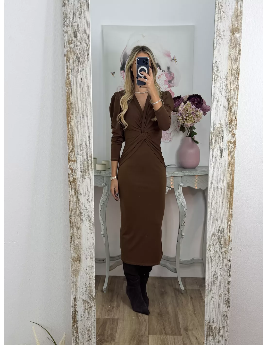 Vestido de punto de corte de corte ajustado. Lleva hombreras y en la zona del pecho lleva un tipo nudo. La parte de atrás lleva un raja y permite caminar bien. No va forrado.