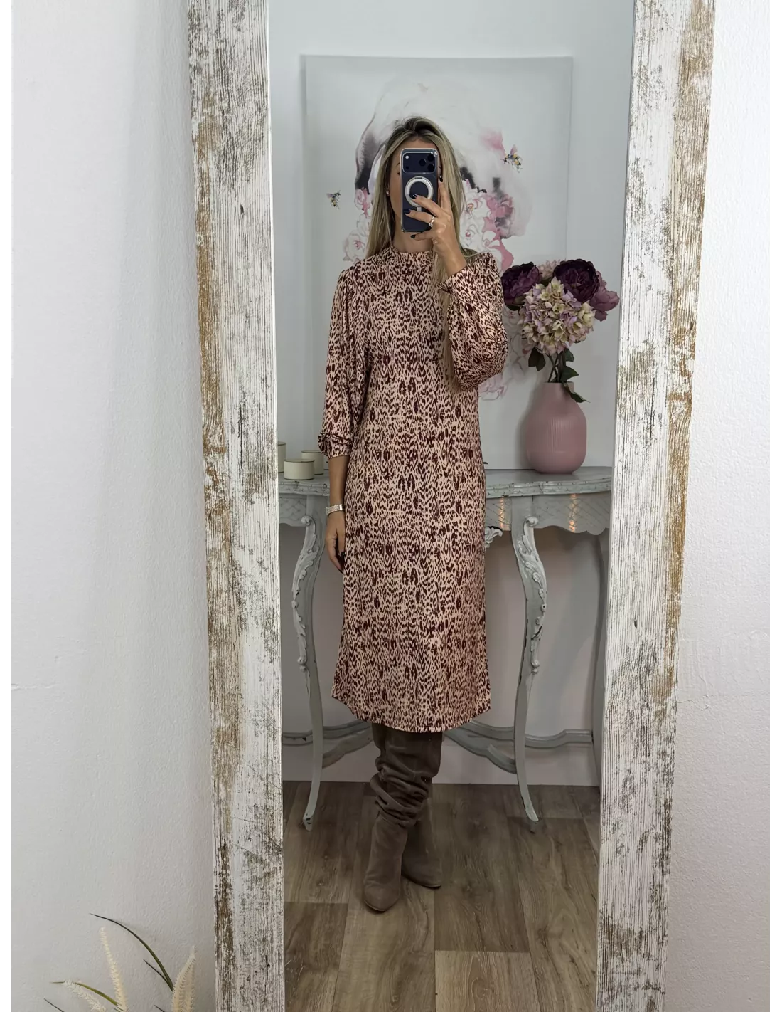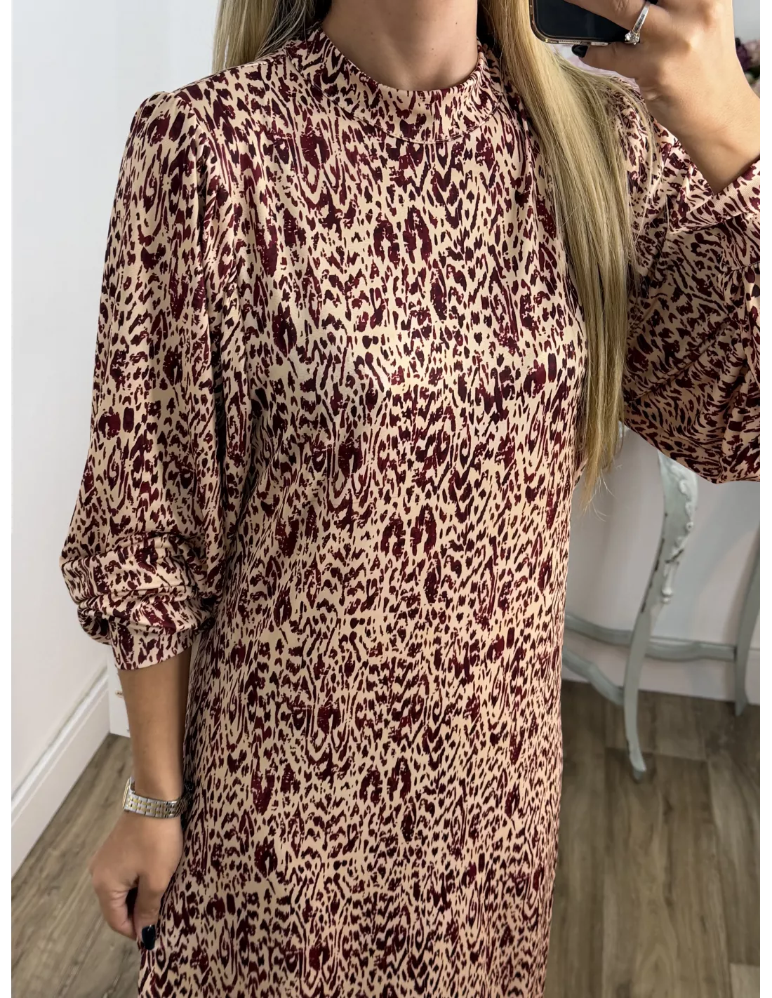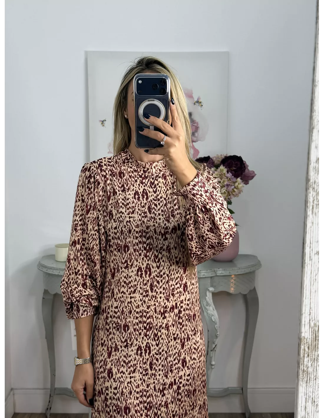Vestido de punto con mucha caída. Tiene cuello Perkin. La manga tipo farol y lleva un puño aproximadamente de unos cuatro dedos que se cierra con un botón. Este corte recto. No va forrado.No incluye el cinturón.