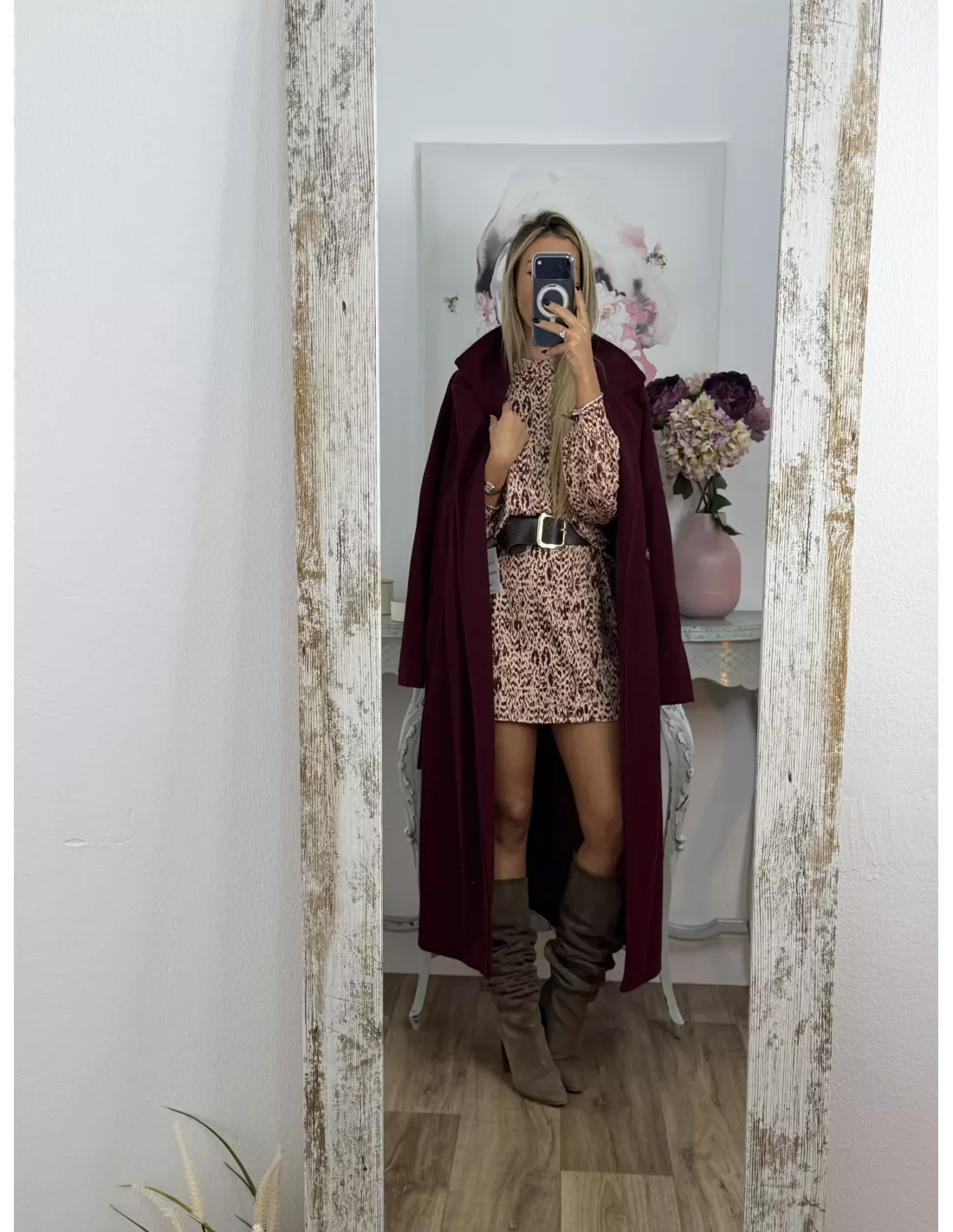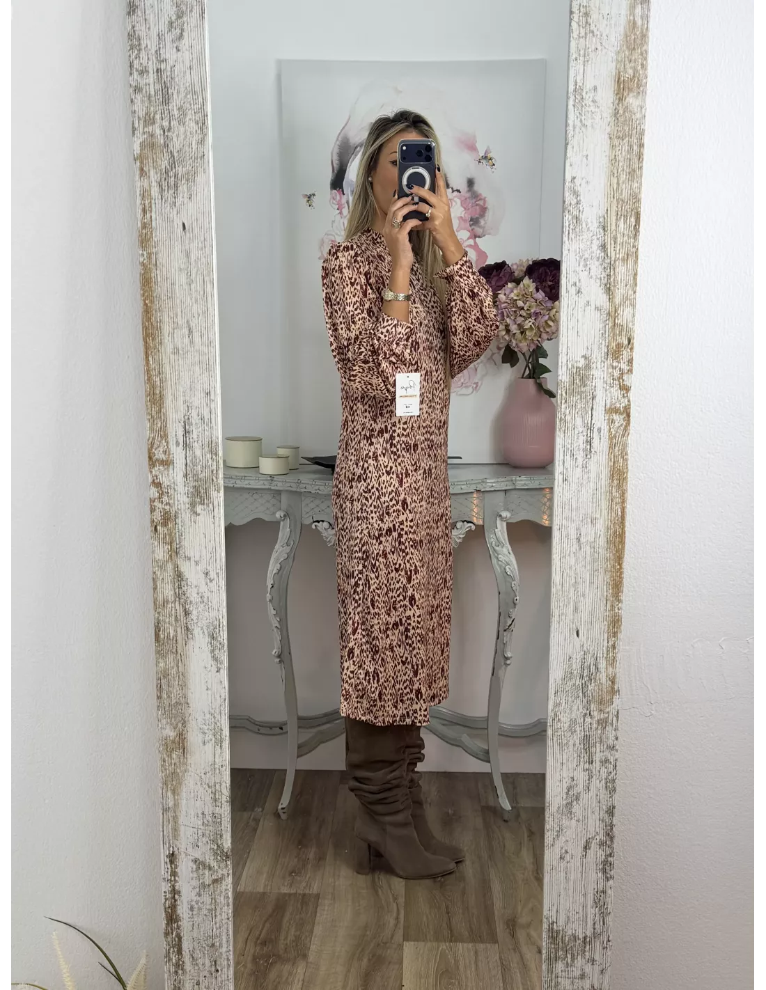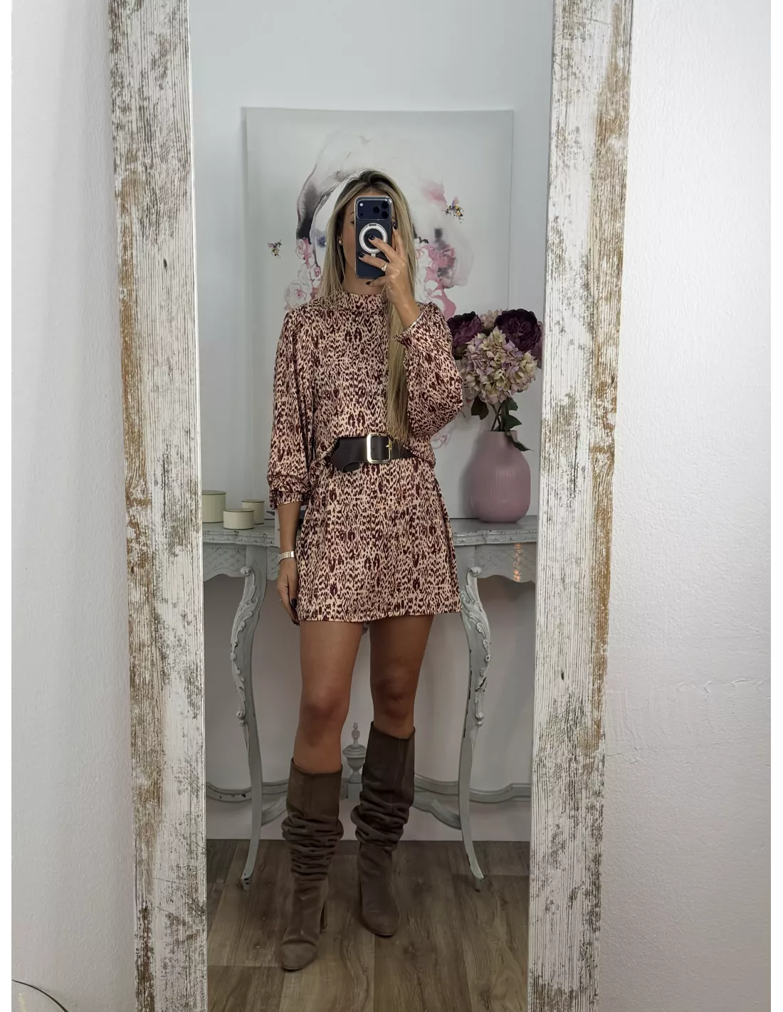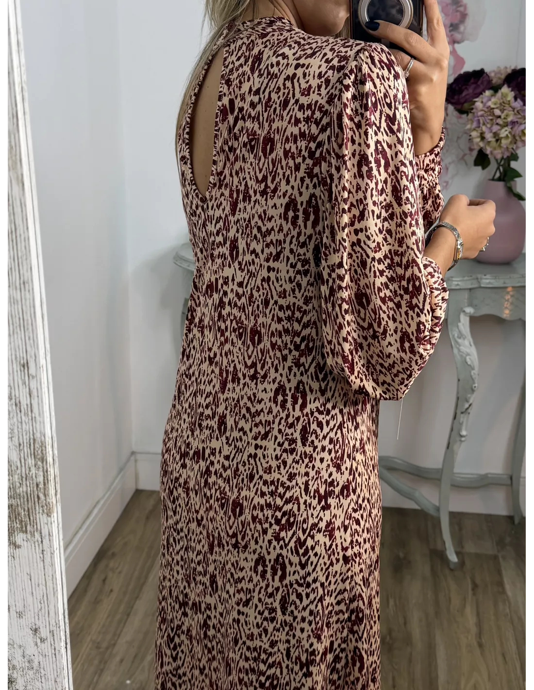 Vestido de punto con mucha caída. Tiene cuello Perkin. La manga tipo farol y lleva un puño aproximadamente de unos cuatro dedos que se cierra con un botón. Este corte recto. No va forrado.No incluye el cinturón.