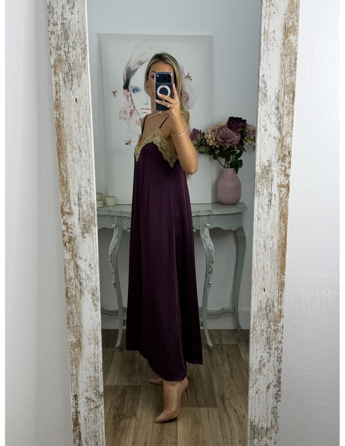 Vestido lencero largo de tejido satinado con la puntilla en la zona del pecho. La tirantes es regulable. La parte de atrás lleva goma. Es de corte amplio.