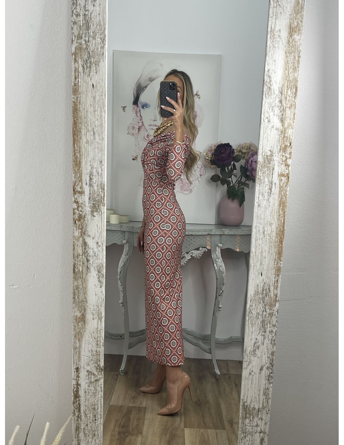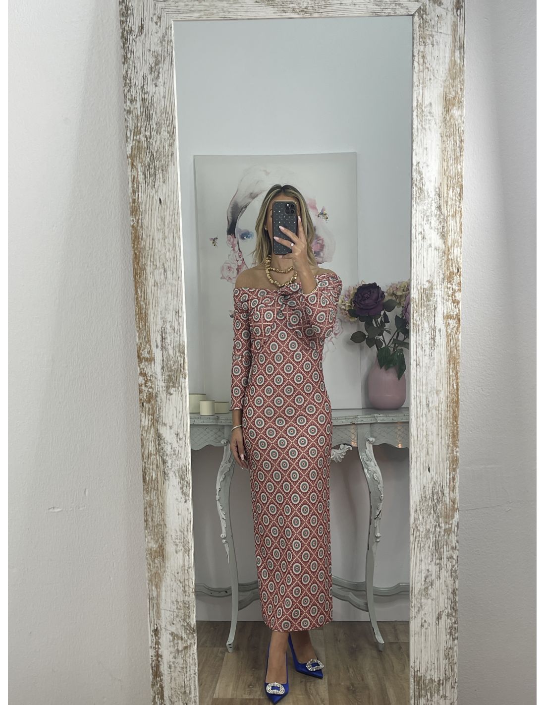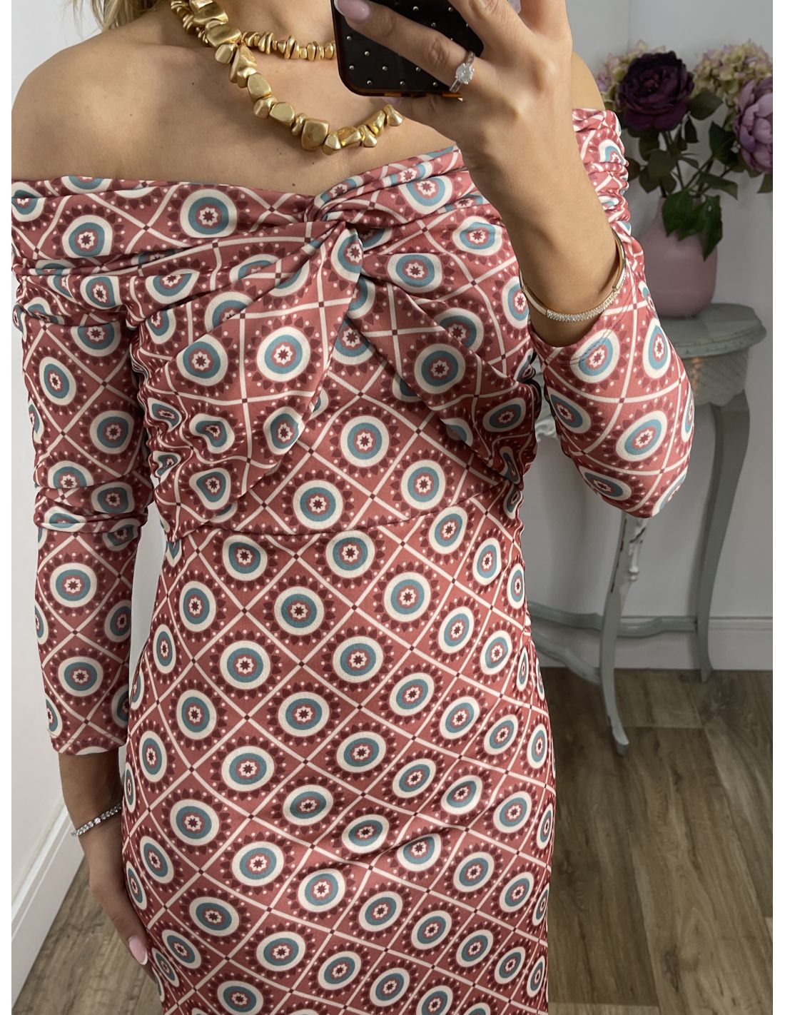 Vestido de escote. Tipo barco en la zona del pecho tiene un nudo. Es un tejido de punto que es grueso no es fino no marca ni se transparenta. El corte es ajustado.