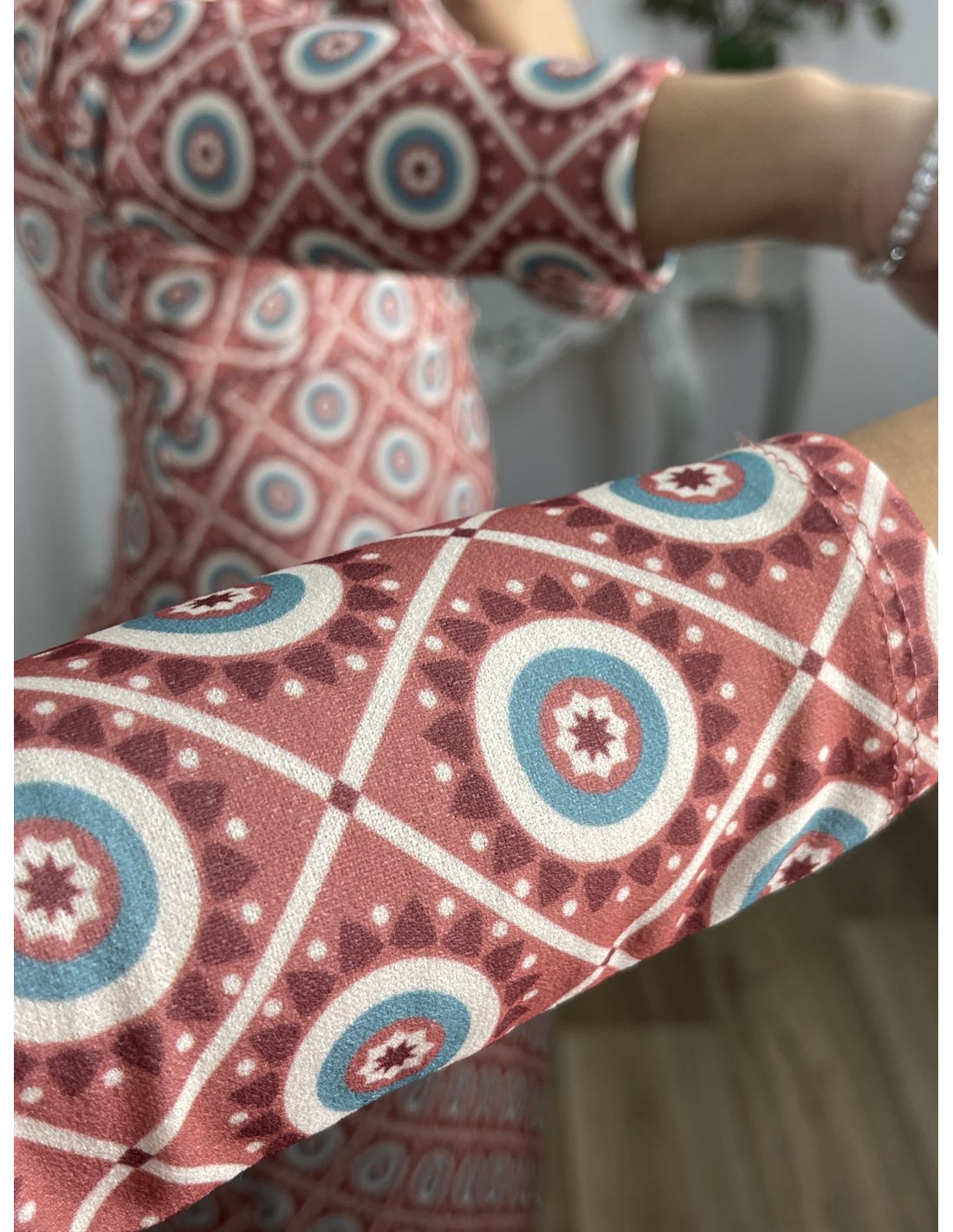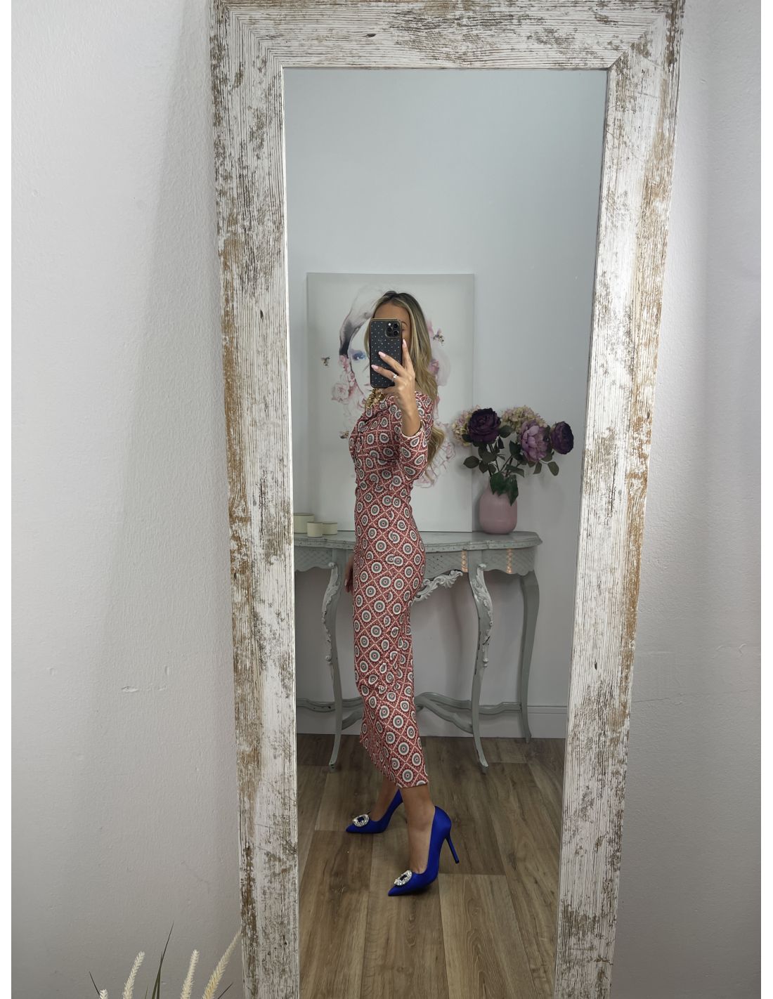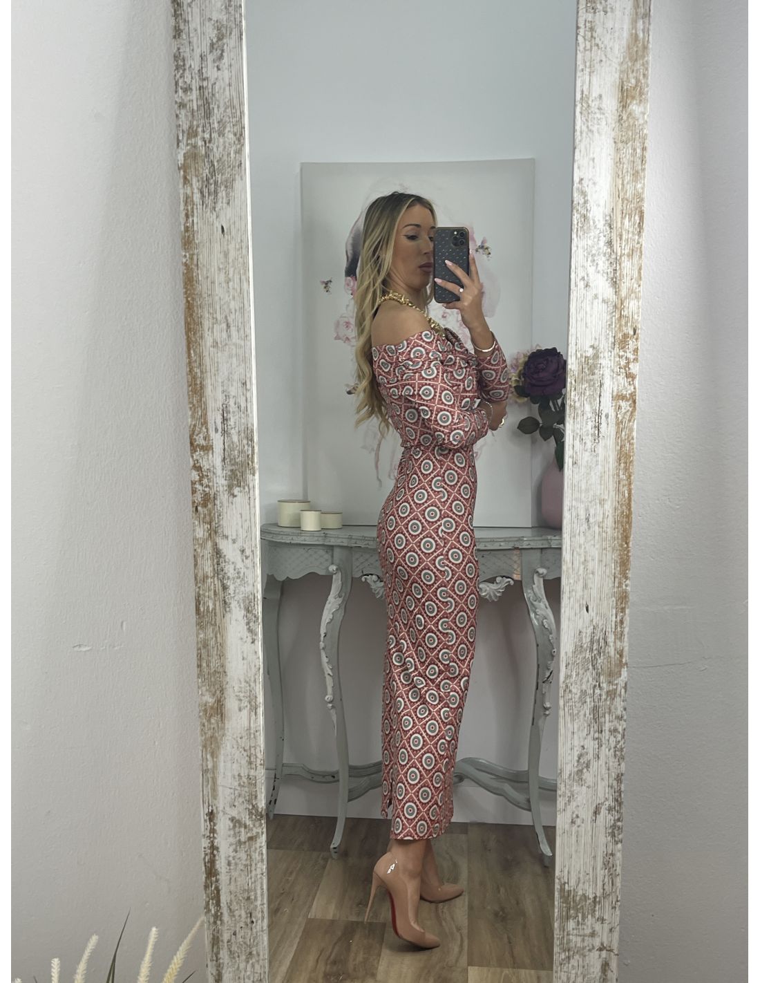Vestido de escote. Tipo barco en la zona del pecho tiene un nudo. Es un tejido de punto que es grueso no es fino no marca ni se transparenta. El corte es ajustado.