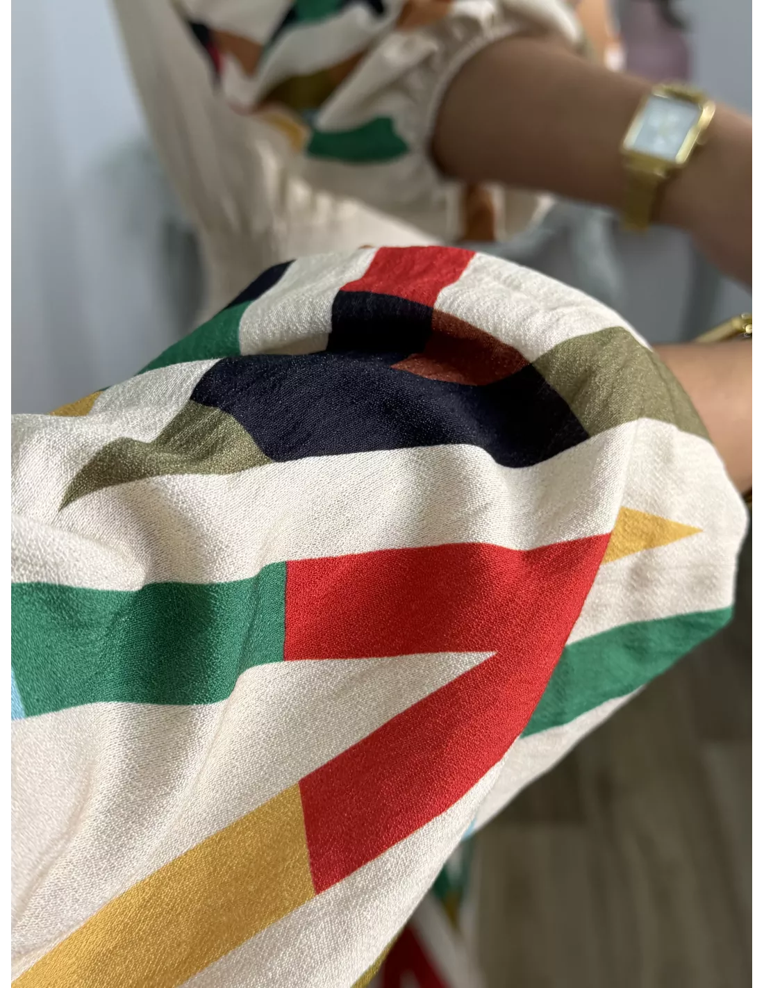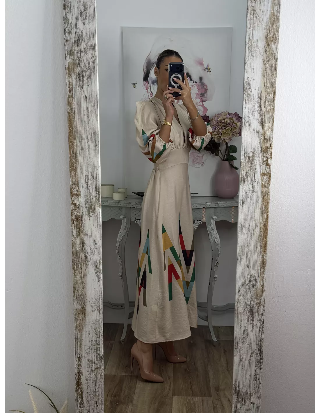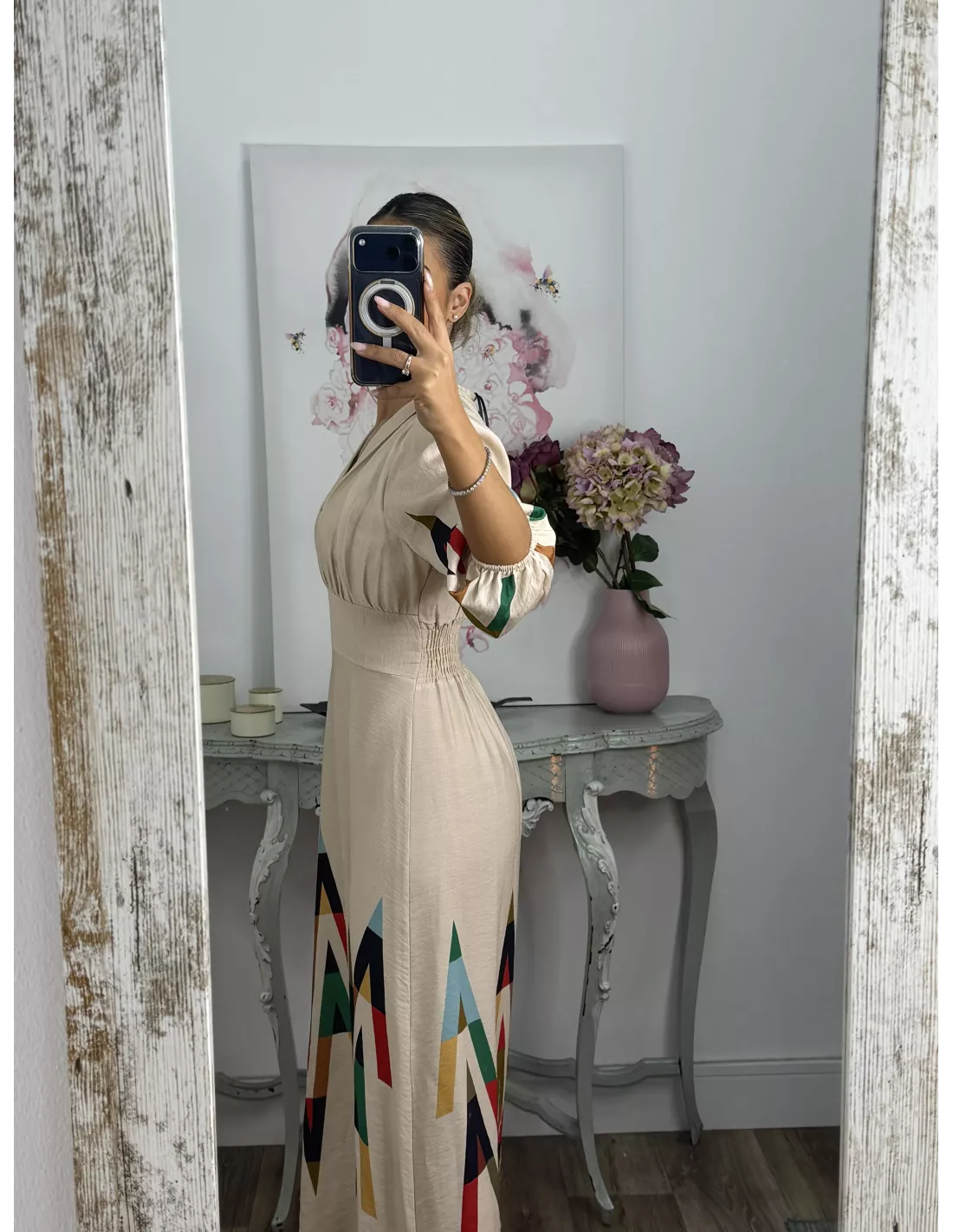 Vestido de estove V, que lleva un corte debajo del pecho y tiene goma en la espalda. Es de manga francesa y tiene goma. No va forrado.