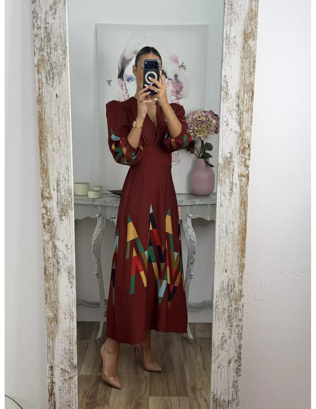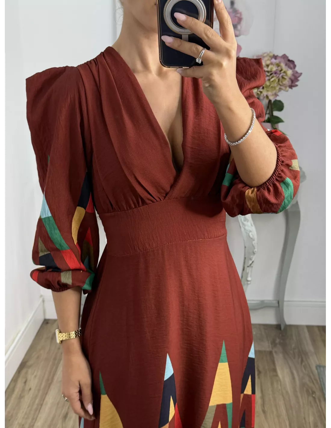 Vestido de estove V, que lleva un corte debajo del pecho y tiene goma en la espalda. Es de manga francesa y tiene goma. No va forrado.