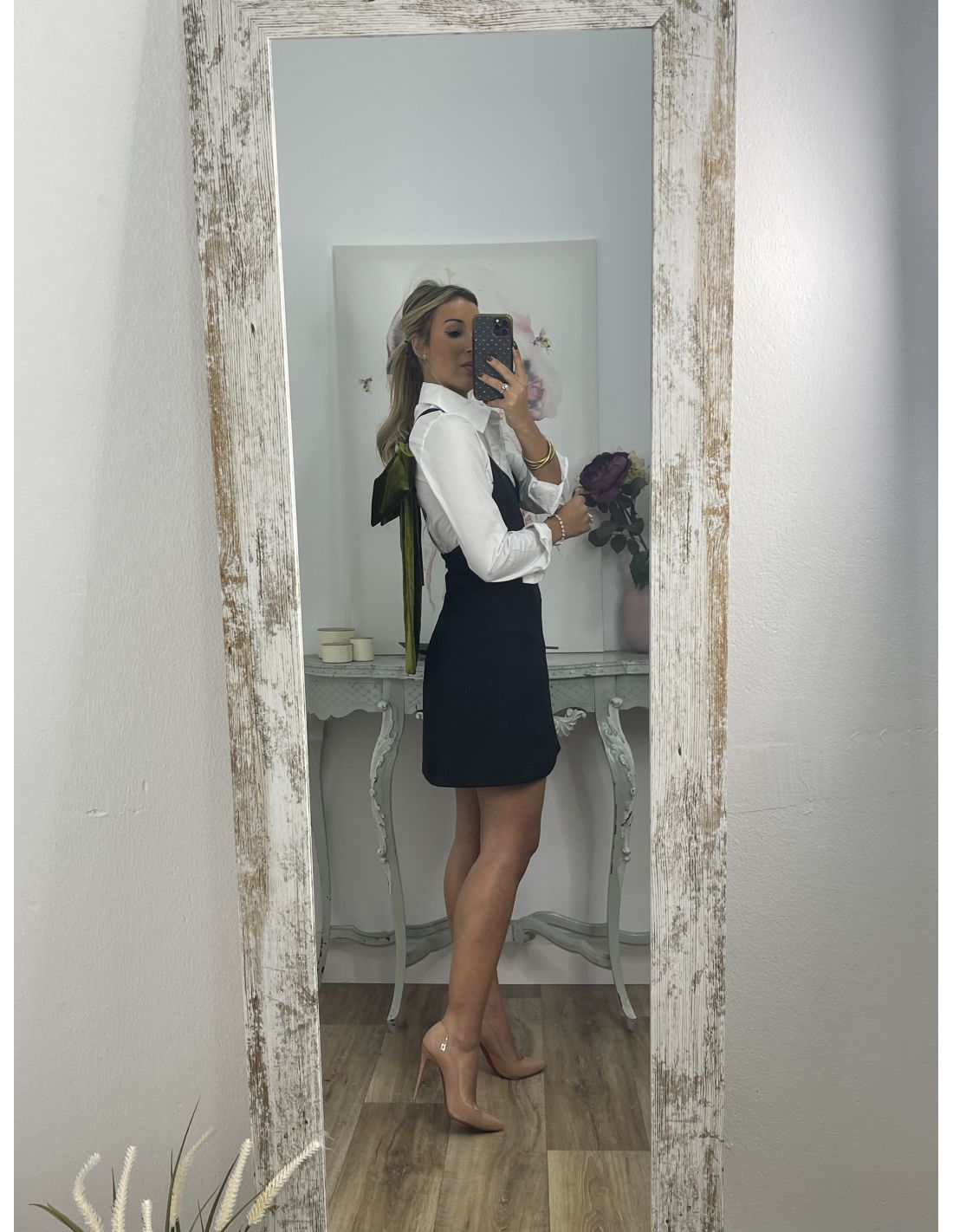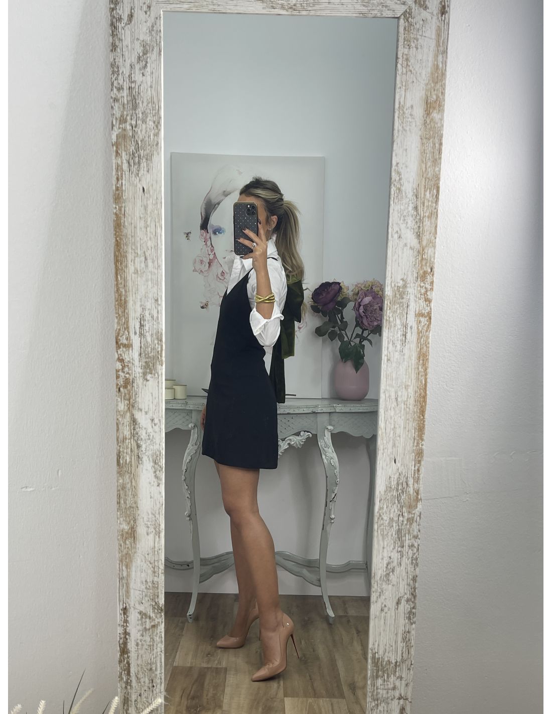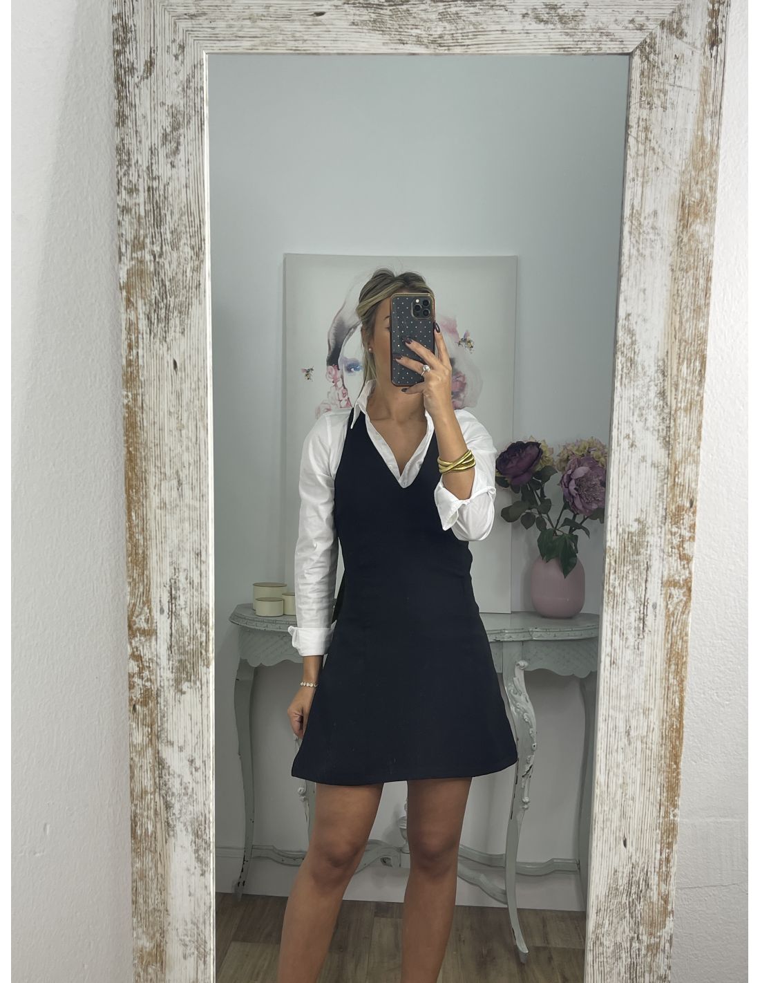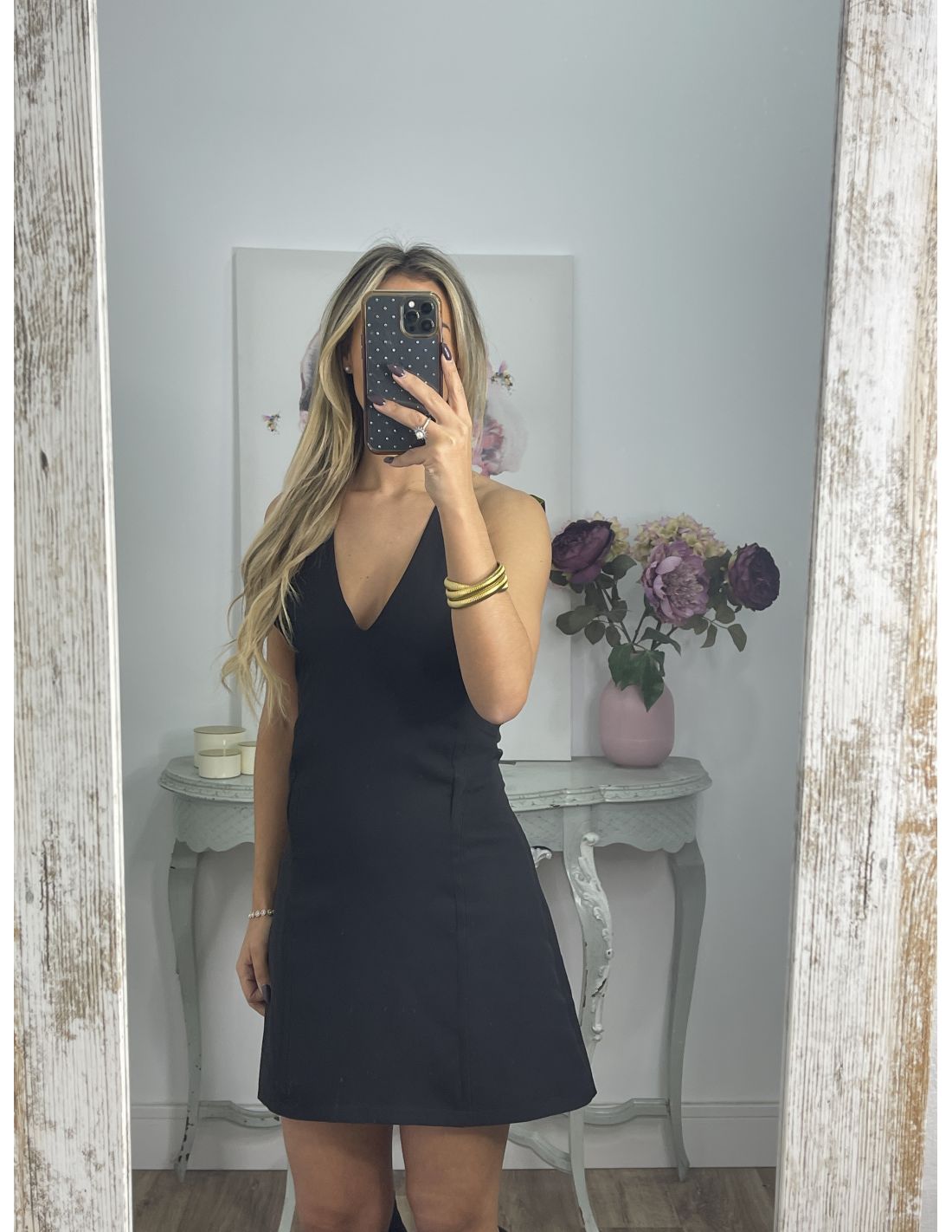 Vestido negro que lleva la espalda al aire con un lazo grande de terciopelo en la zona del cuello. Lleva cremallera invisible en la parte de atrás de la espalda. Tiene pinzas en la zona del pecho.