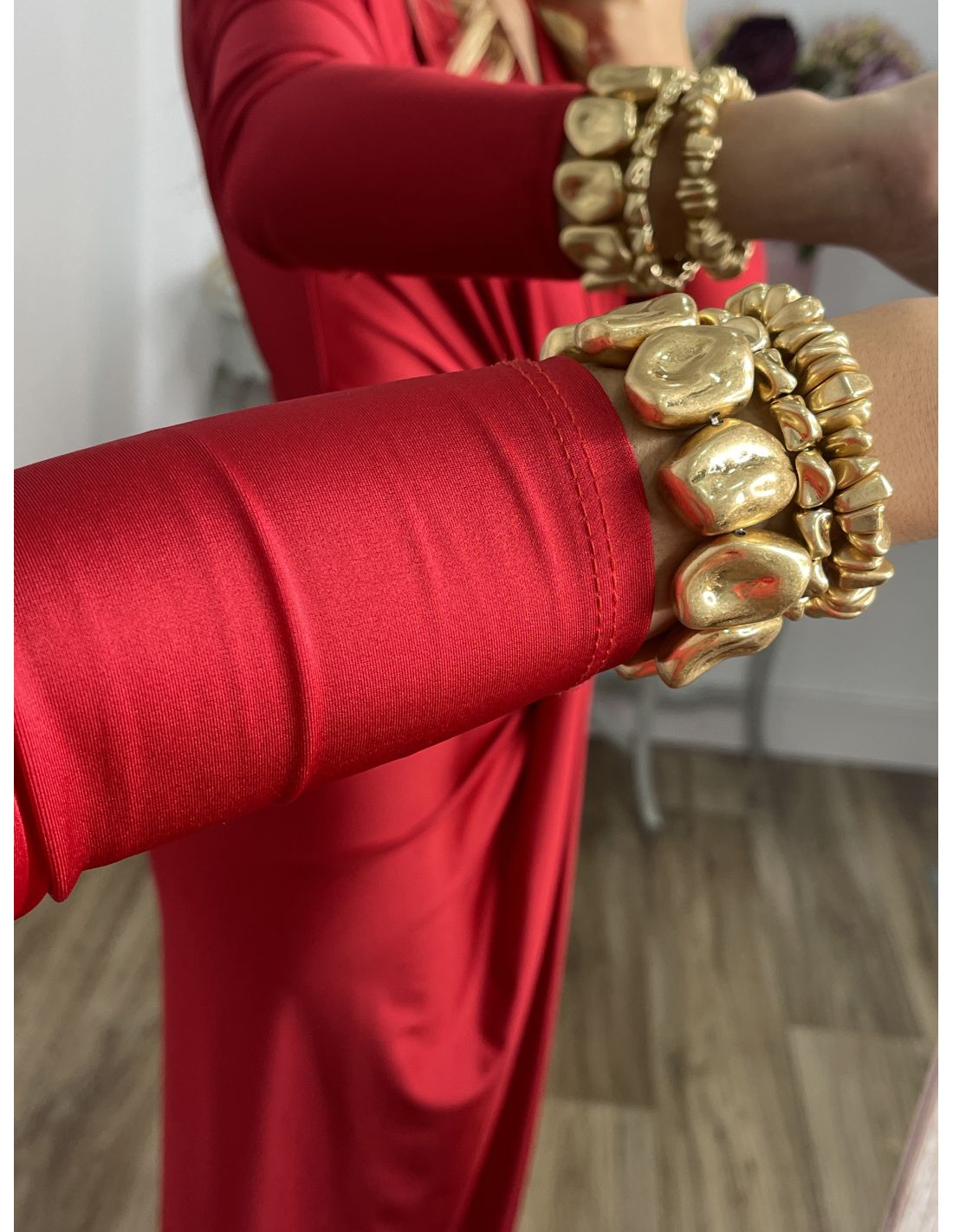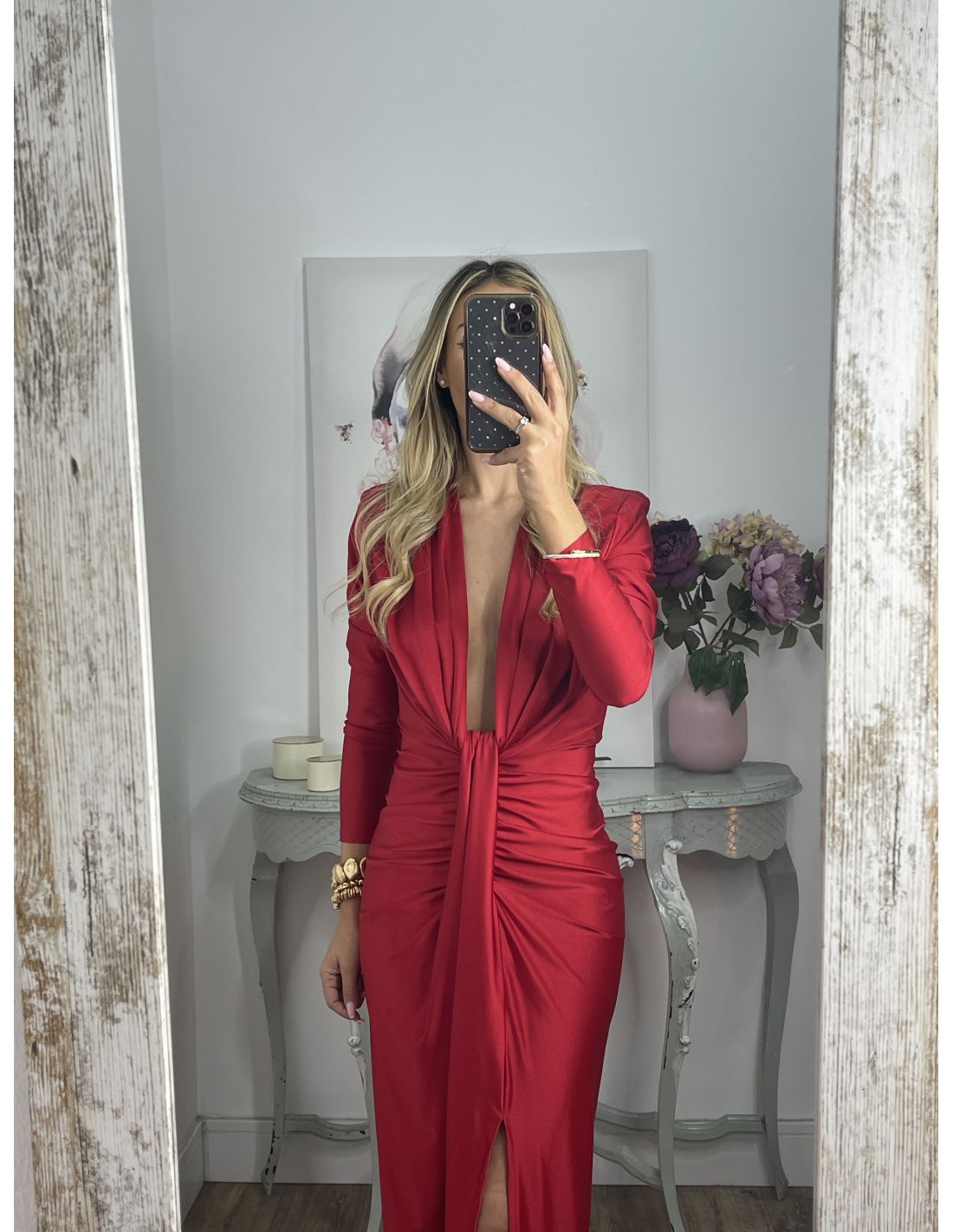Vestido de punto con escote en V, lleva hombreras. El corte es ajustado, en la zona delantera va fruncida y tiene raja.