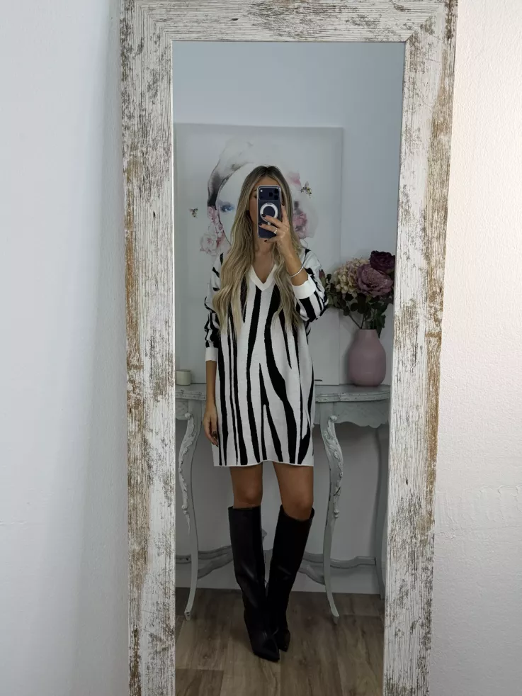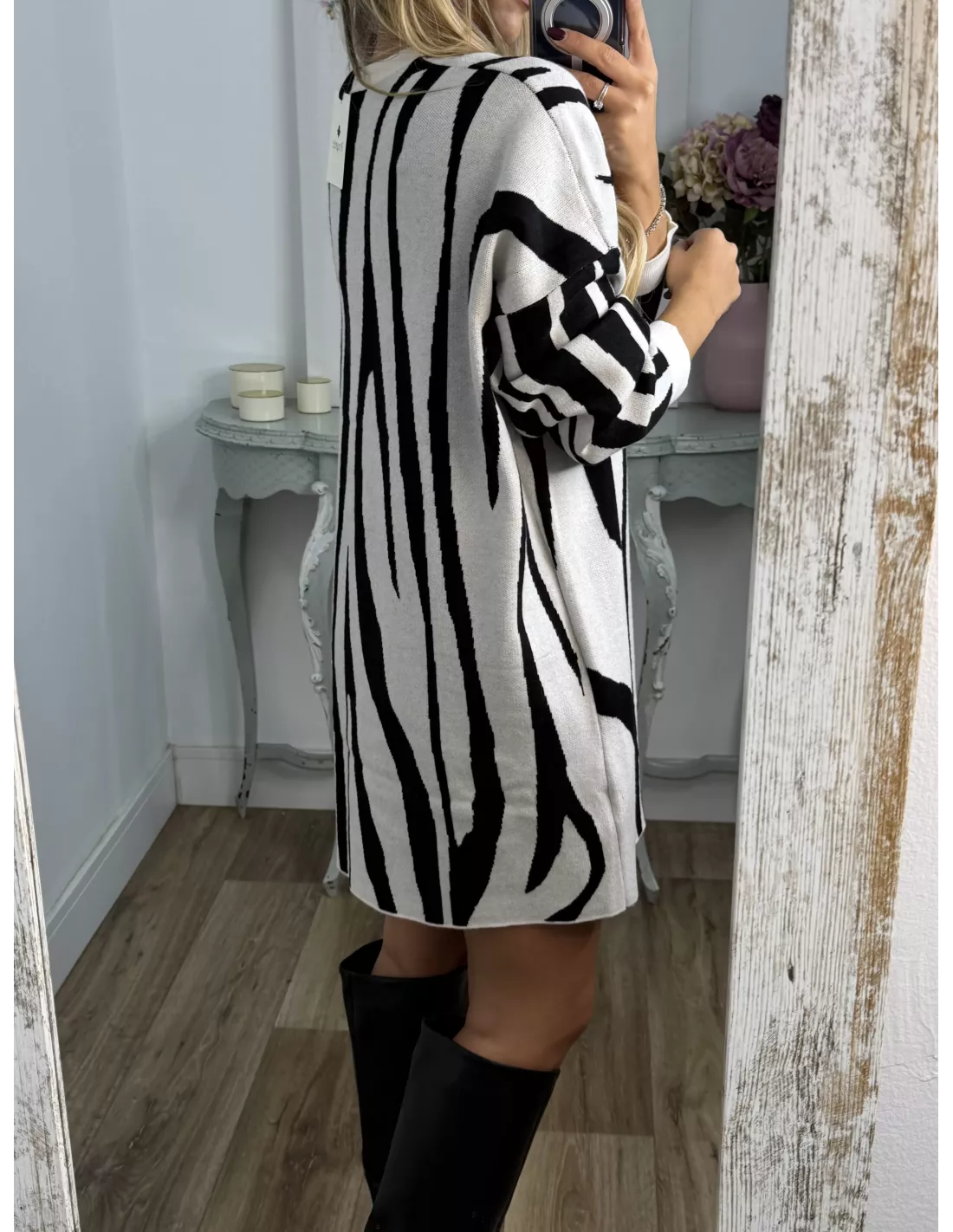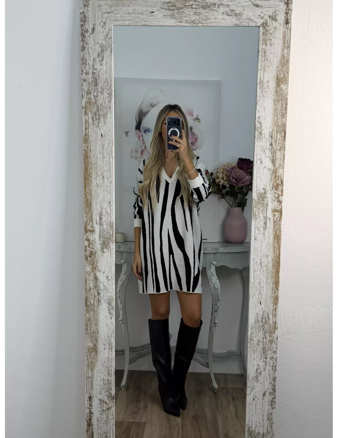 Vestido de punto, con cuello de pico. Es de corte recto. Tiene un tacto muy suave.