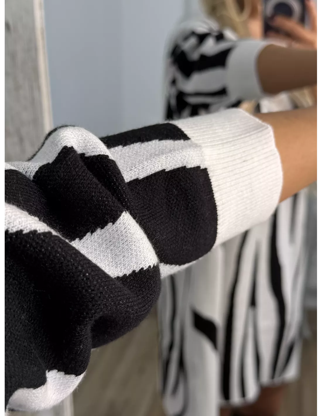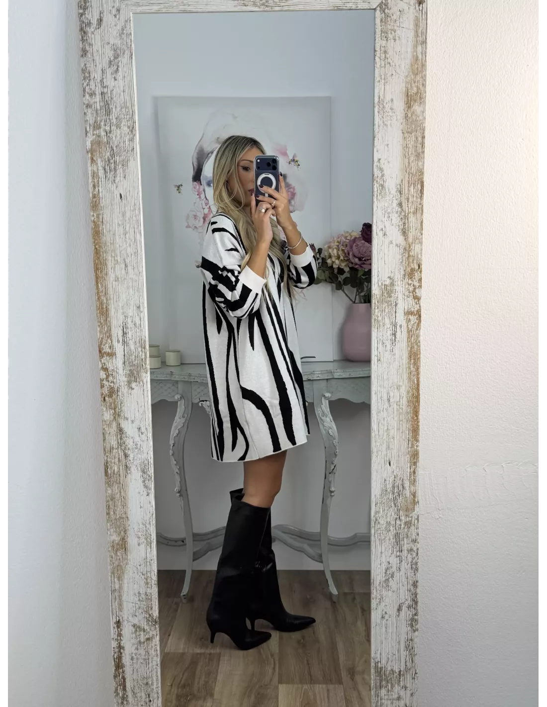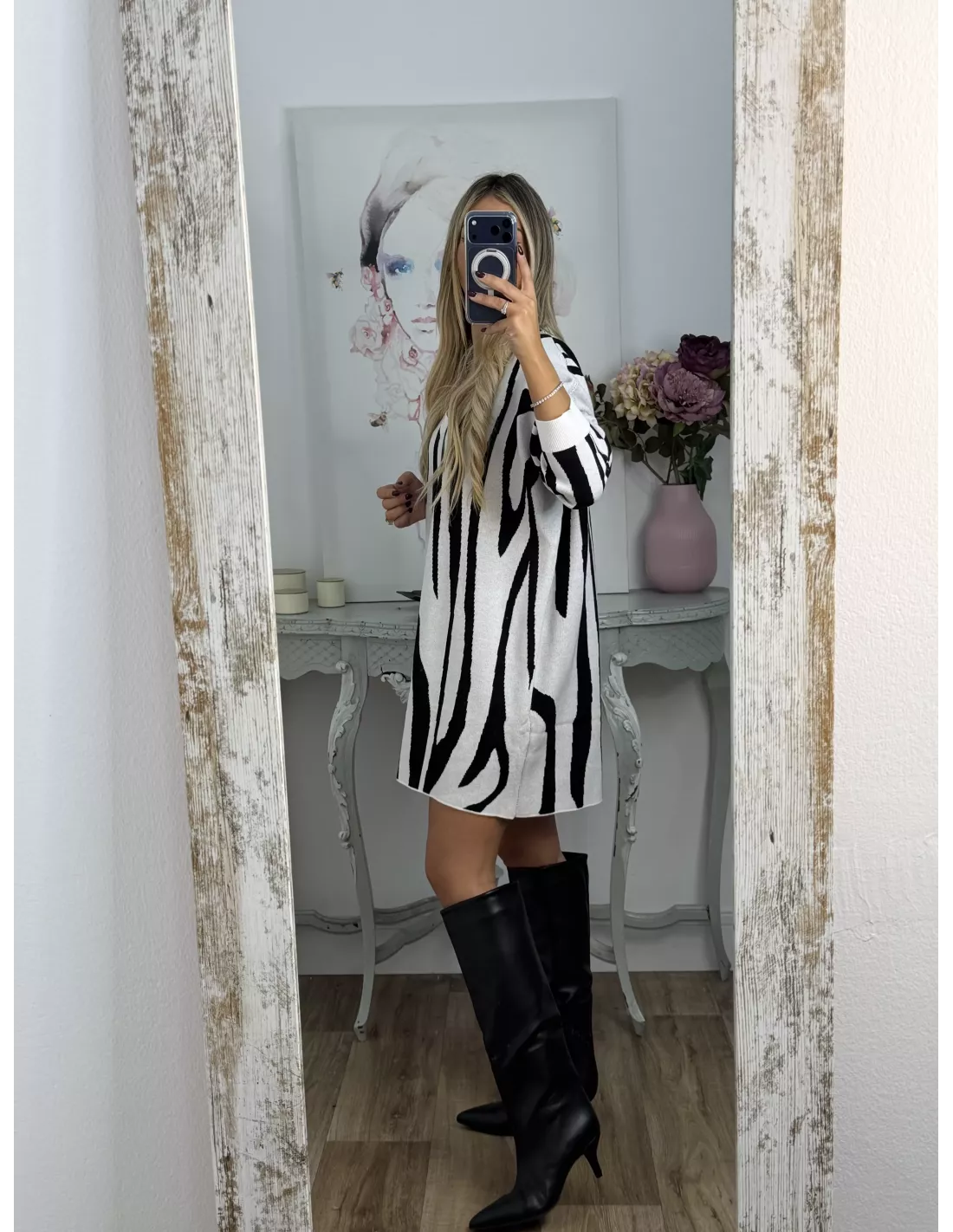 Vestido de punto, con cuello de pico. Es de corte recto. Tiene un tacto muy suave.