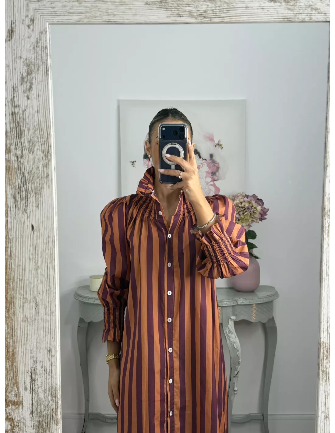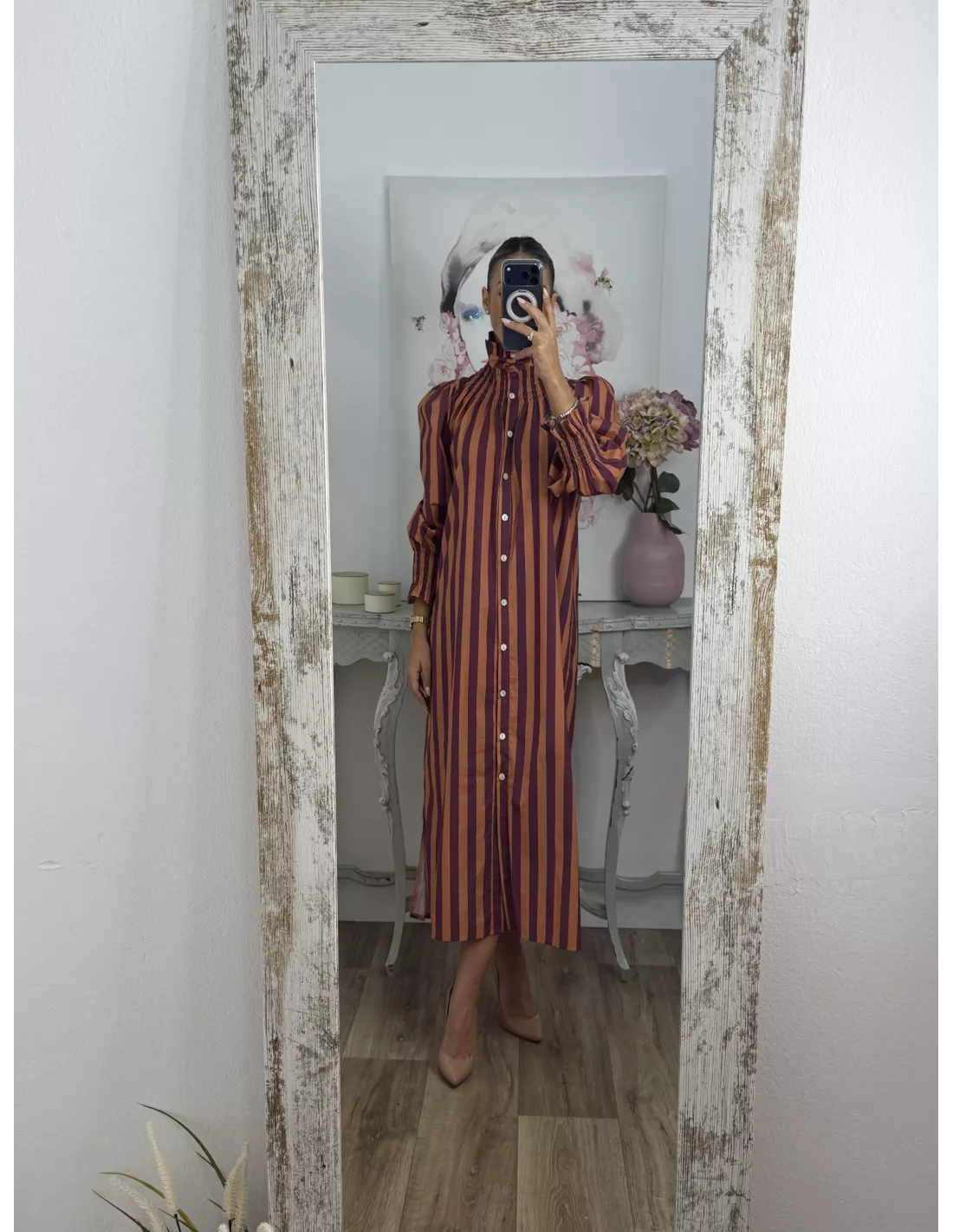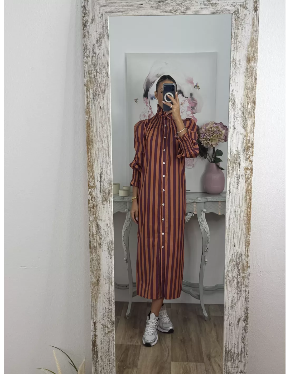 Vestido de rayas ancha de corte camisero completamente abotonado. No va forrado. La zona del cuello y de los puños va engomada. El cuello queda levantado hacia arriba.
