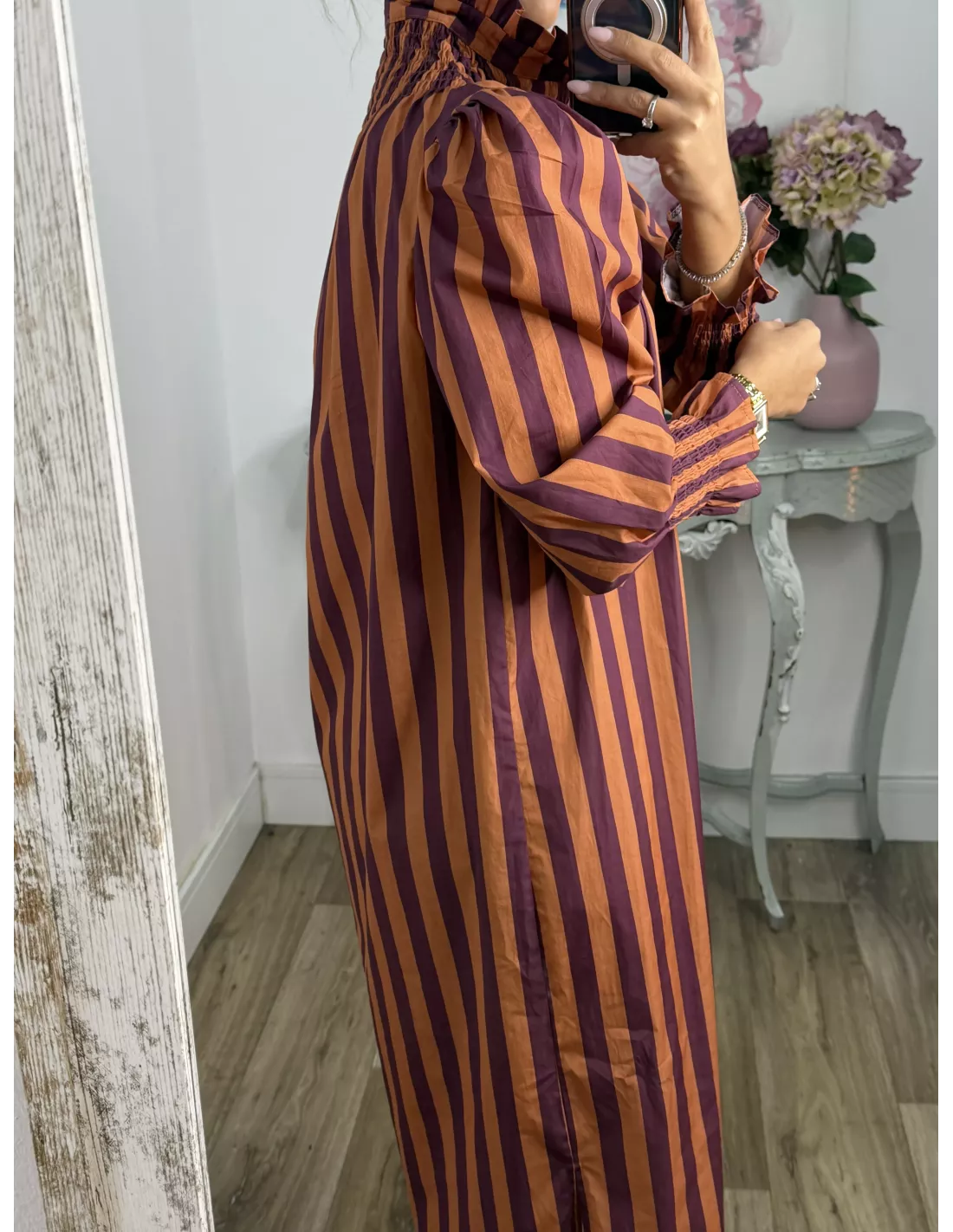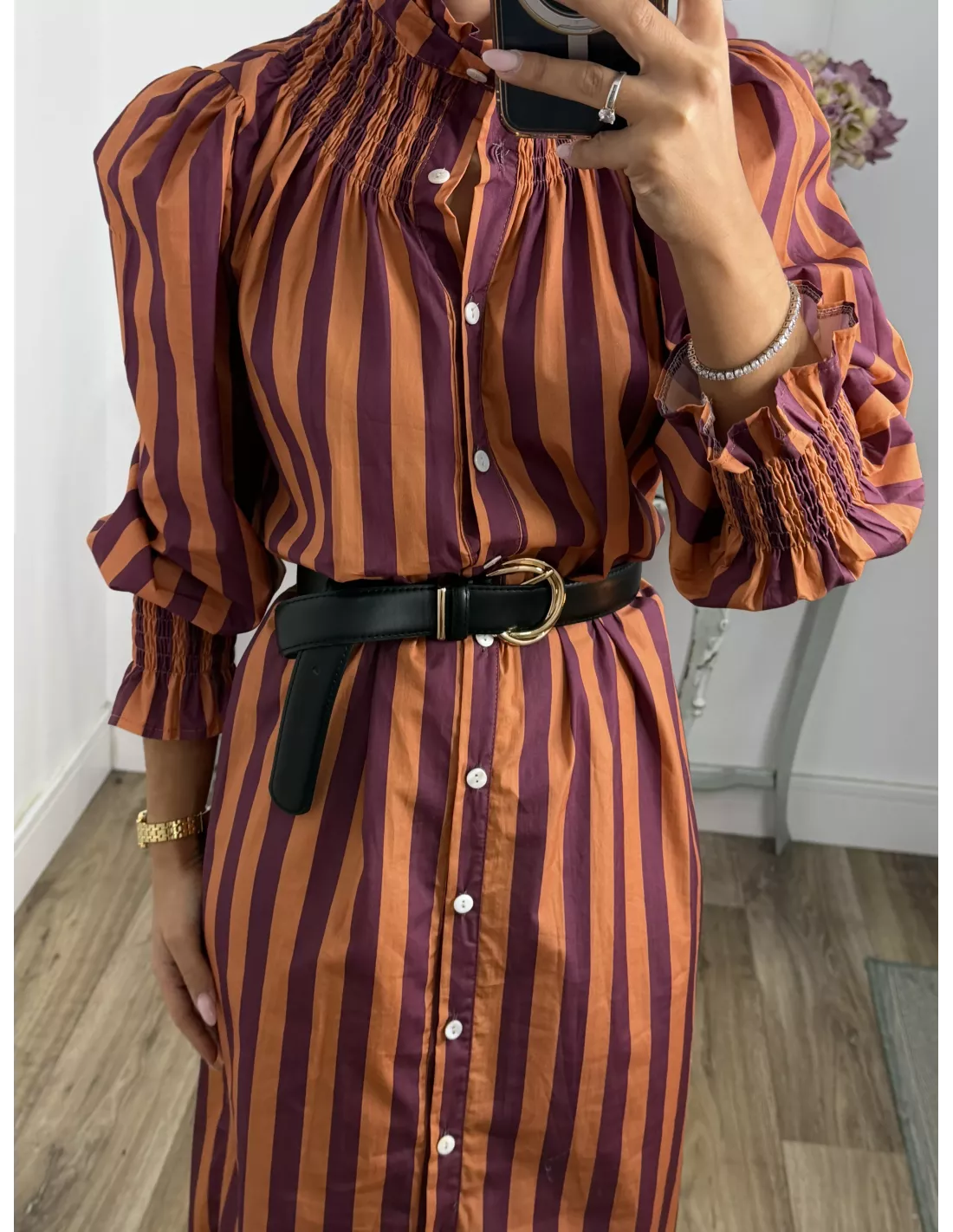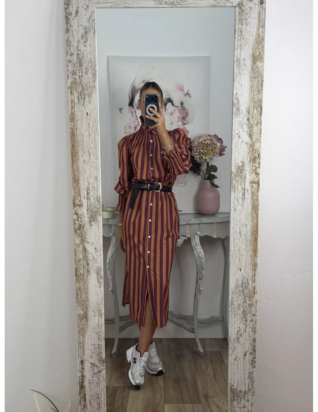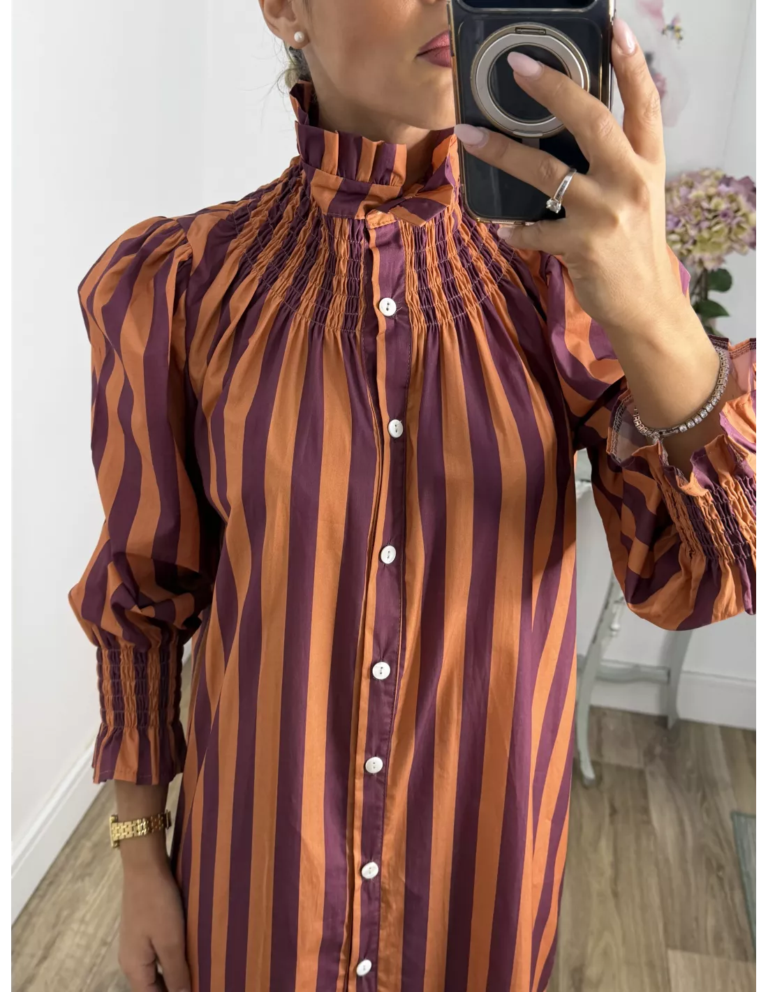 Vestido de rayas ancha de corte camisero completamente abotonado. No va forrado. La zona del cuello y de los puños va engomada. El cuello queda levantado hacia arriba.