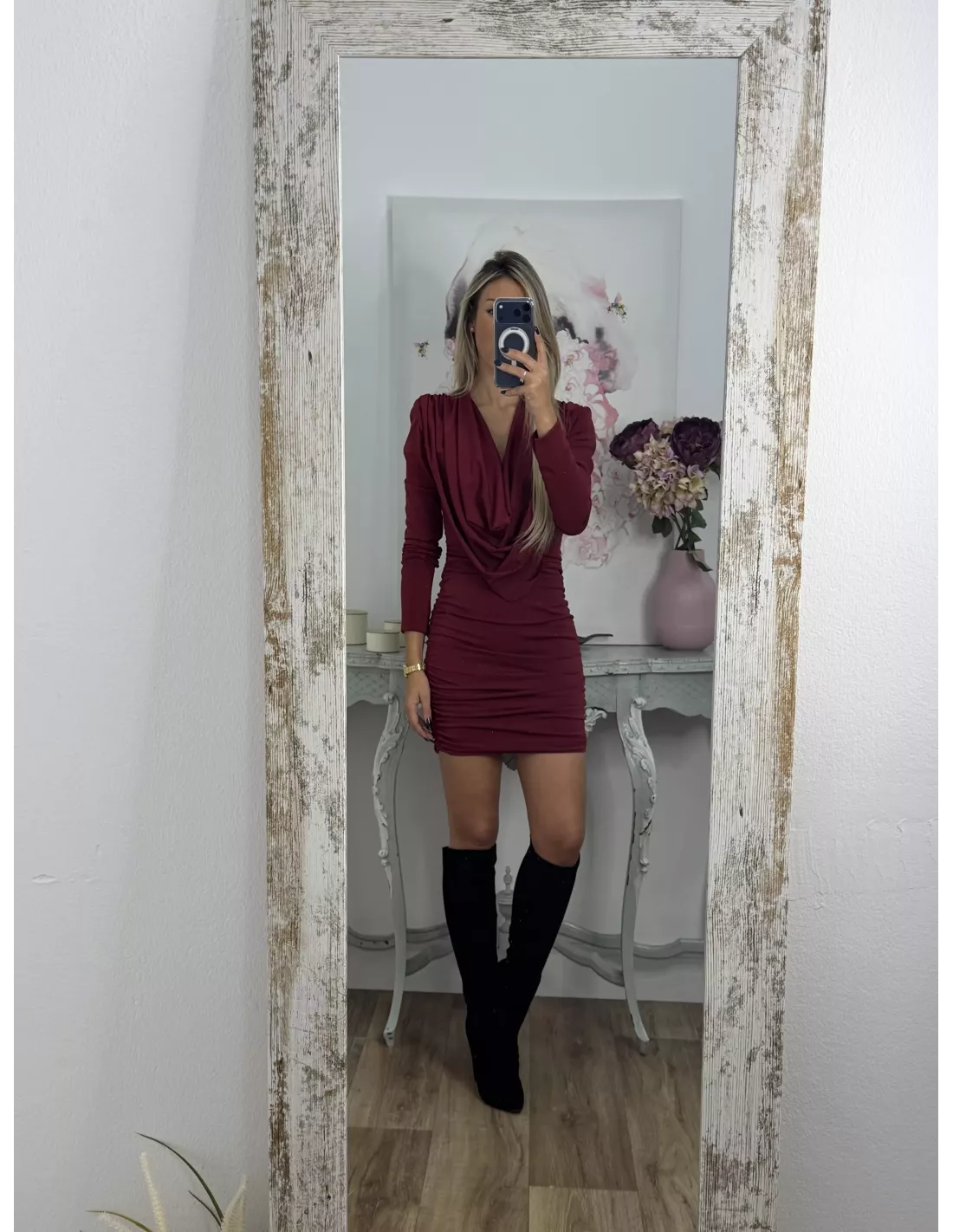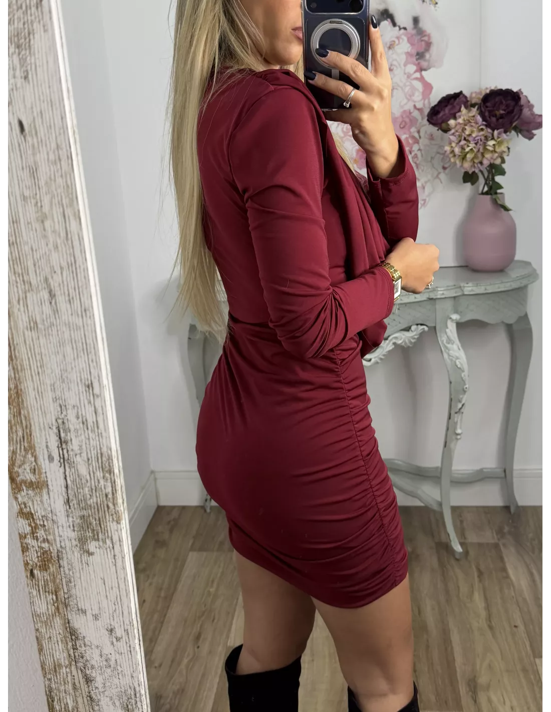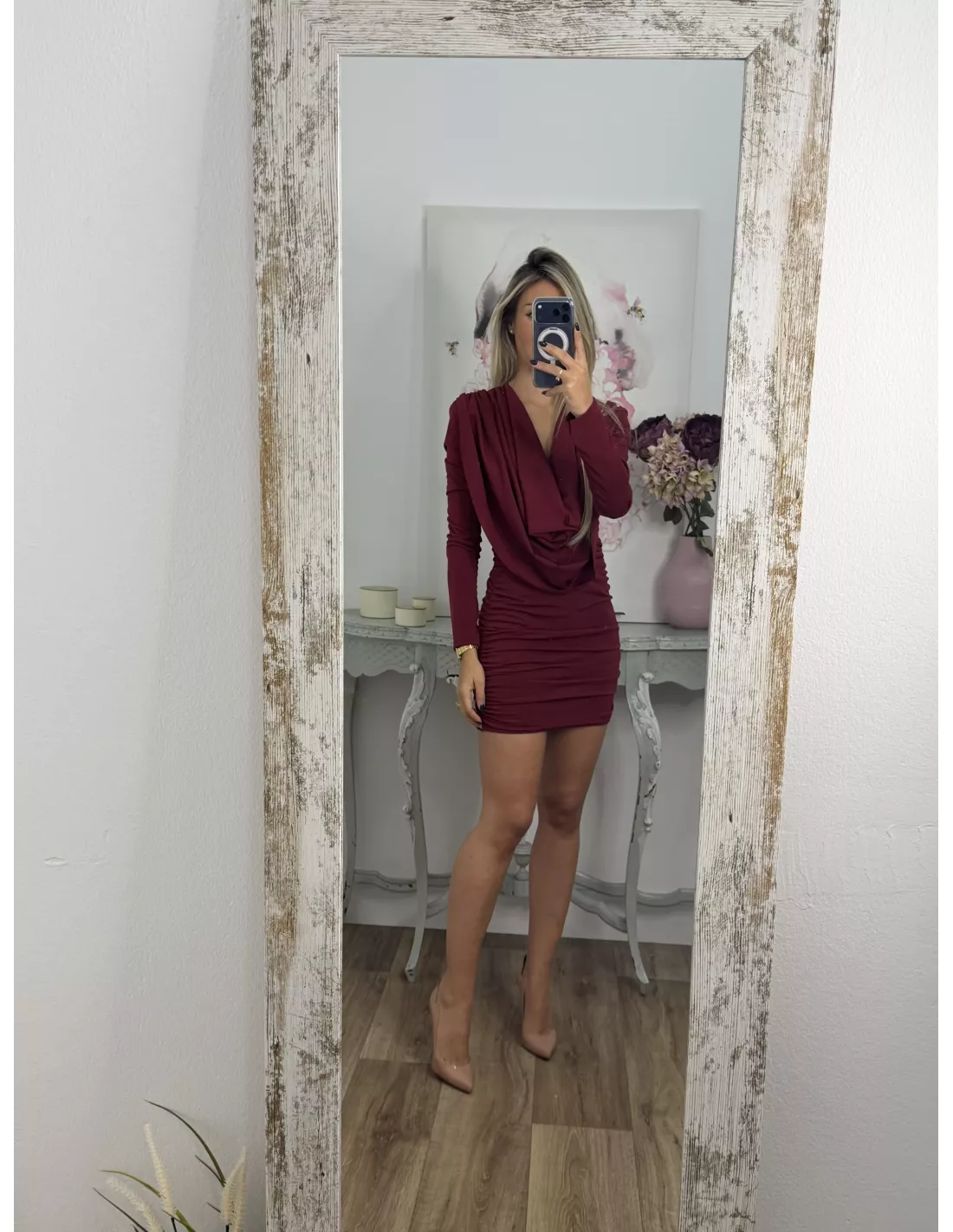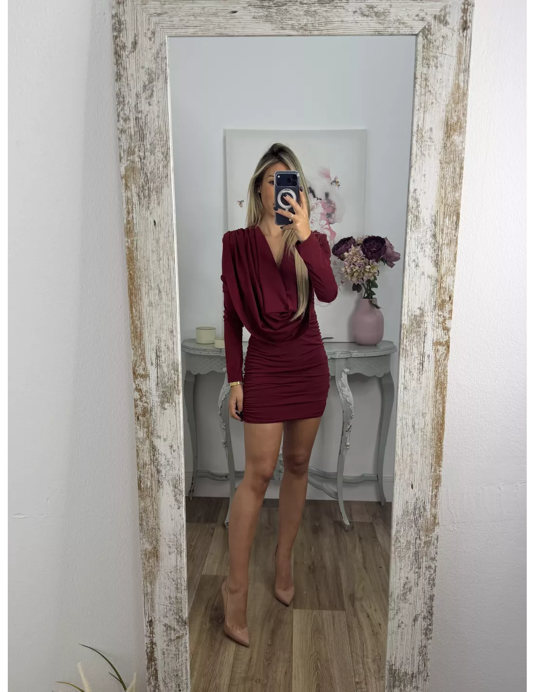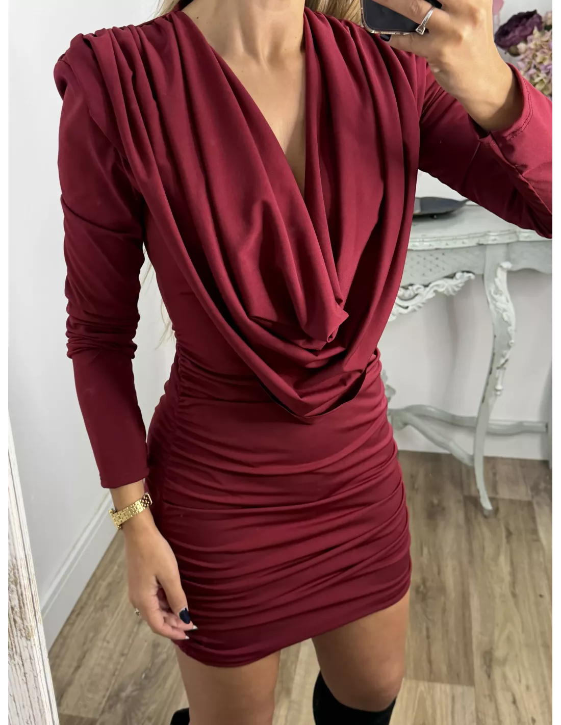 Vestido de licra de corte ajustado y corto. La zona de la falda va fruncida, tiene hombreras. La zona del escote es tipo cascada que va cosida a los hombros. Va completamente forrado.