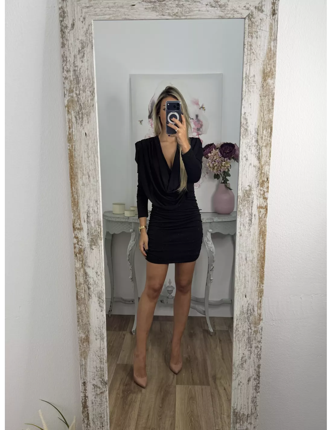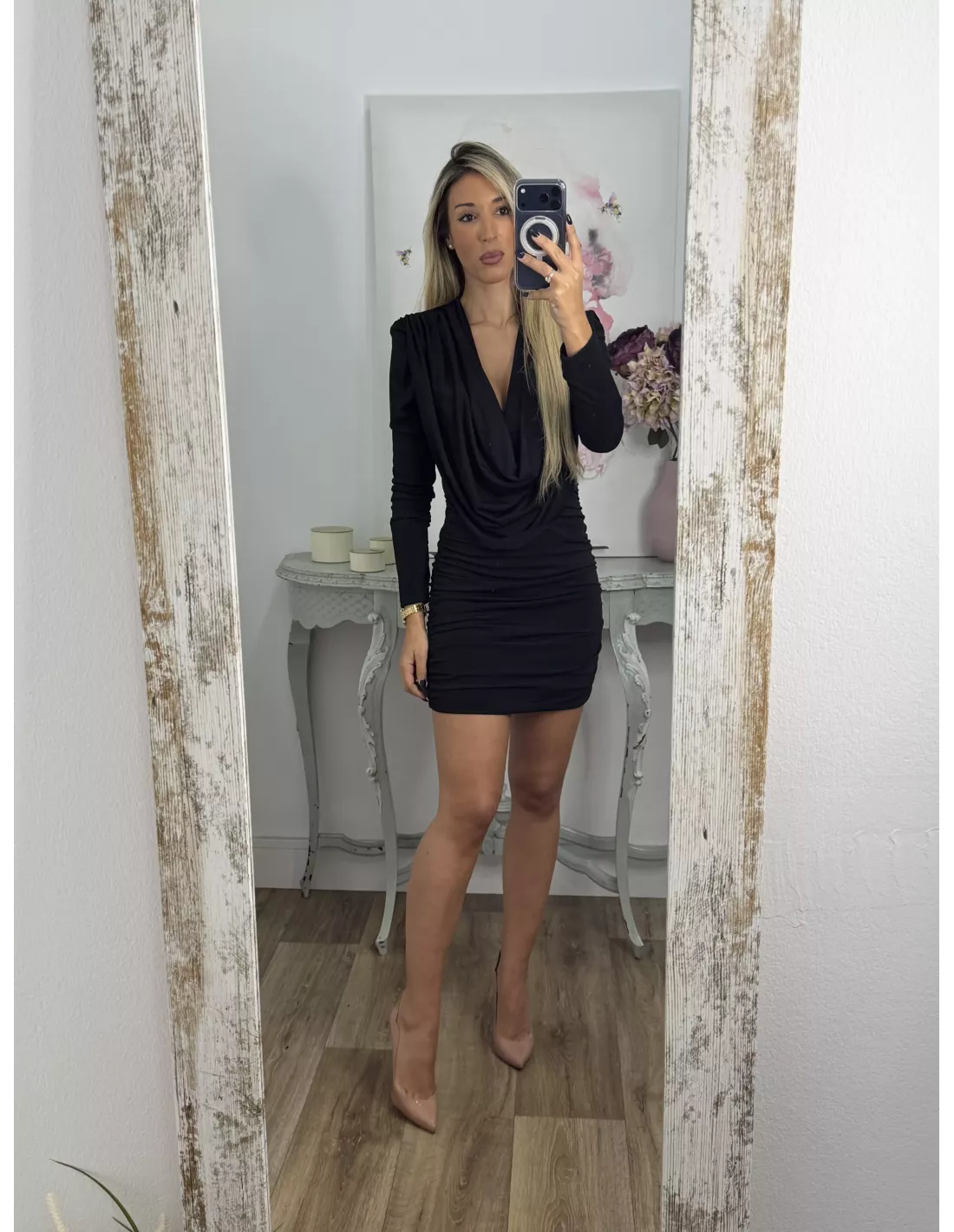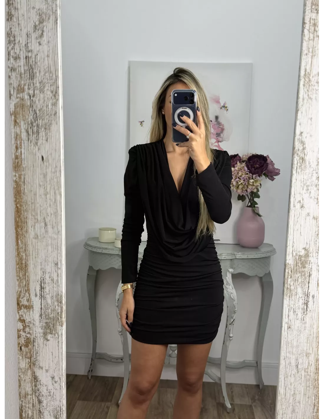 Vestido de licra de corte ajustado y corto. La zona de la falda va fruncida, tiene hombreras. La zona del escote es tipo cascada que va cosida a los hombros. Va completamente forrado.