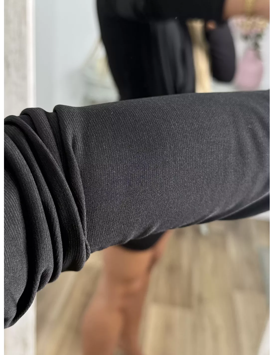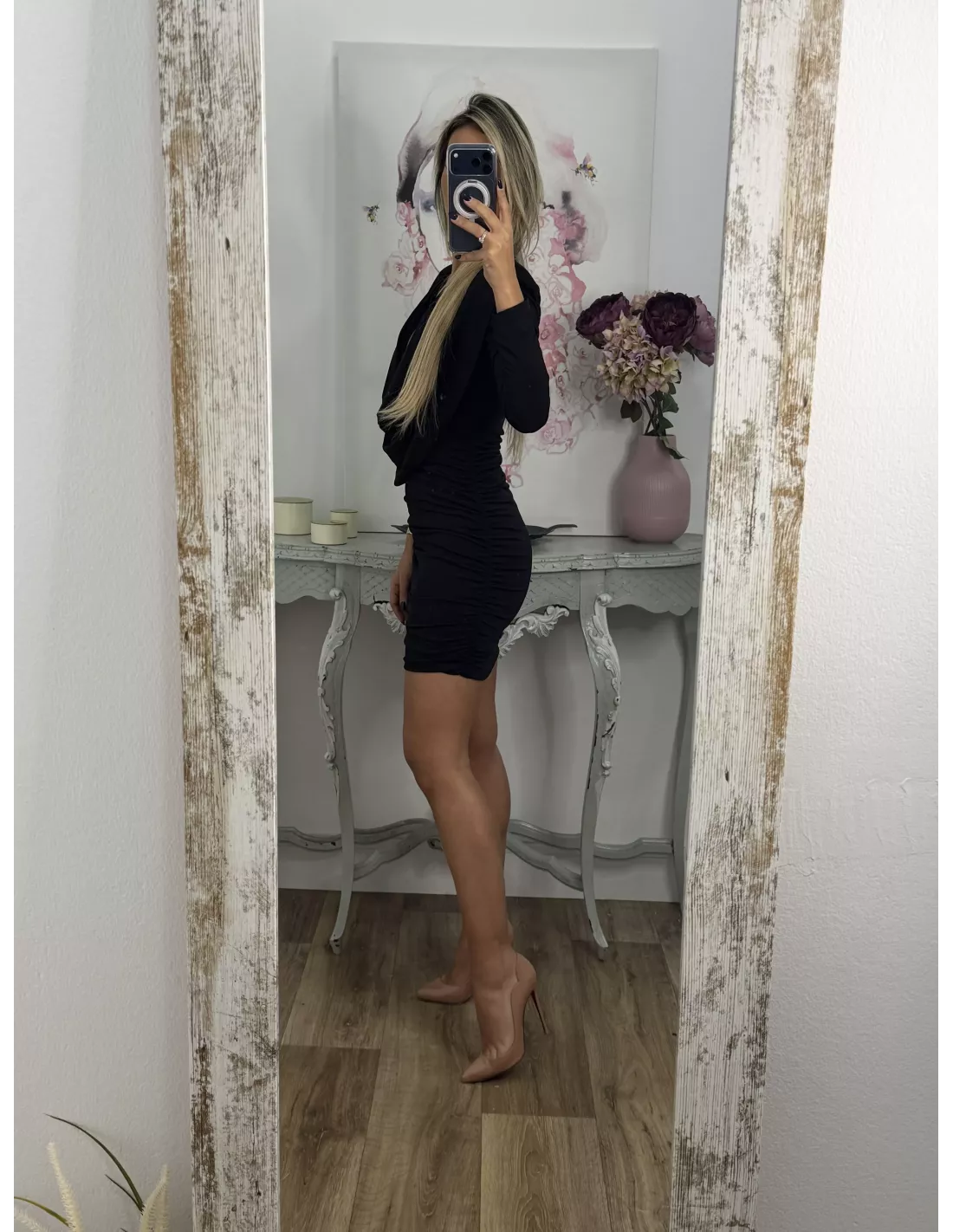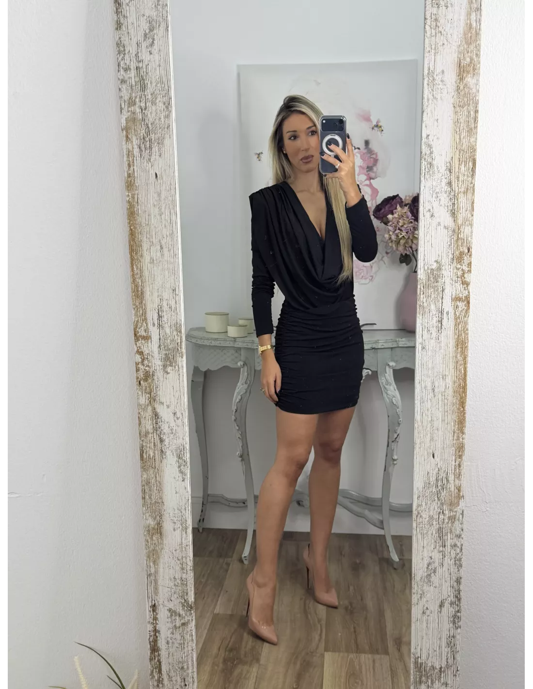 Vestido de licra de corte ajustado y corto. La zona de la falda va fruncida, tiene hombreras. La zona del escote es tipo cascada que va cosida a los hombros. Va completamente forrado.
