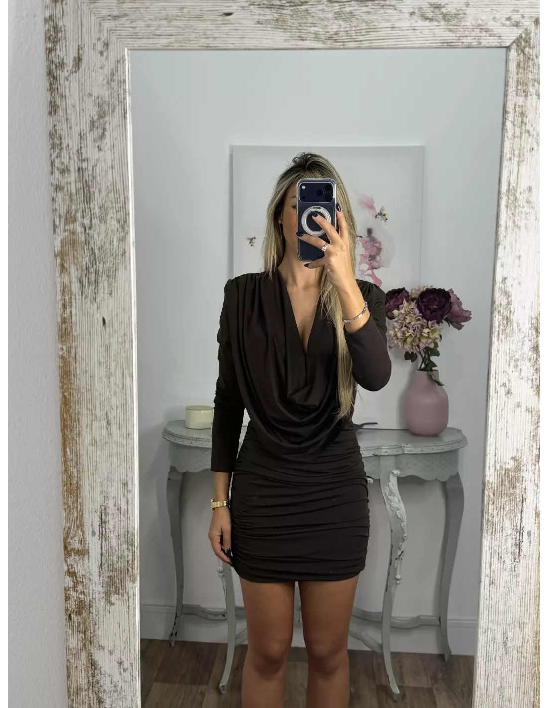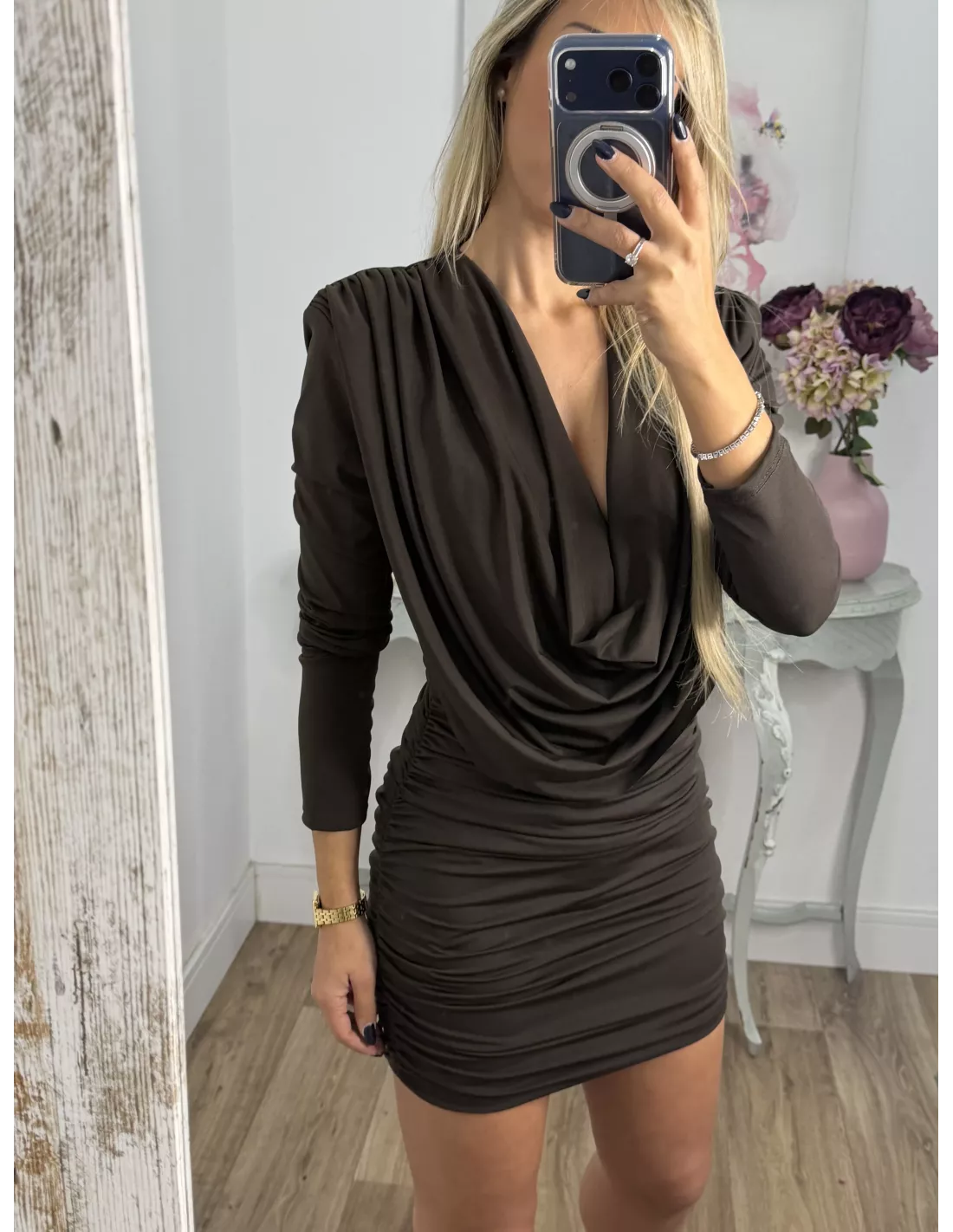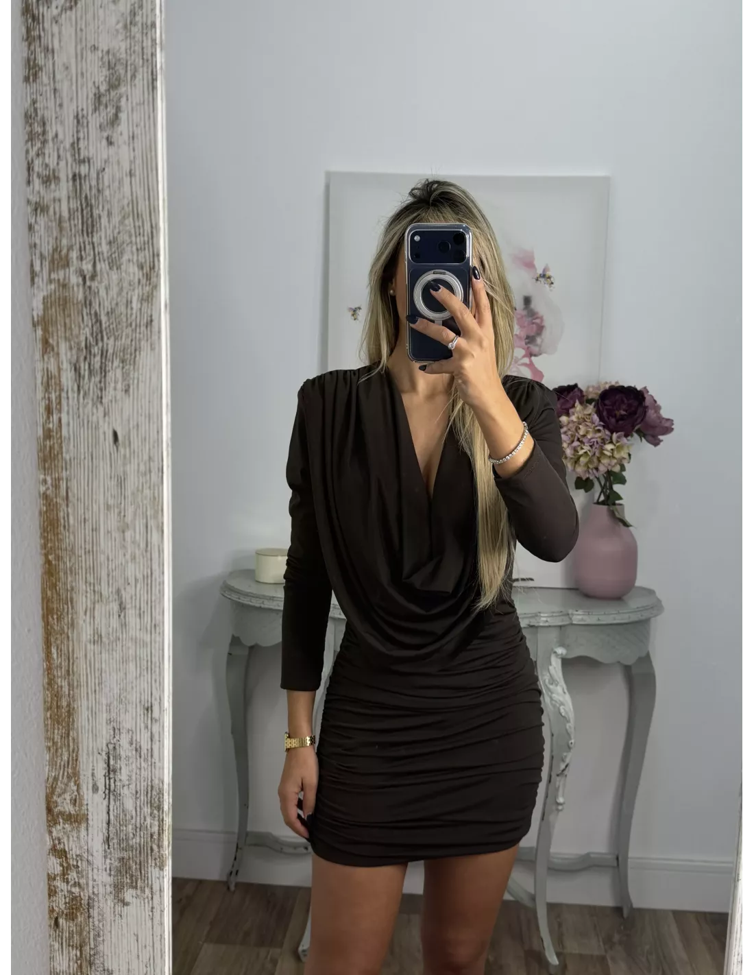 Vestido de licra de corte ajustado y corto. La zona de la falda va fruncida, tiene hombreras. La zona del escote es tipo cascada que va cosida a los hombros. Va completamente forrado.