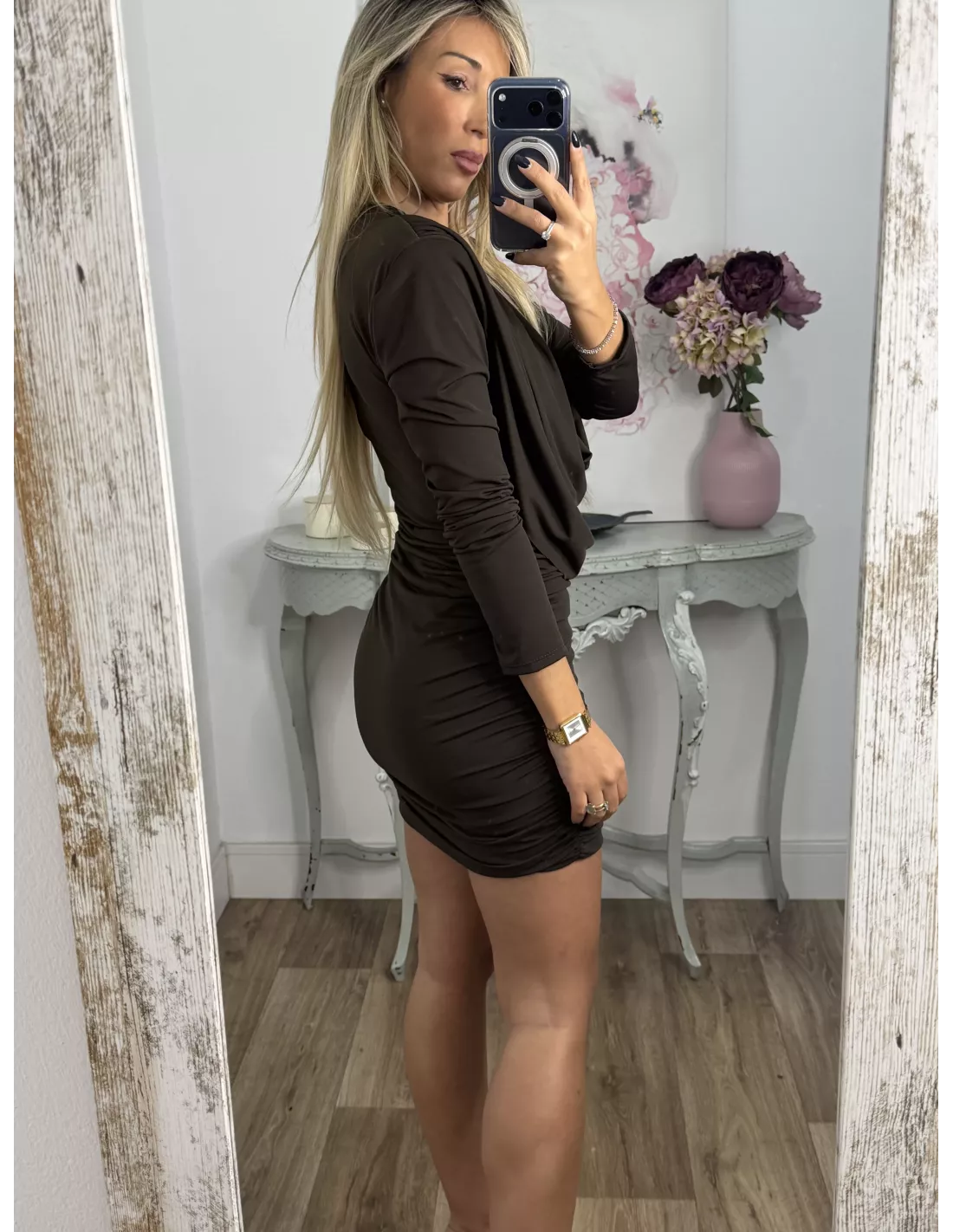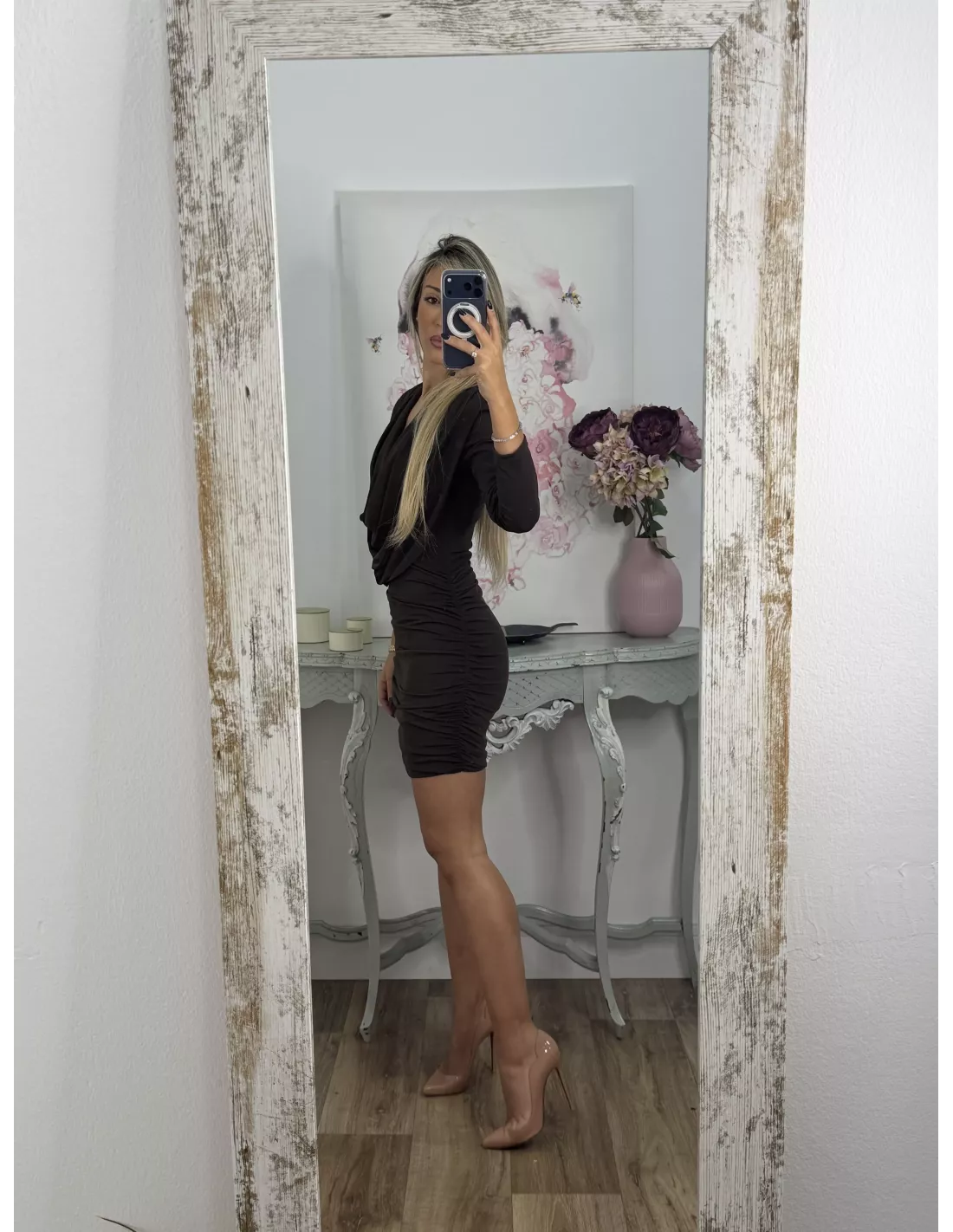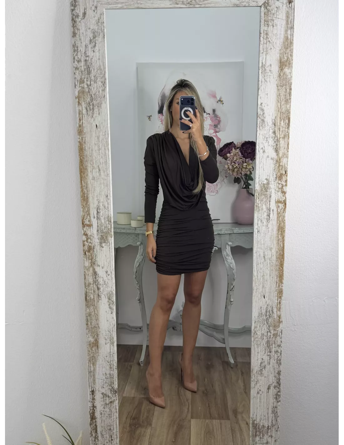 Vestido de licra de corte ajustado y corto. La zona de la falda va fruncida, tiene hombreras. La zona del escote es tipo cascada que va cosida a los hombros. Va completamente forrado.
