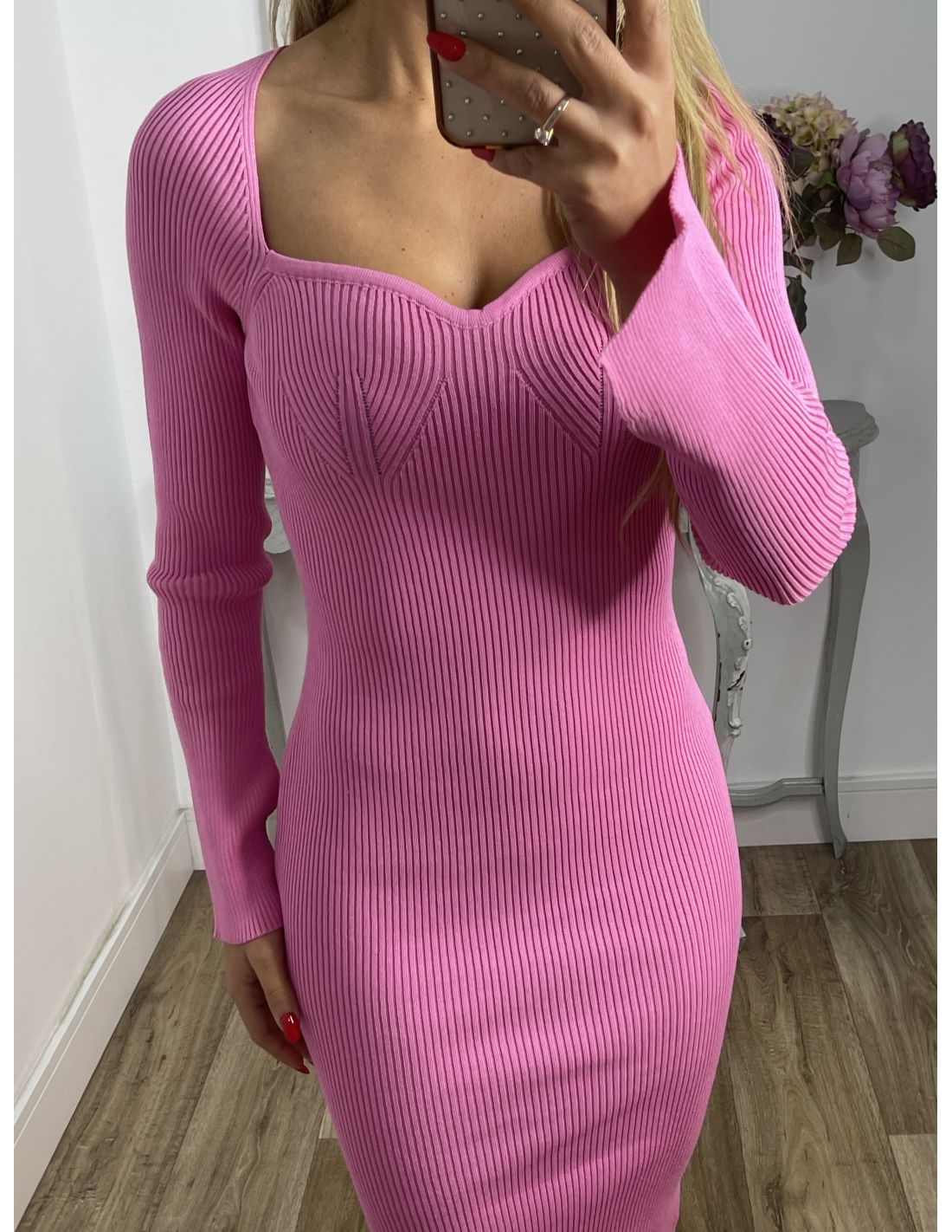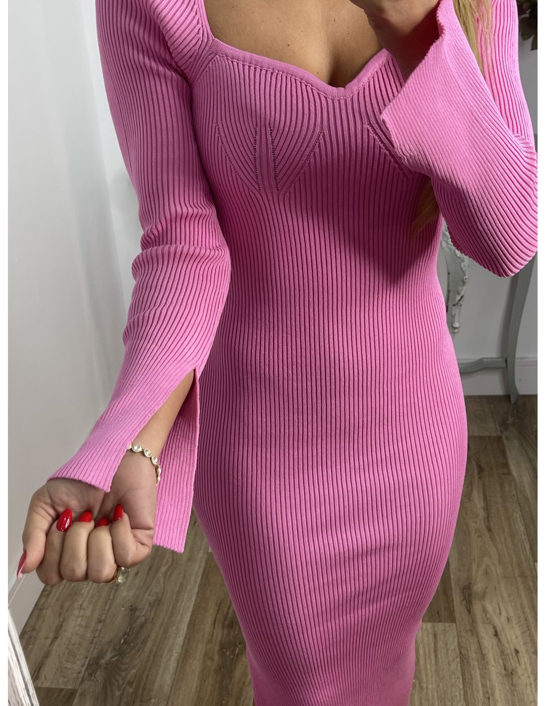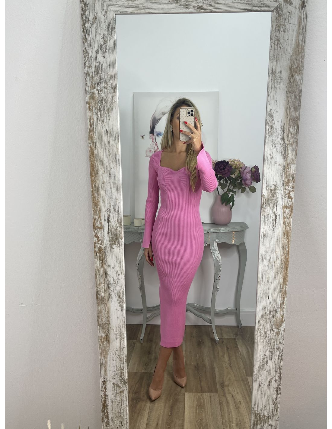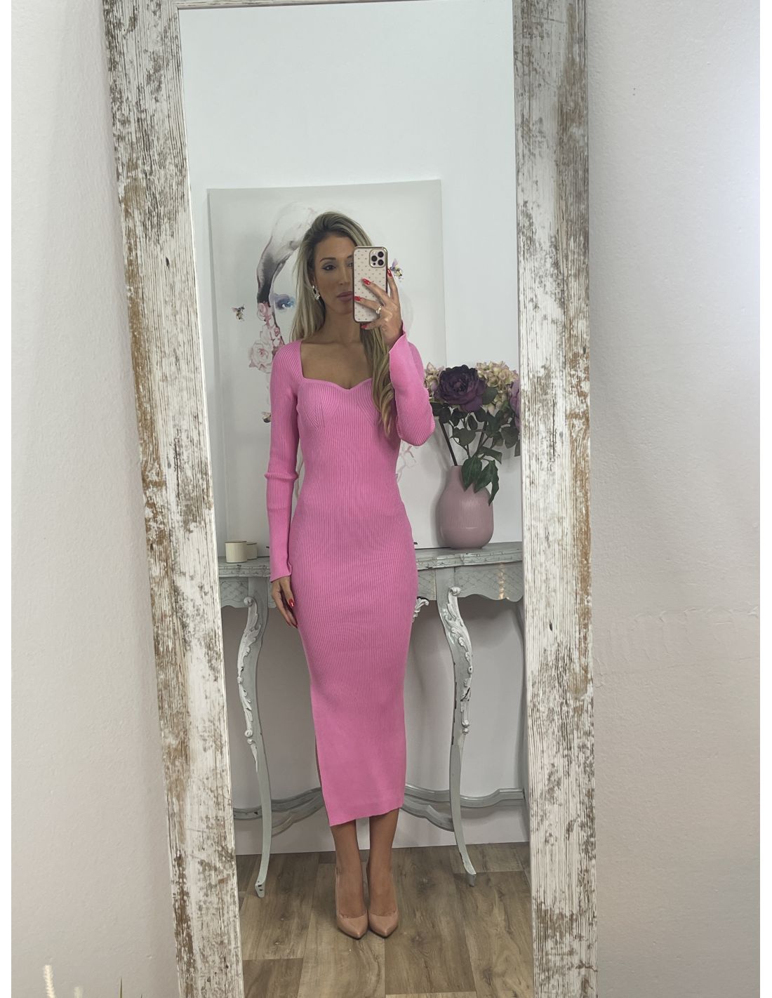 Vestido punto de canalé, el corte es ceñido. No va forrado, de manga larga y al final de la manga lleva una abertura. La zona del escote hace forma corazón. Tiene abertura en el lateral por la costura.