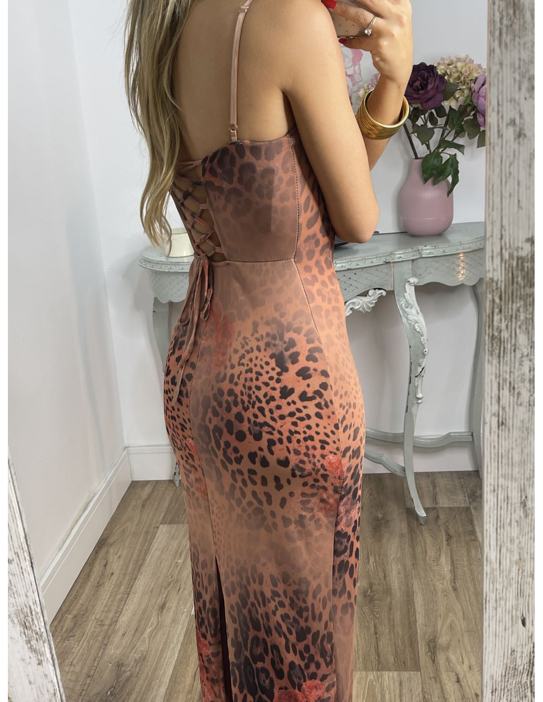 Vestido de tejido tul de punto. El tejido de fiera es tul y punto debajo. Lleva tiranta regulable. Tiene copas. El corte es ajustado. La parte de atrás escote en la espalda. Lleva raja en la parte de atrás.