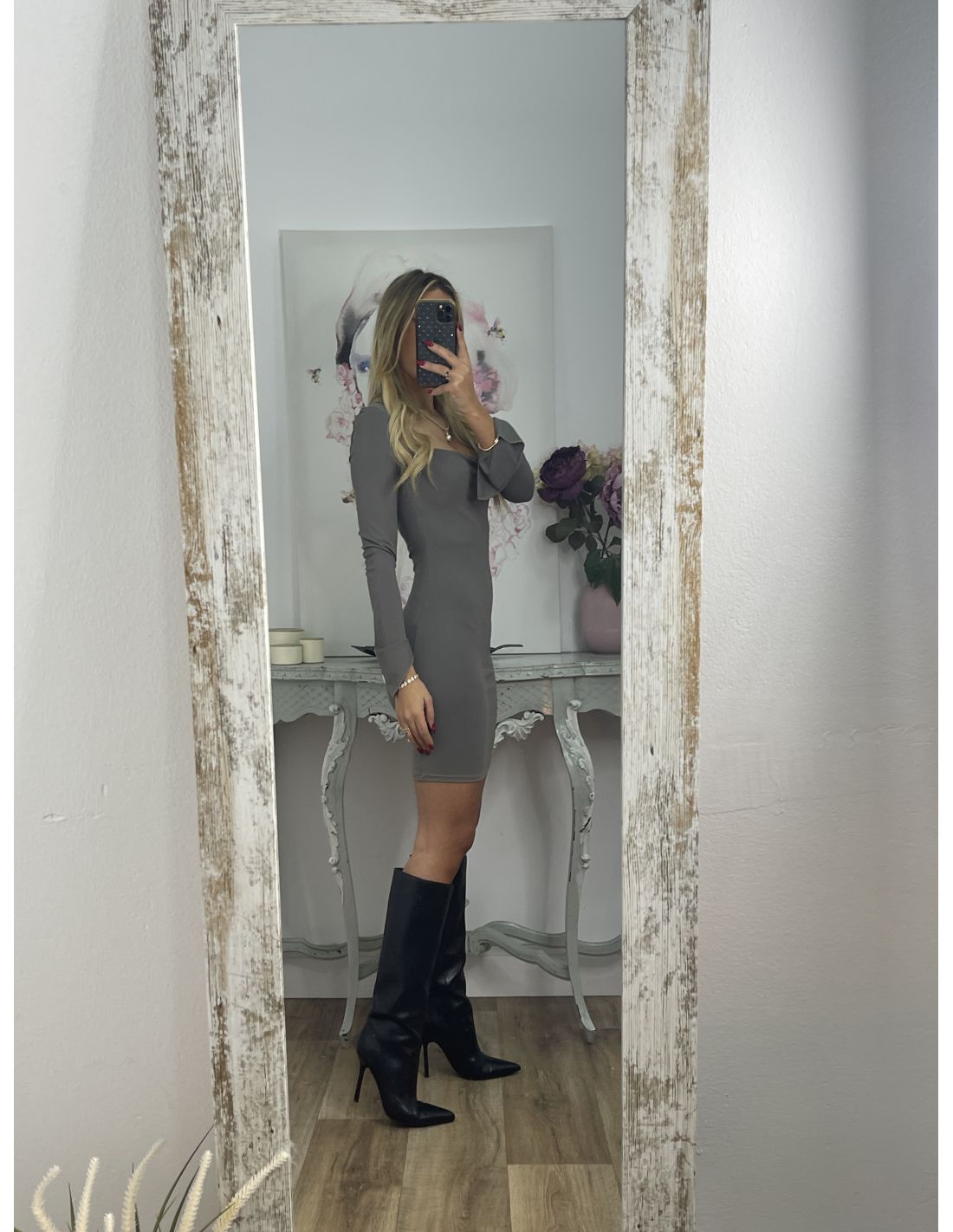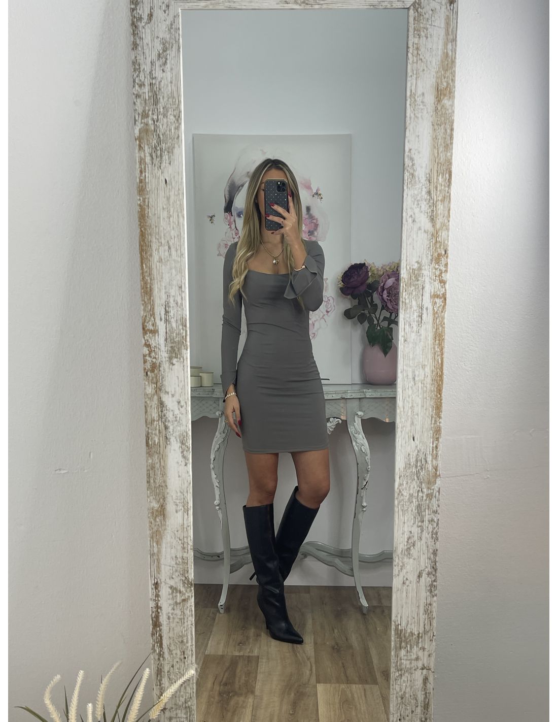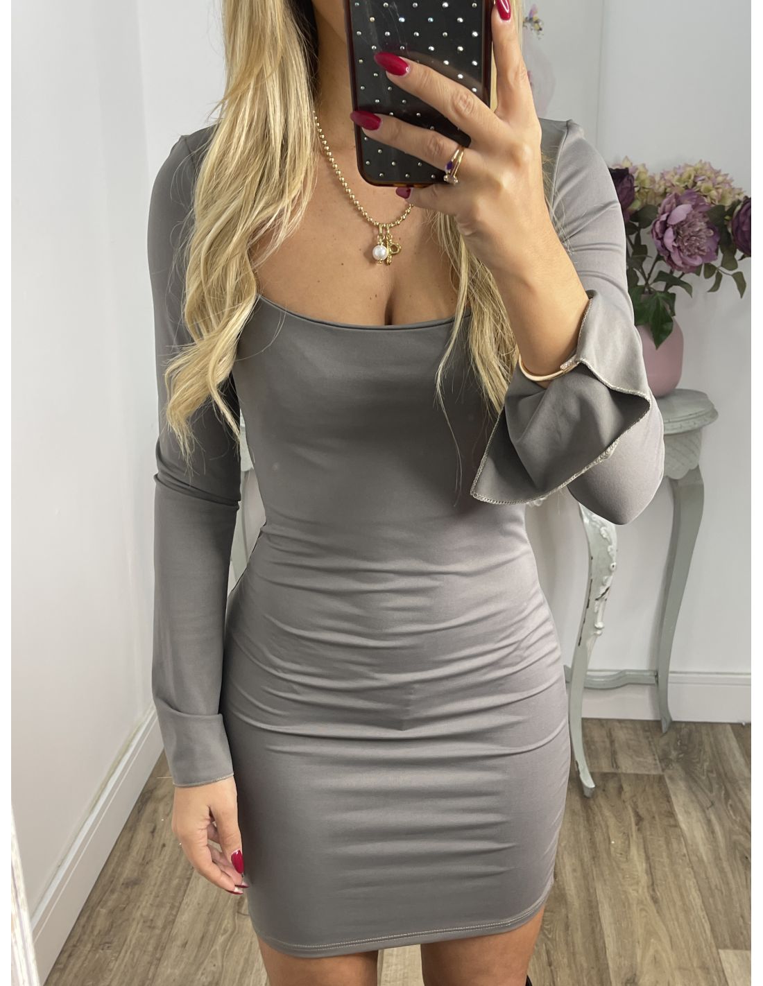 Vestido de licra con escote cuadrado de corte ajustado. No va forrado. De manga larga y en la zona del puño lleva una abertura.