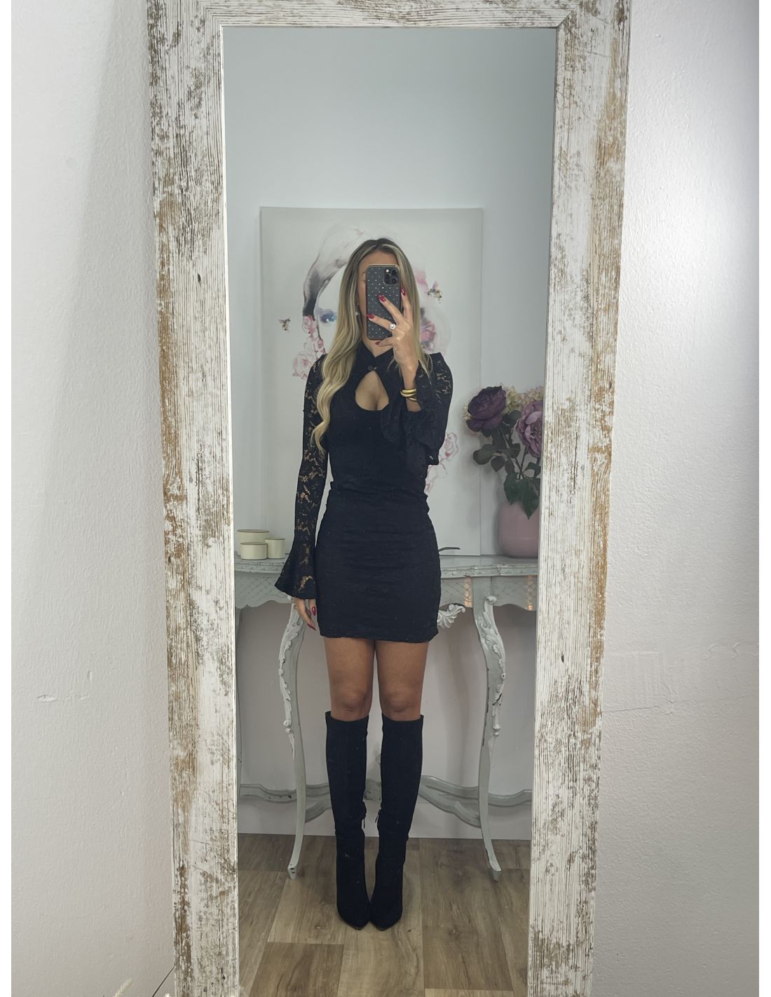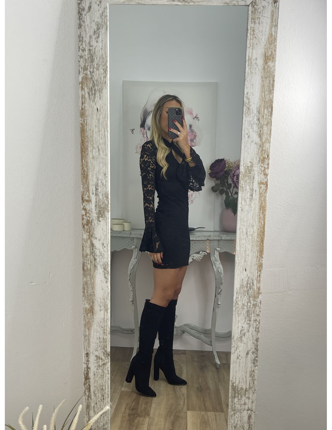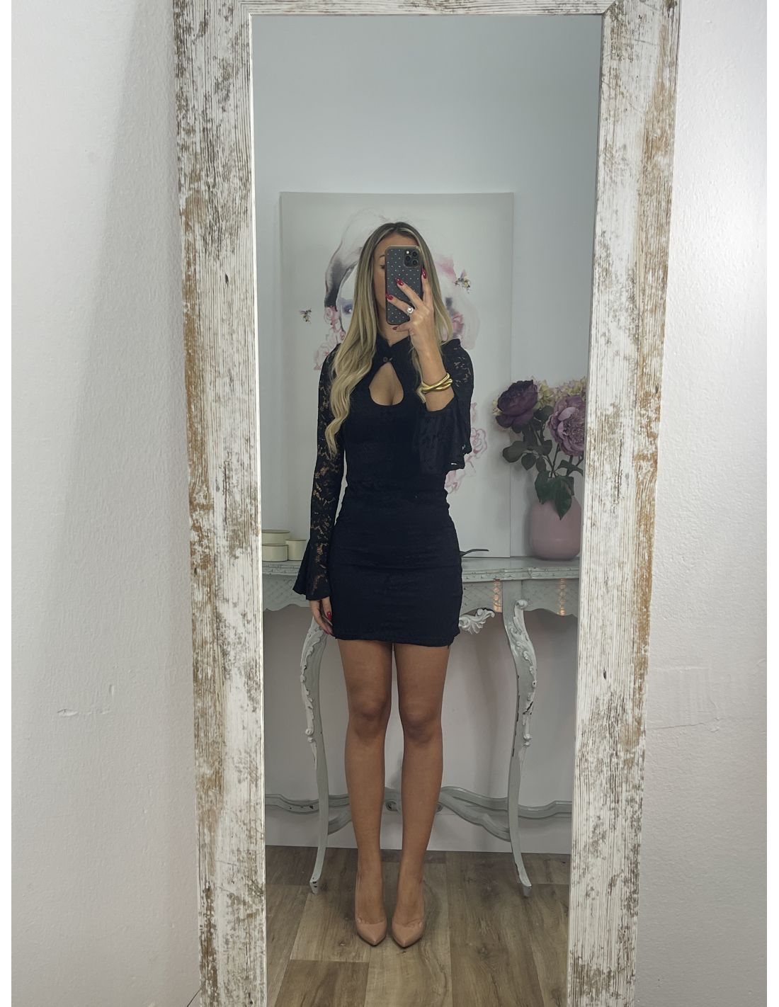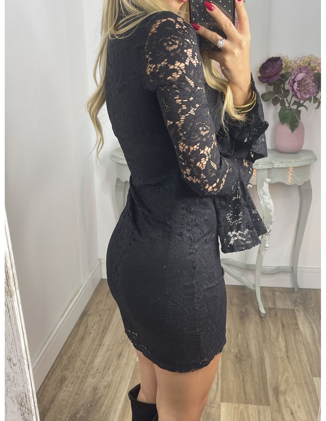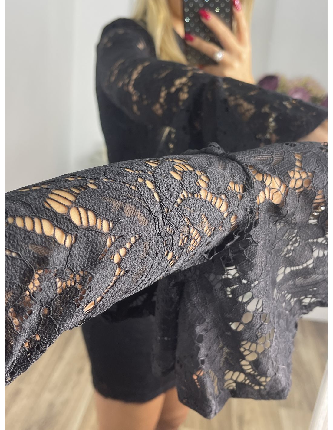 Vestido de corte ajustado con escote en la zona delantera cuello Mao, que se cierra con un botón y mangas de corte acampanado. El tejido es una puntilla de punto que estira y va forrado a excepción de las mangas.
