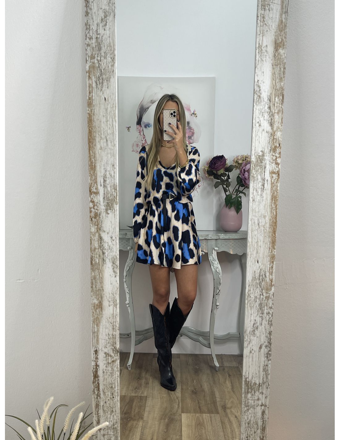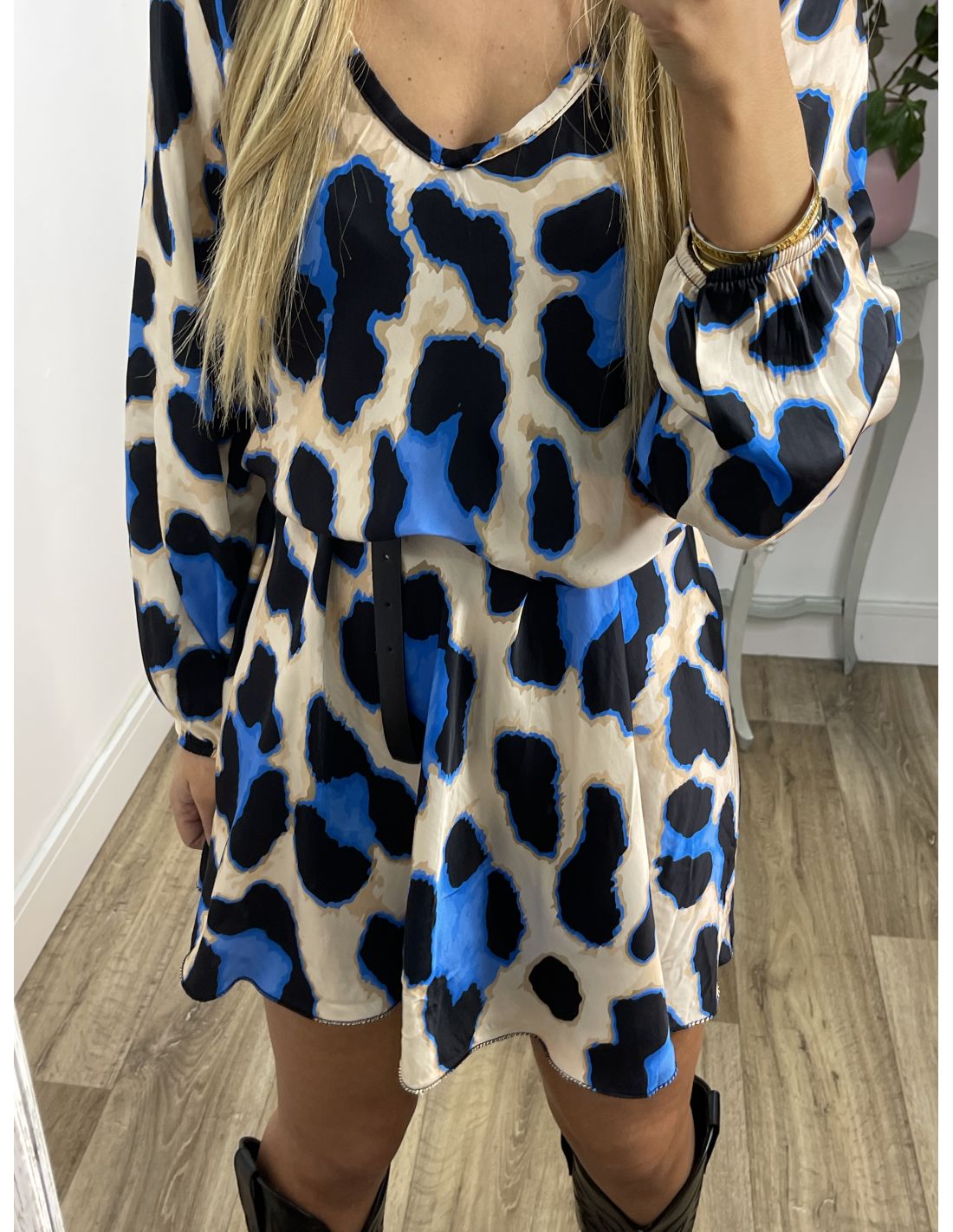 Vestido de tejido satinado con estampado de animal print. Con escote de pico. El corte es suelto.
