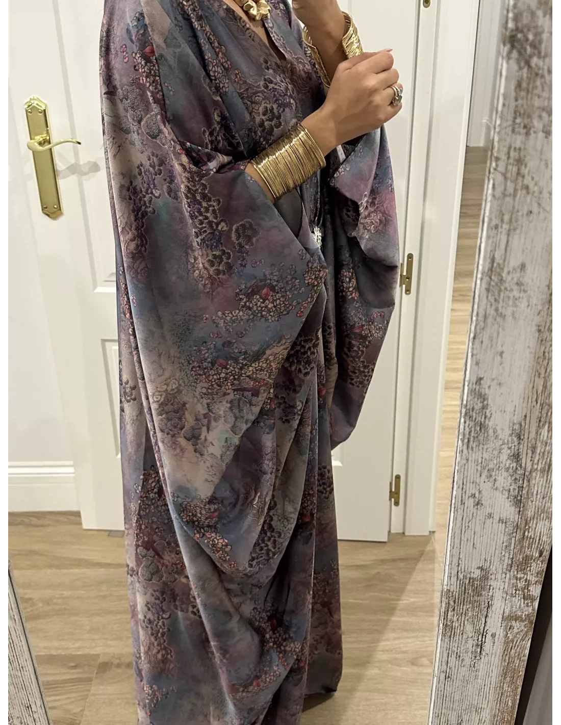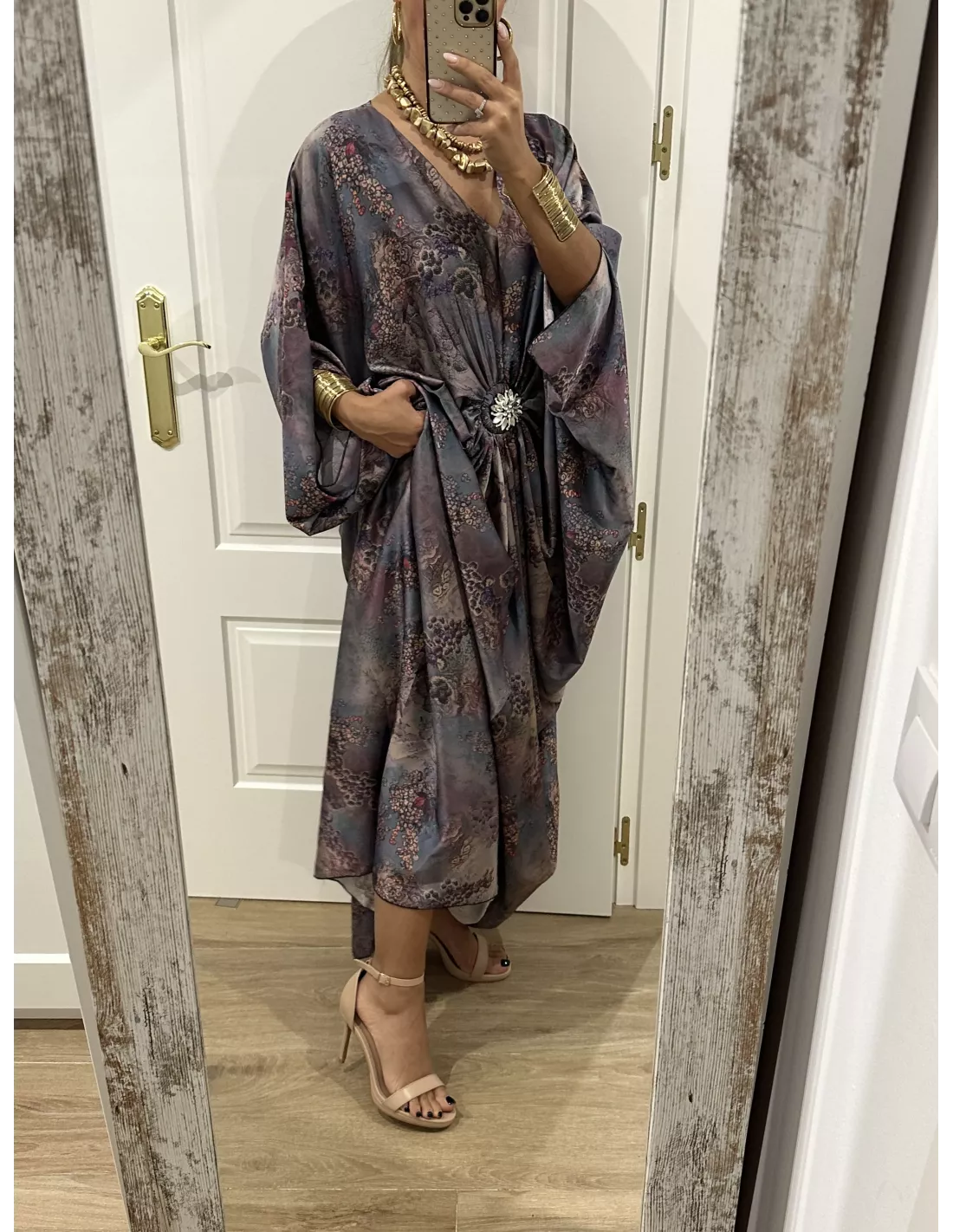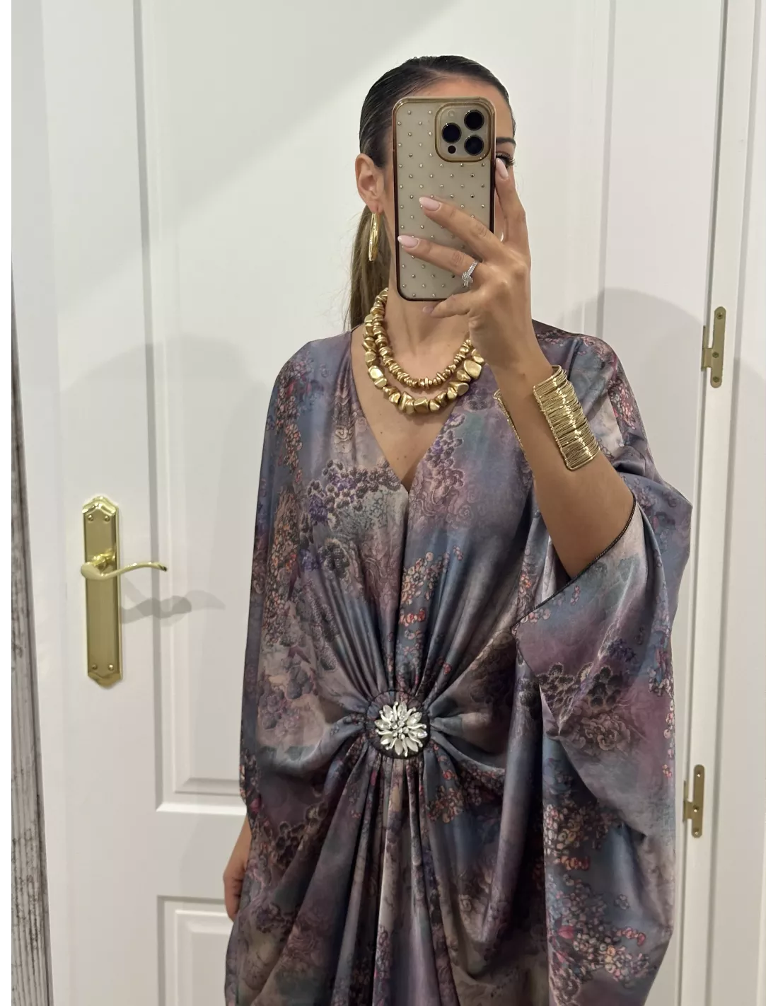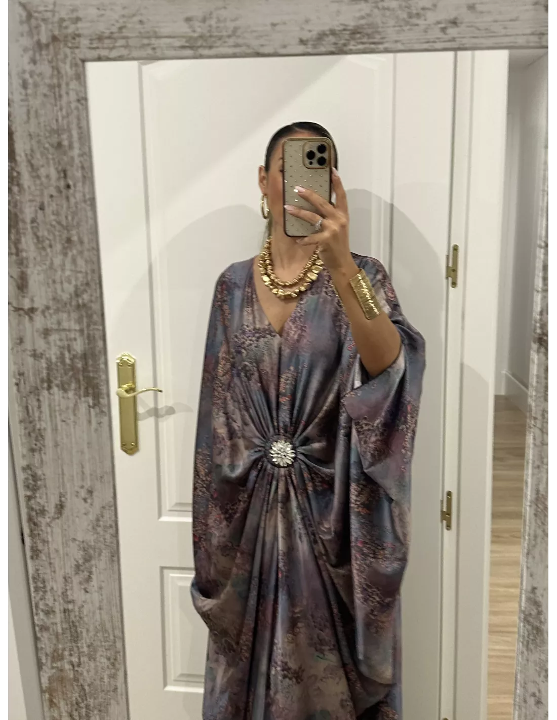 Vestido de corte tipo túnica, que lleva un broche en el centro (se puede quitar). Es de corte suelto, no marca ni se transparenta.